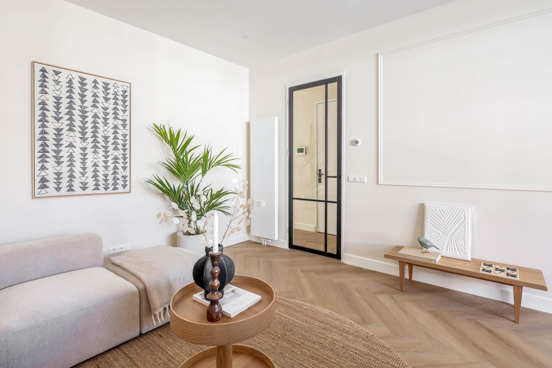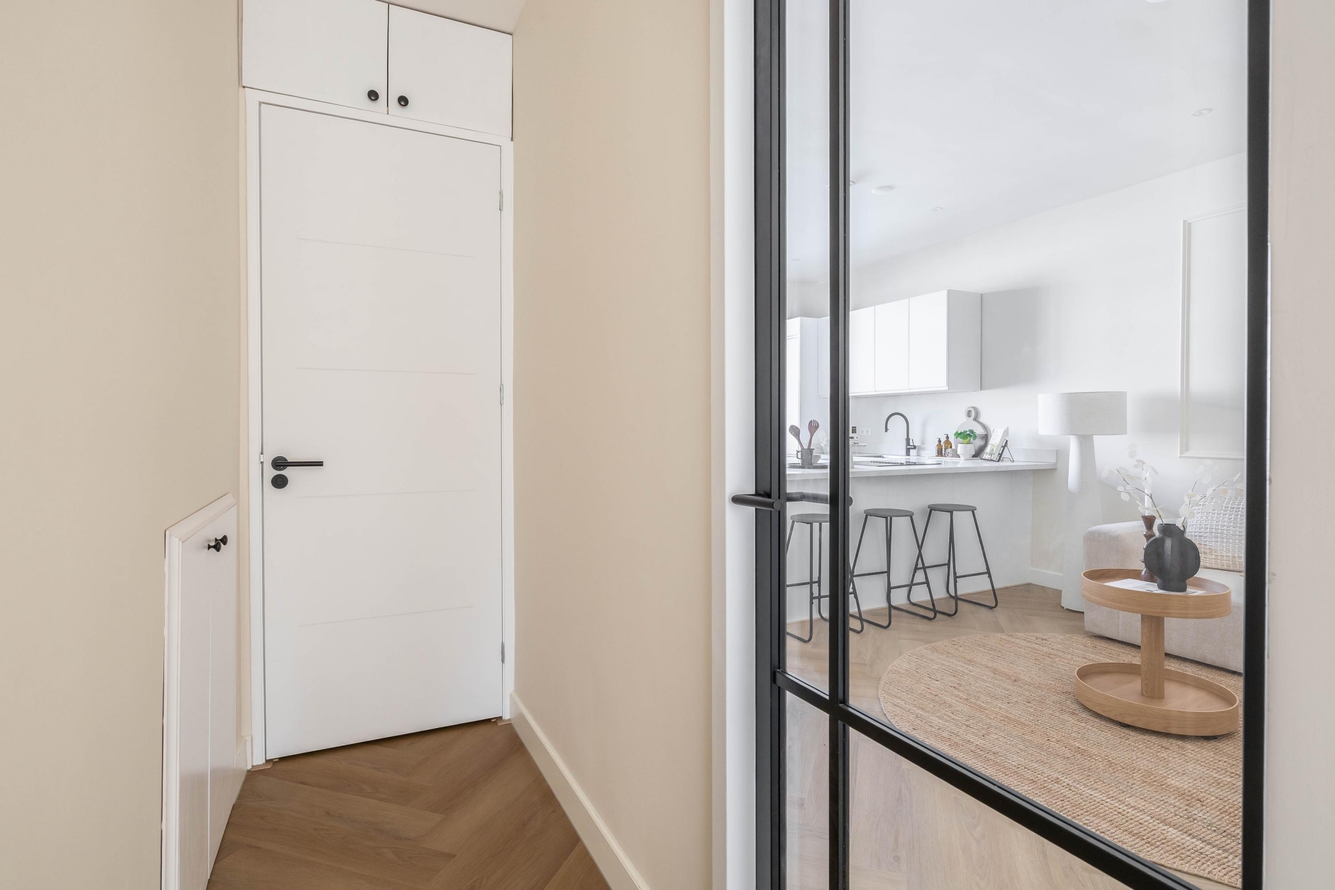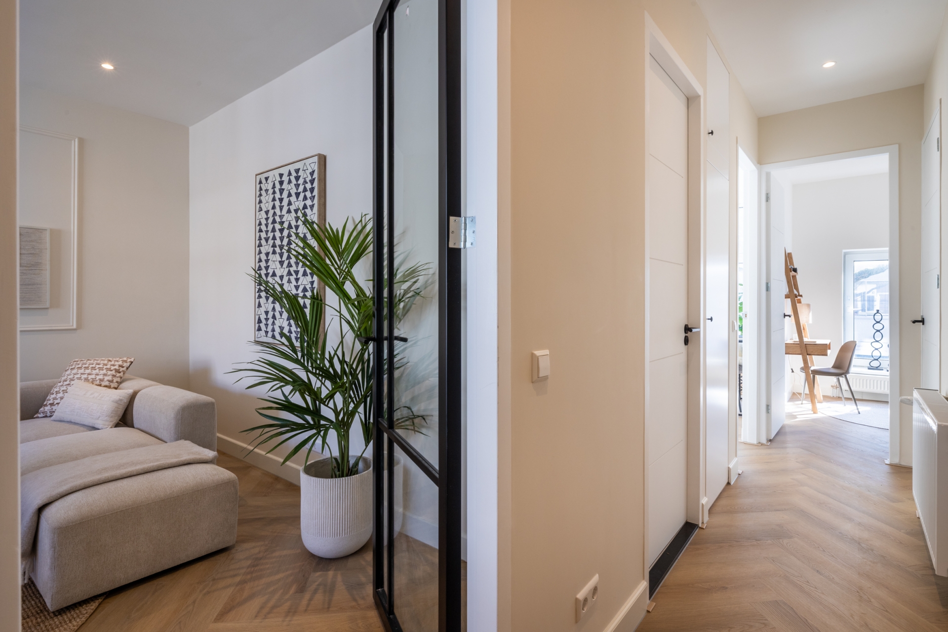 De hal verbindt alle ruimtes op een rustige en praktische manier.