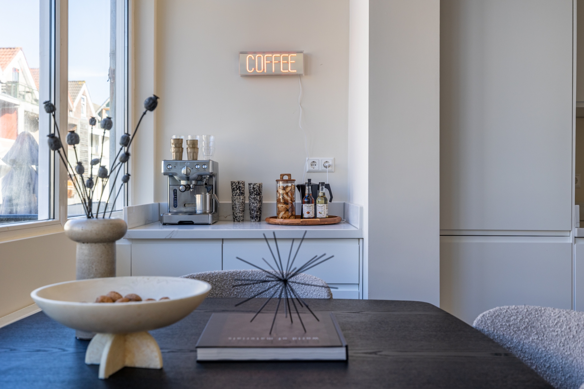 De keuken vormt het hart van de woning. Uitgevoerd met een royaal werkblad dat tevens fungeert als bar, waardoor koken en samenzijn moeiteloos samenkomen.