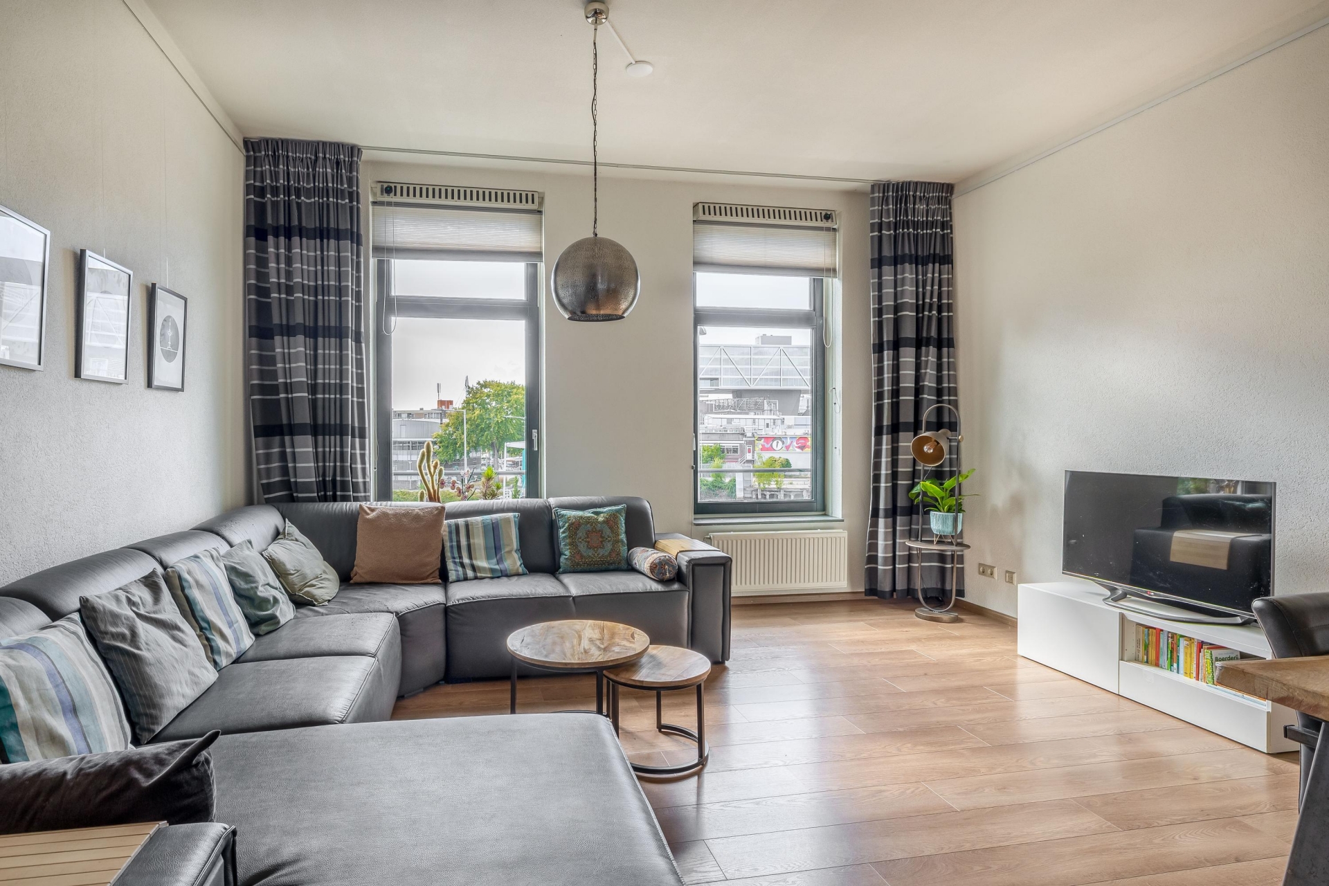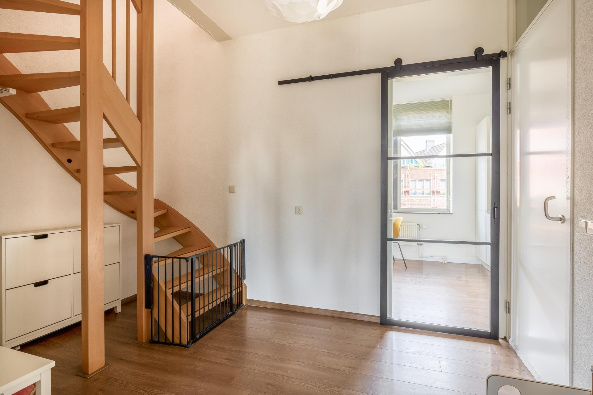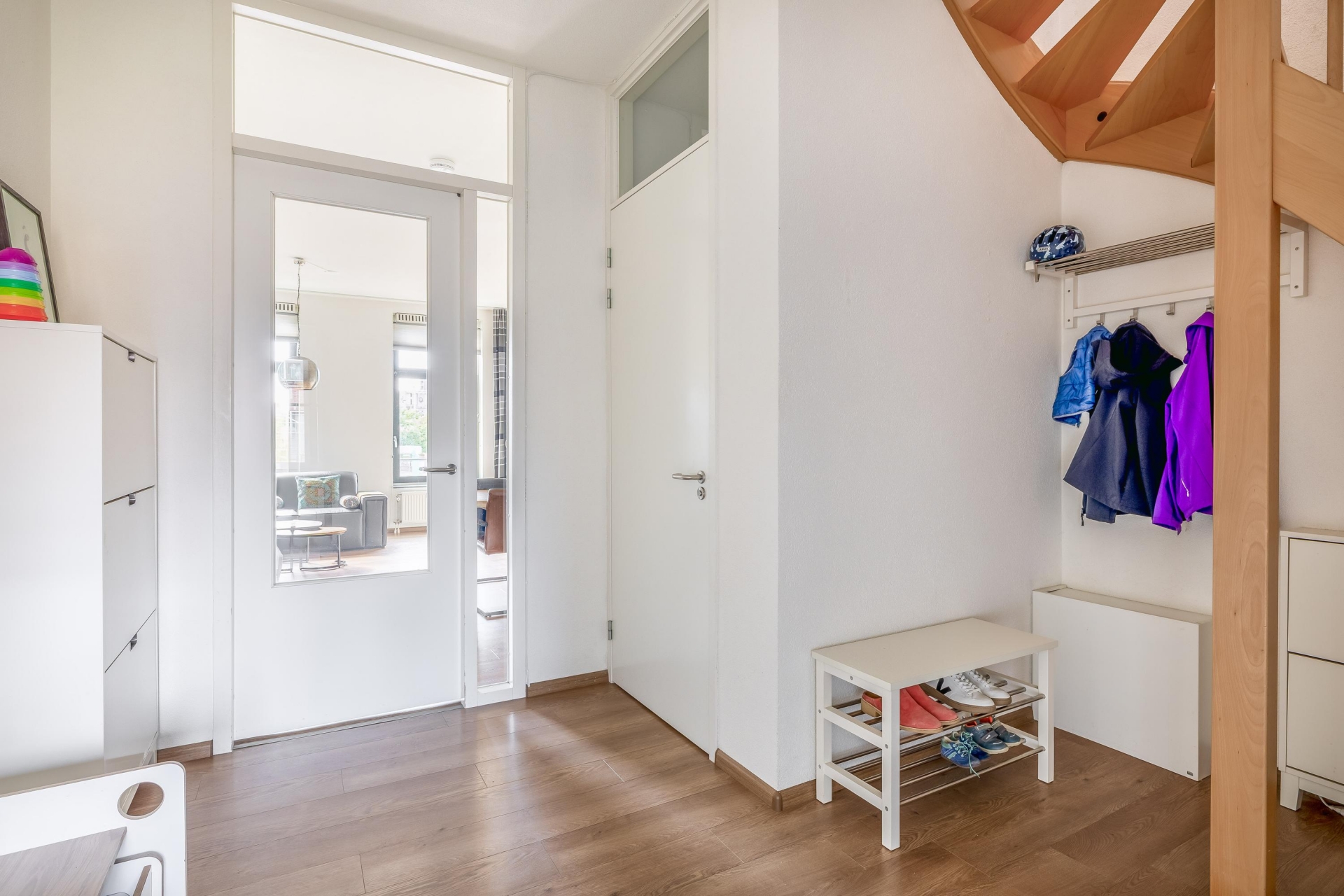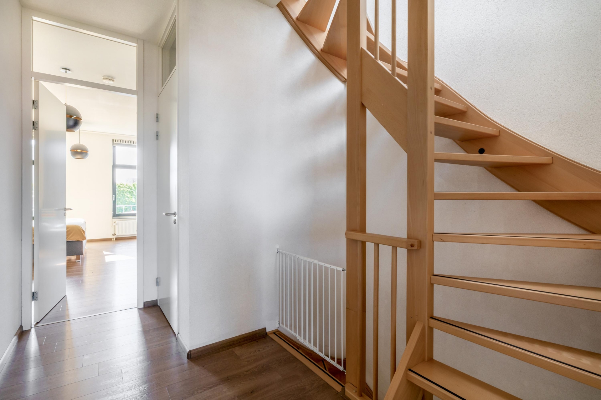 Dit appartement voelt als een volwaardig huis, verdeeld over drie lagen. Op de begane grond vind je een fijne entree met ruimte voor garderobe, waarna je via de trap de woonverdieping bereikt. De woonkamer is ruim en licht, met grote raampartijen en een prachtig zicht op het water.