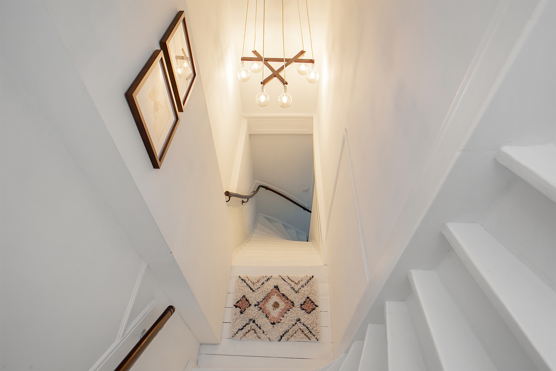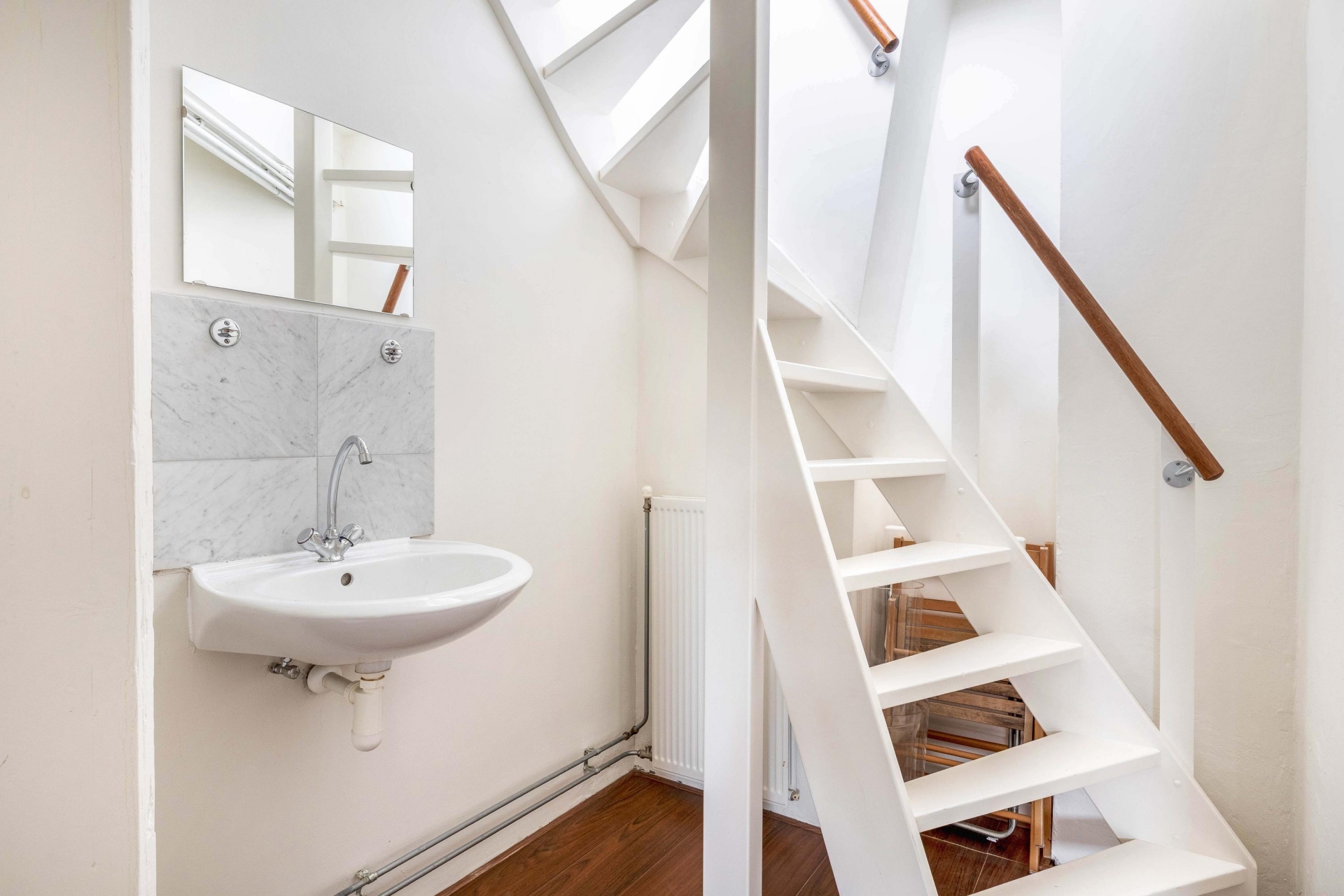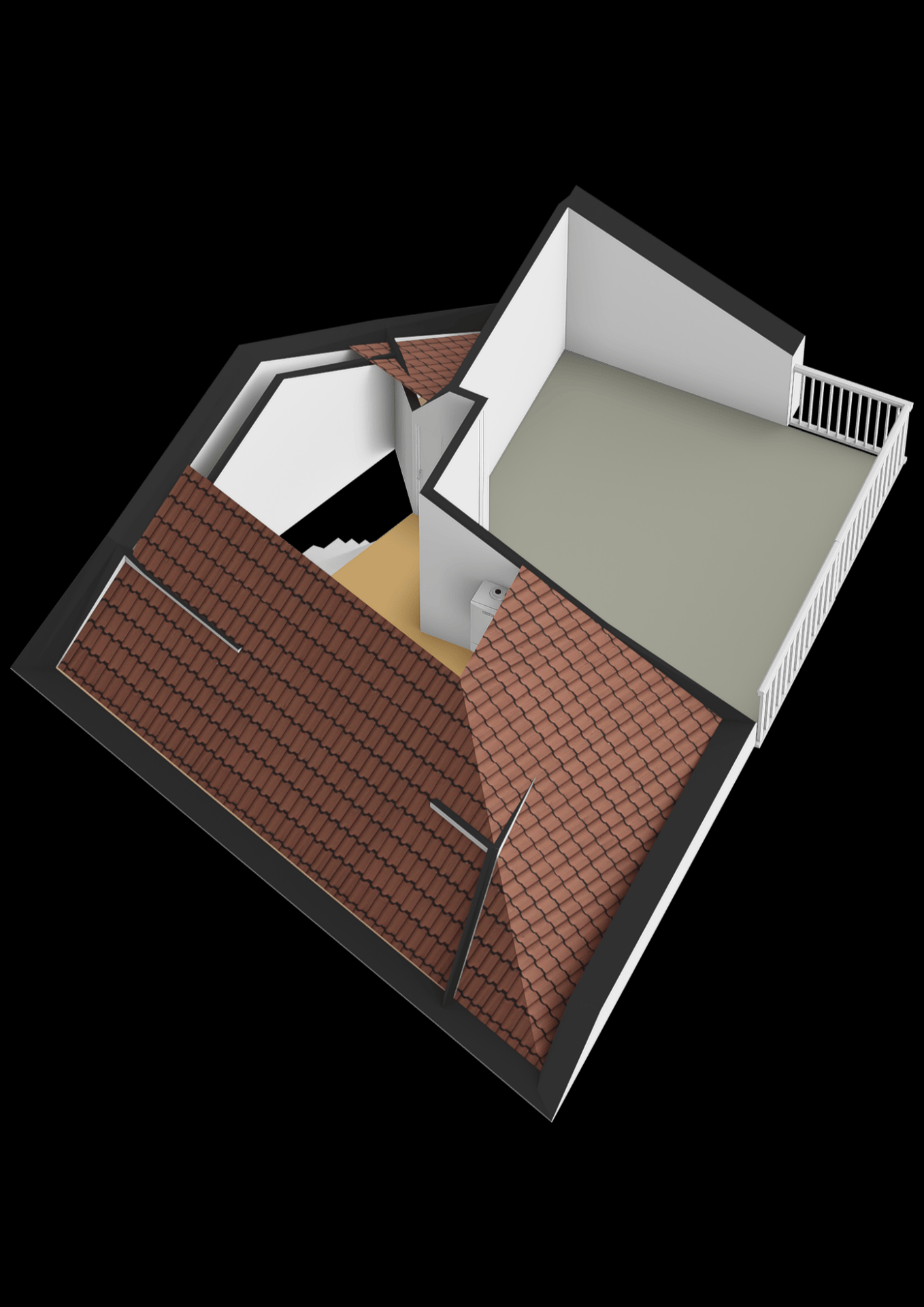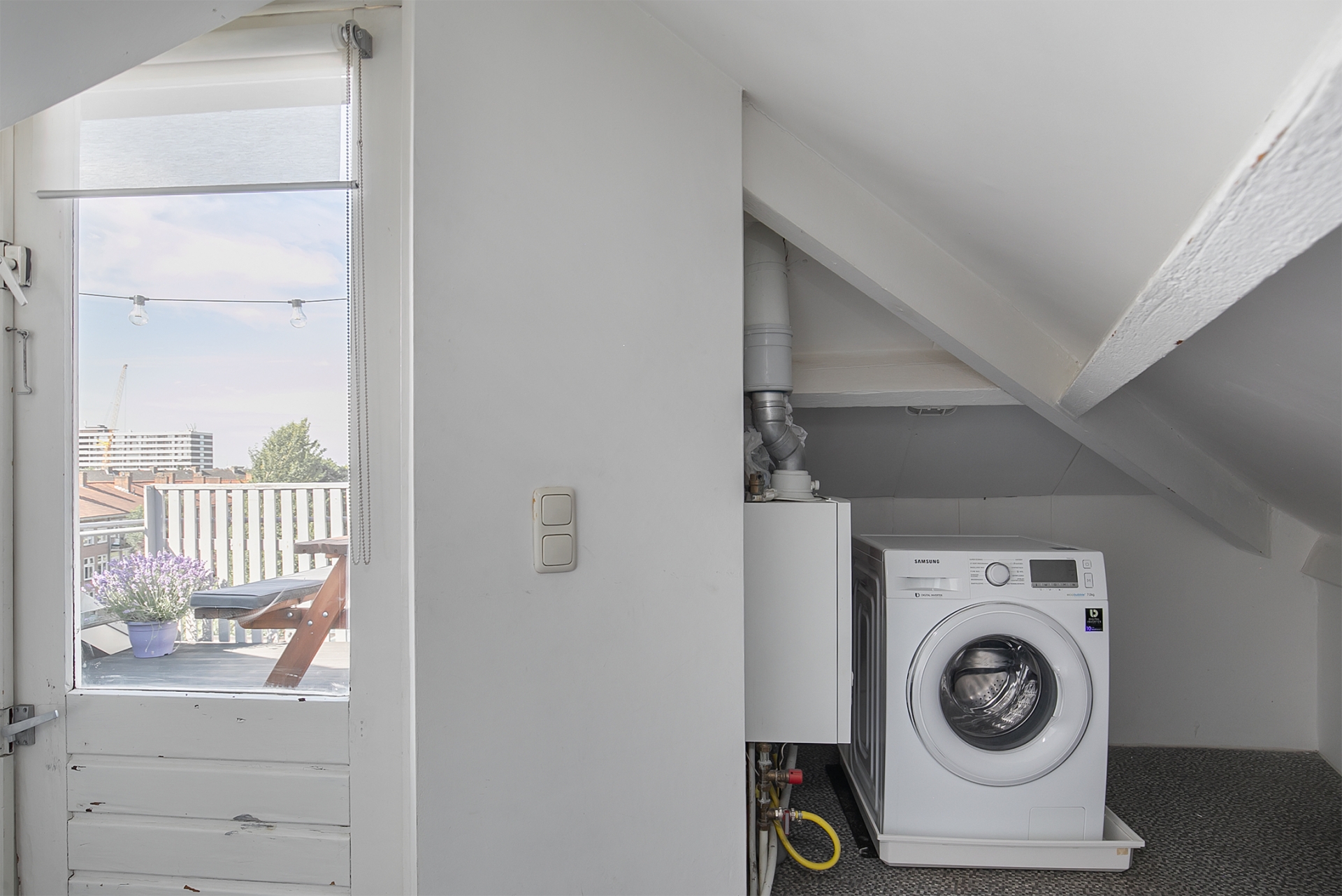 De vliering biedt nog meer opbergruimte, de aansluitingen voor de wasmachine en de ideale plek om was te drogen. Vanuit hier bereik je tevens de deur naar het dakterras.