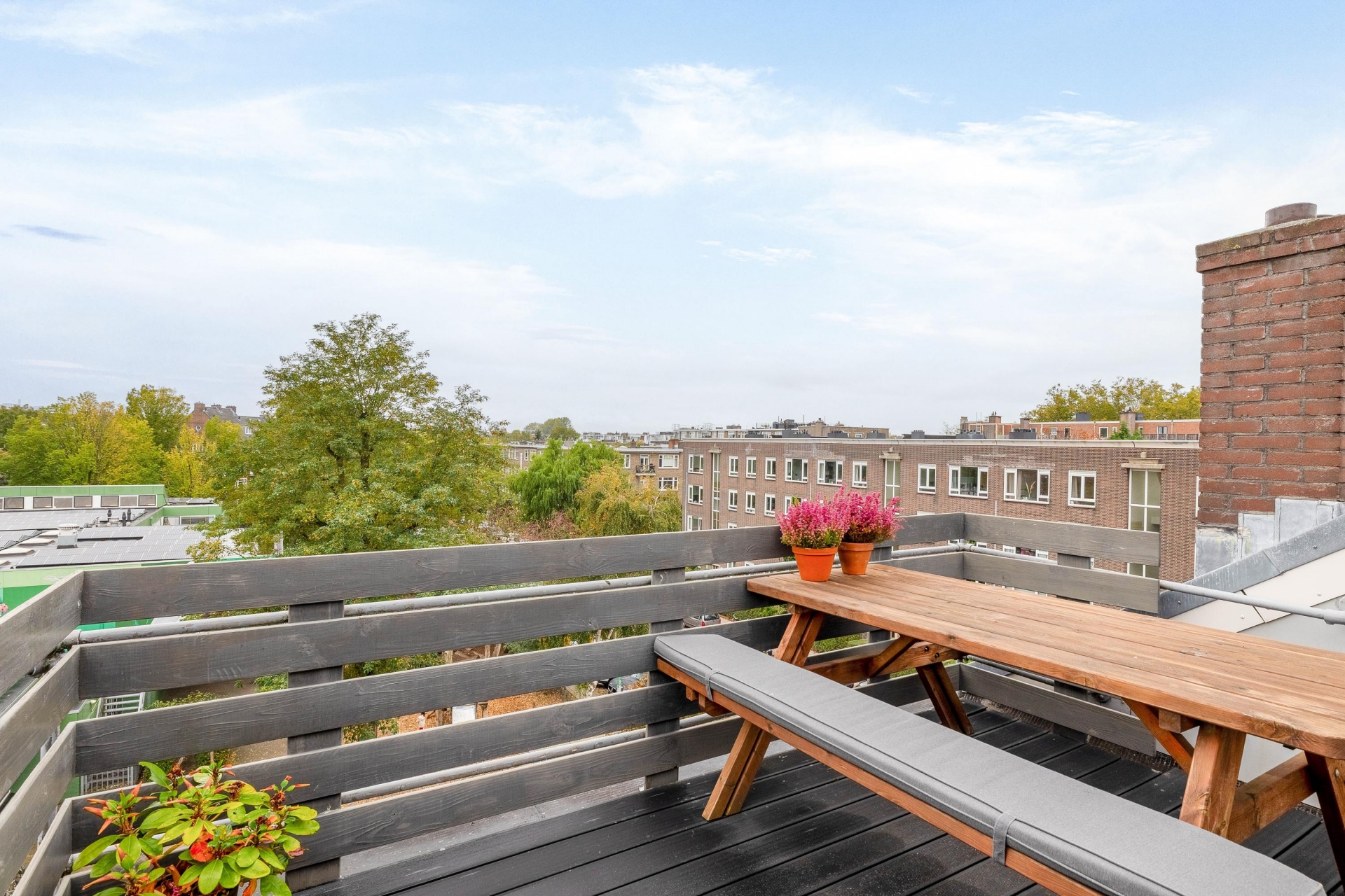 Zodra je boven komt, voel je het meteen: dit dakterras is uniek. Het is het enige terras in het pand en voelt daardoor als een privé-uitkijkpunt. Door de gunstige ligging op het westen en de beschutte positie kun je hier al vroeg in het jaar comfortabel buiten zitten. Van lange zomeravonden tot een snelle kop koffie in het voorjaarszonnetje - dit is een plek die echt elke dag plezier geeft.