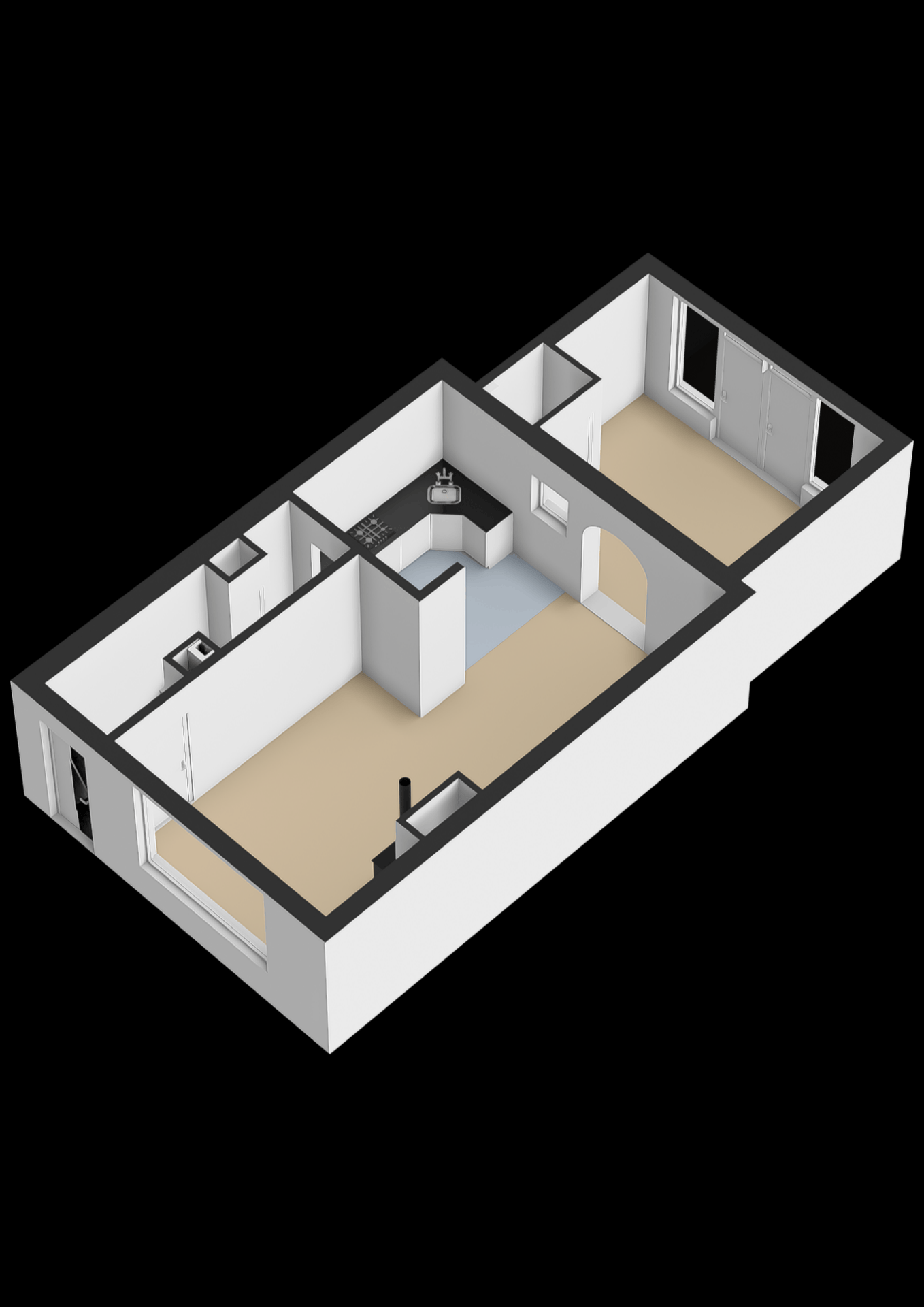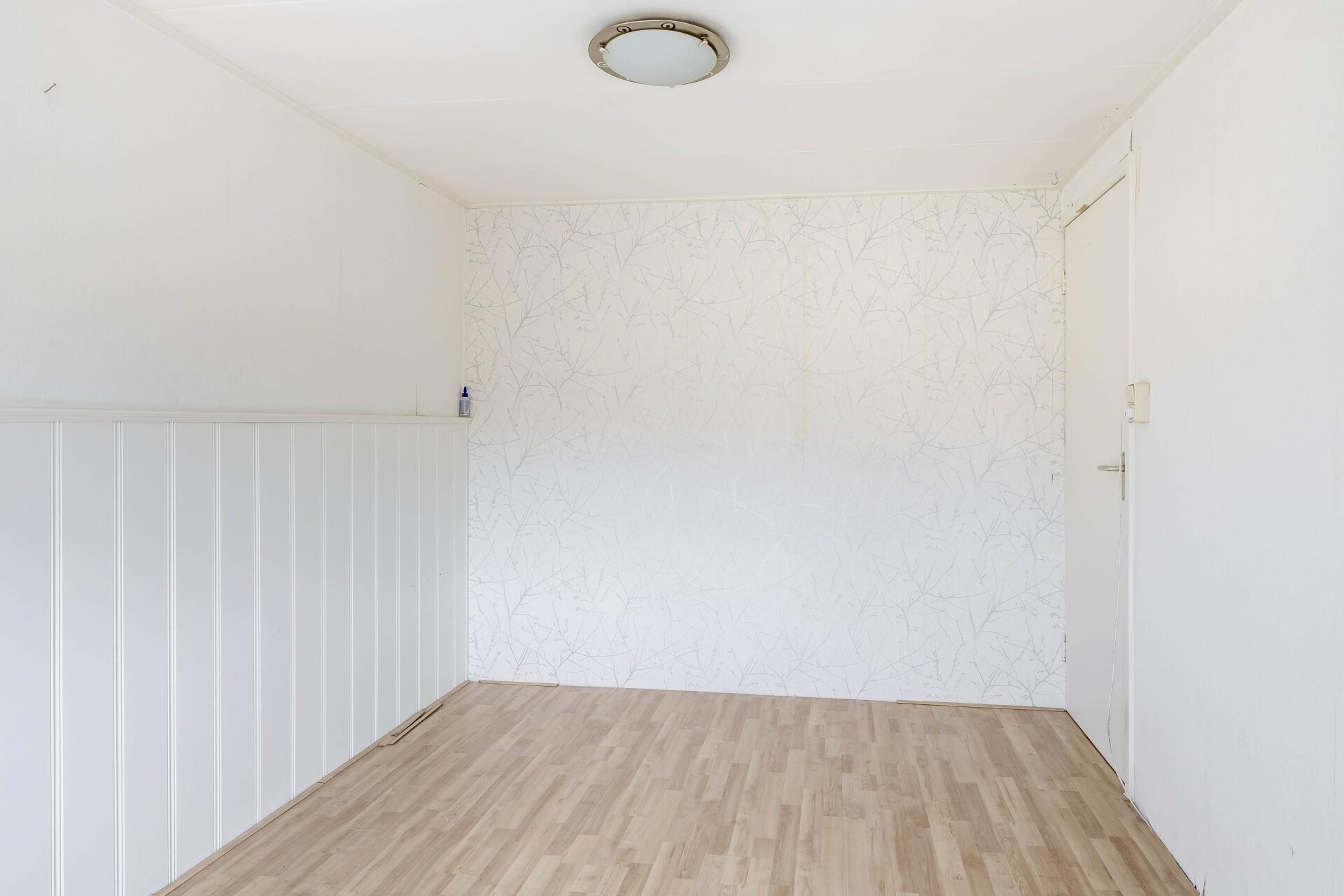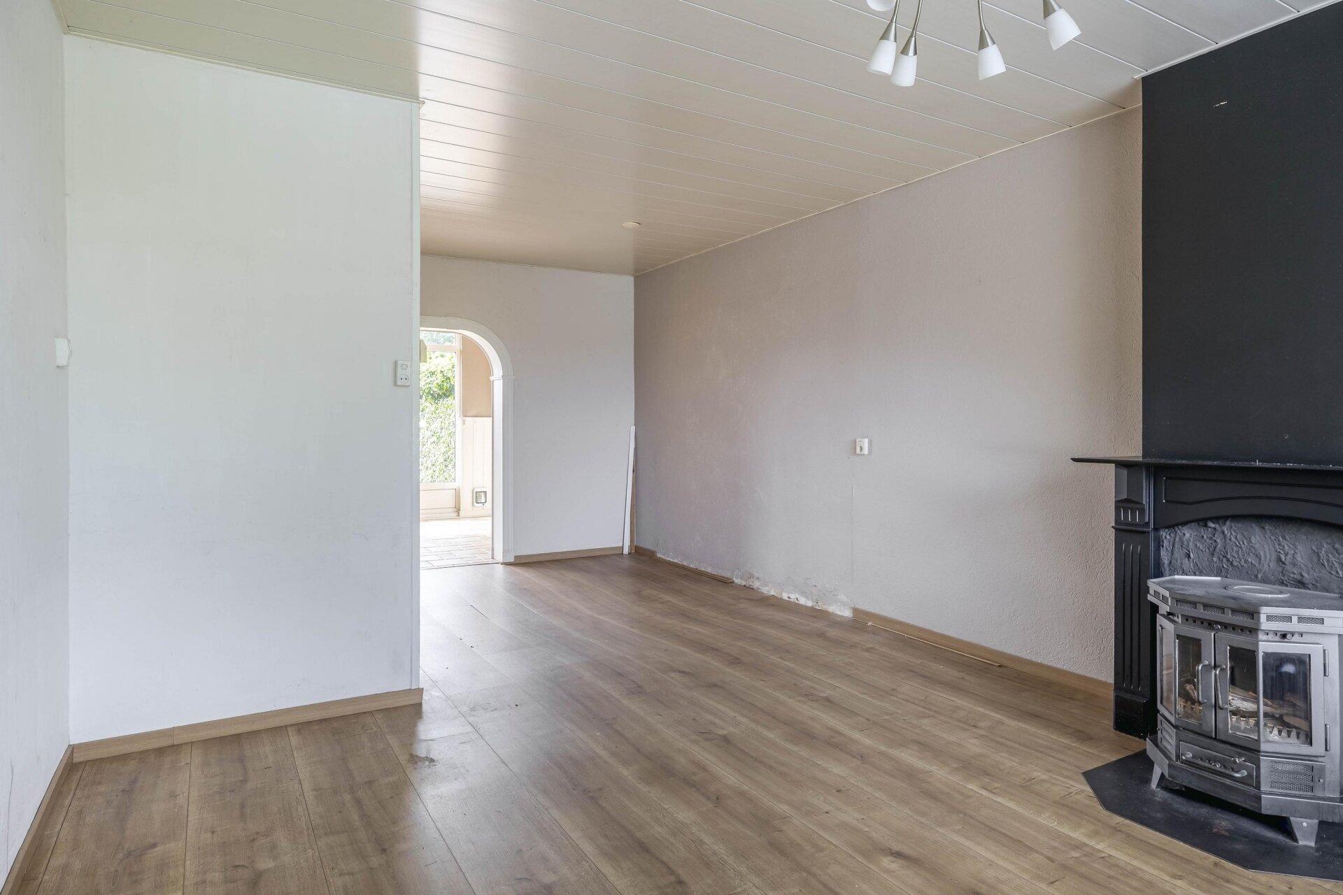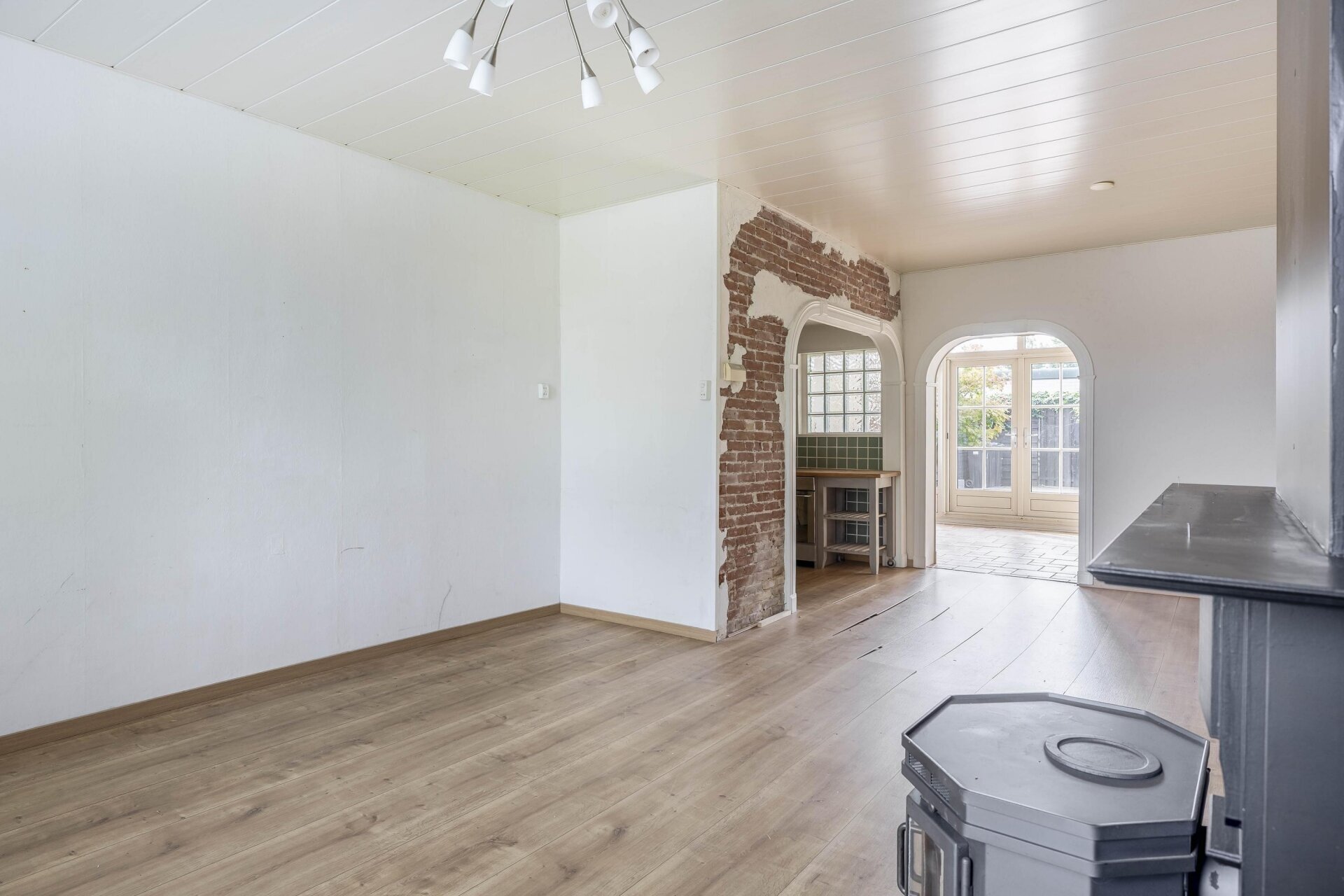 De woning zelf heeft verrassend veel sfeer. De woonkamer is licht en rechthoekig van opzet, met een warme houten vloer en een authentieke houtkachel als eyecatcher. Openslaande deuren leiden je naar de tuin, wat zorgt voor veel natuurlijk licht en een fijne verbinding met buiten.
