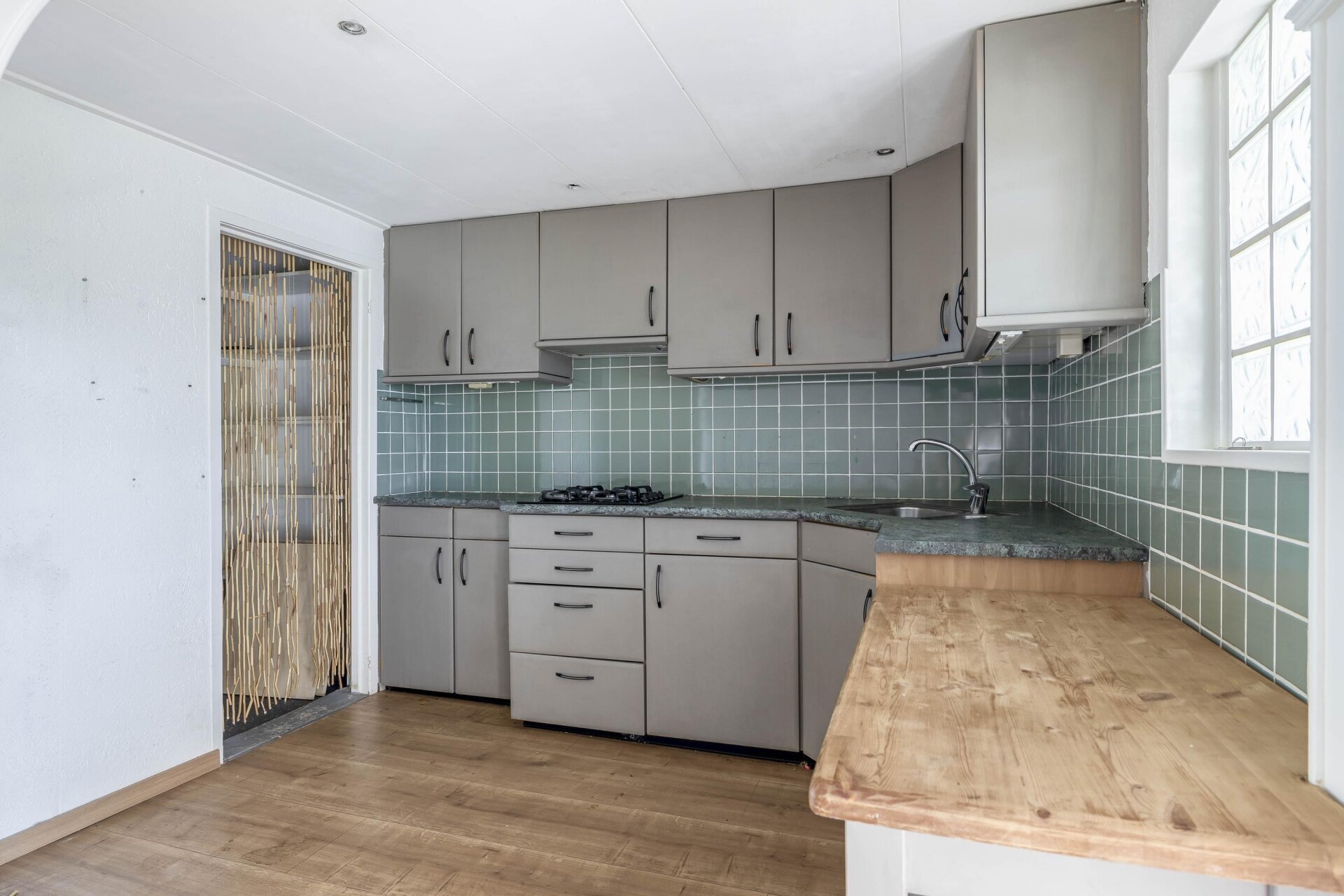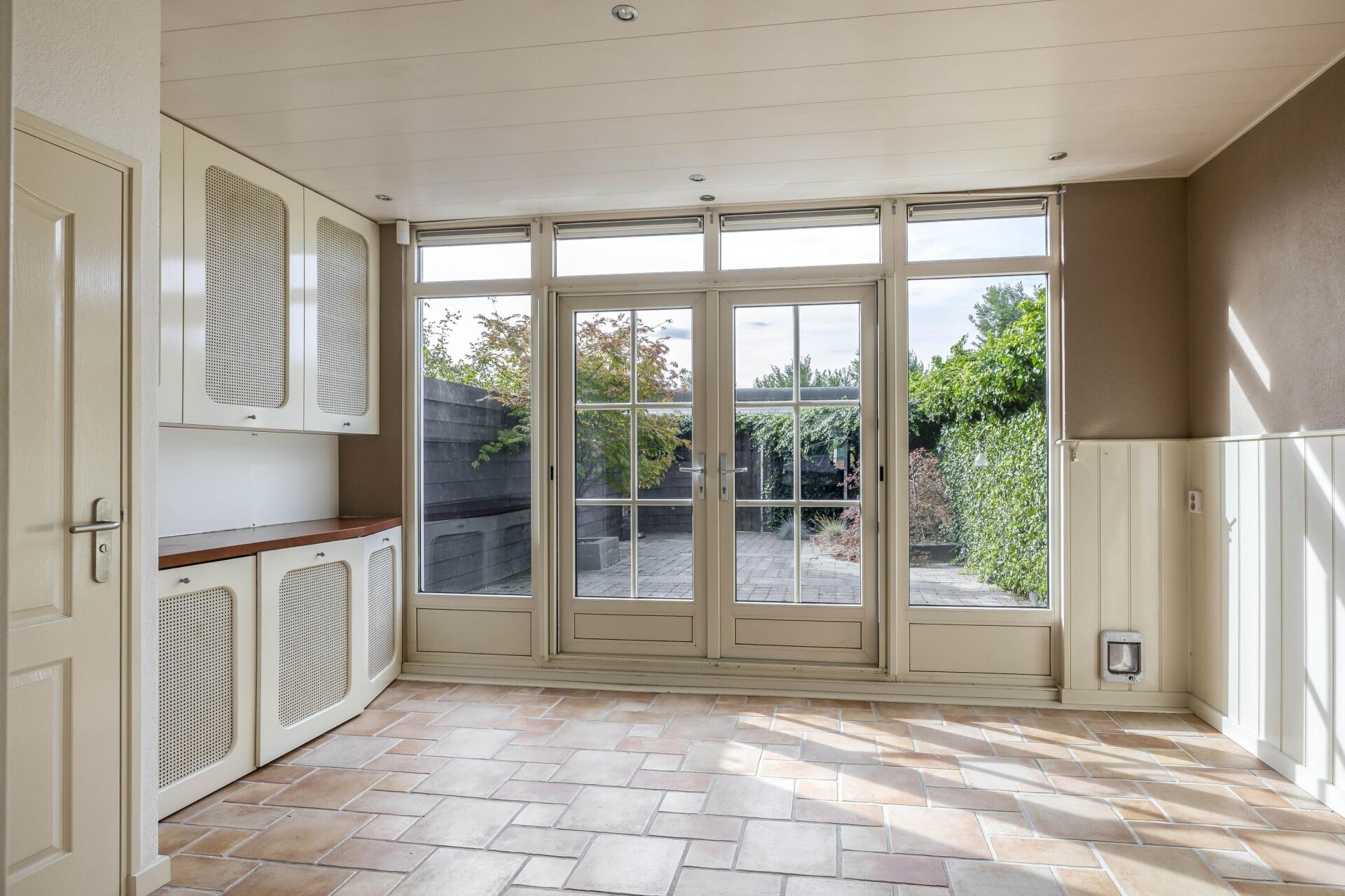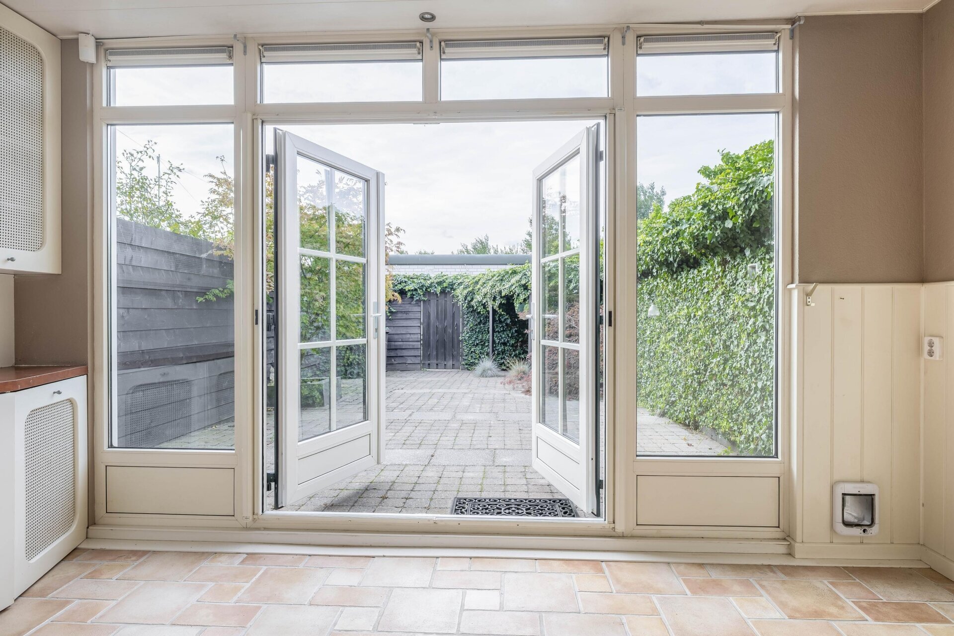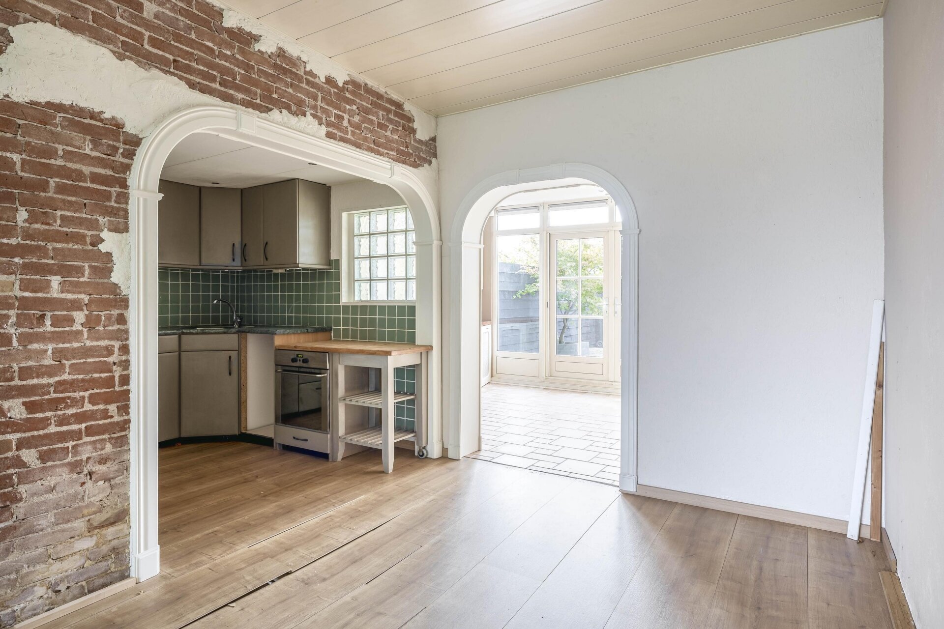 De open keuken sluit aan op de woonkamer en heeft een originele boogdoorgang met zichtbare bakstenen, wat een speelse en karaktervolle uitstraling geeft. Vanuit de keuken is er ook toegang tot een serre-achtige ruimte met dubbele deuren naar de tuin – ideaal als eetkamer of werkplek.