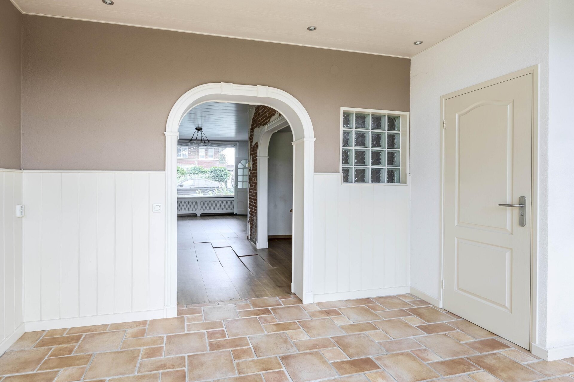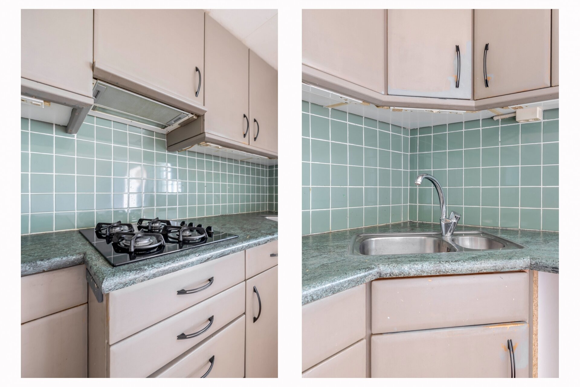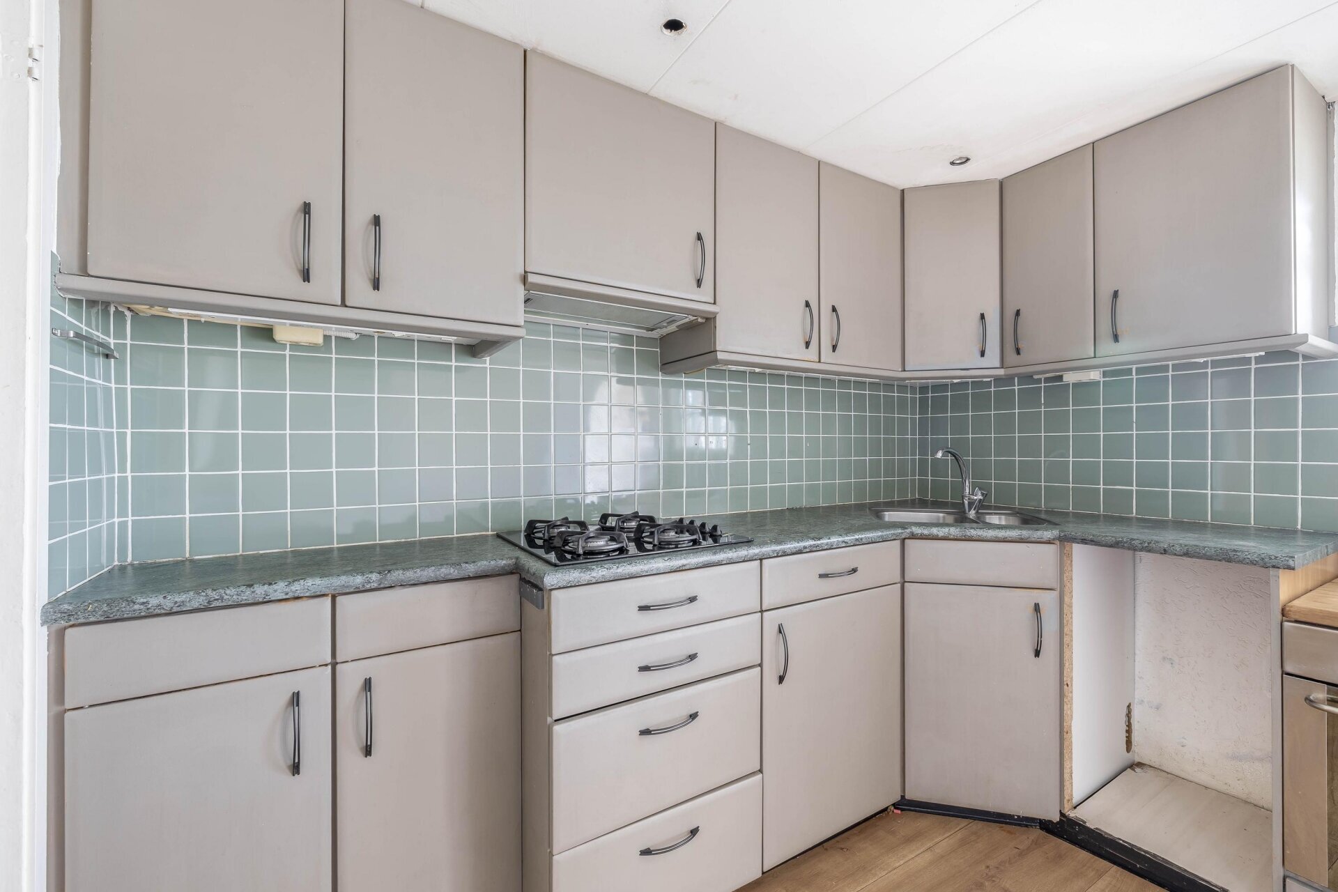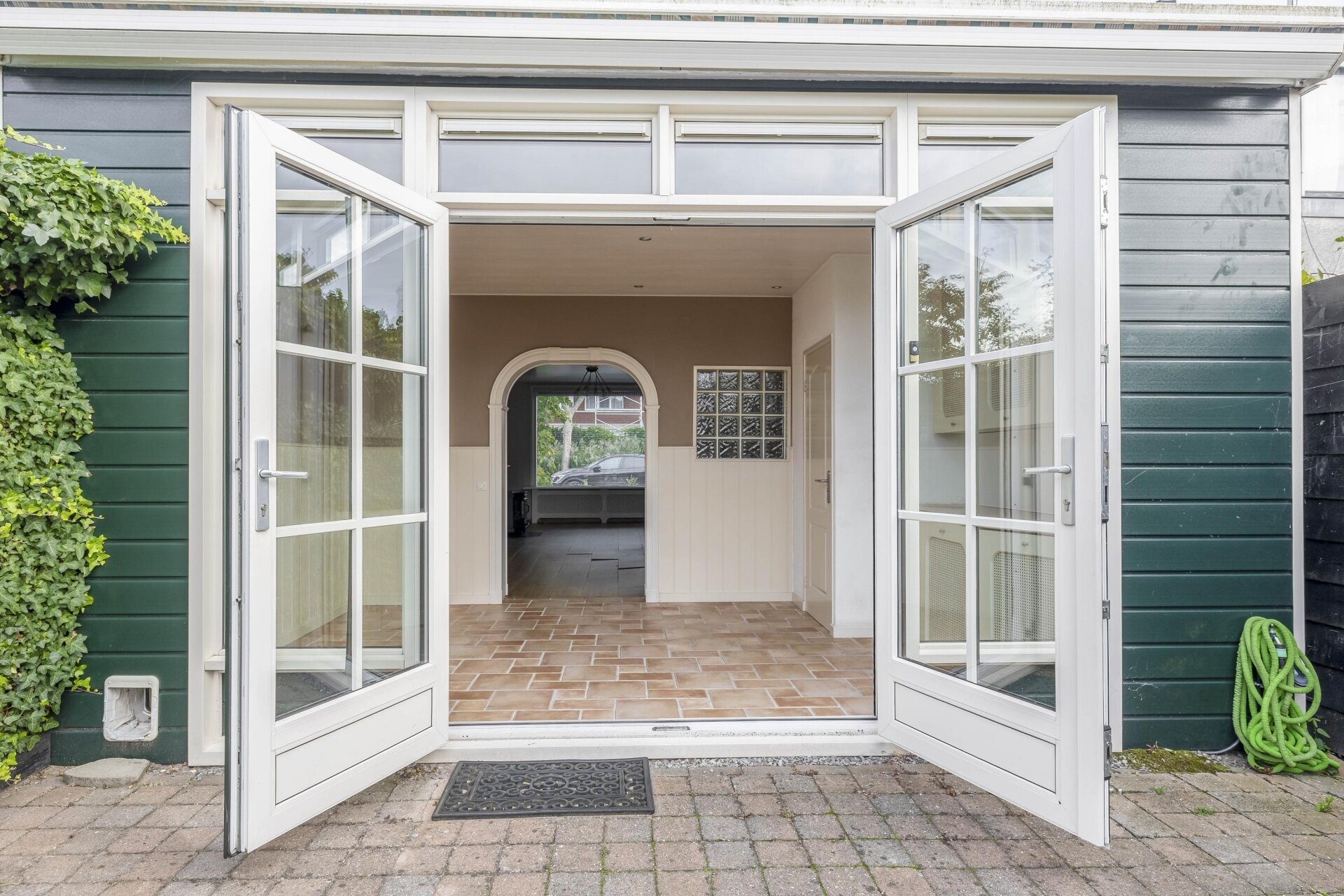 De open keuken sluit aan op de woonkamer en heeft een originele boogdoorgang met zichtbare bakstenen, wat een speelse en karaktervolle uitstraling geeft. Vanuit de keuken is er ook toegang tot een serre-achtige ruimte met dubbele deuren naar de tuin – ideaal als eetkamer of werkplek.