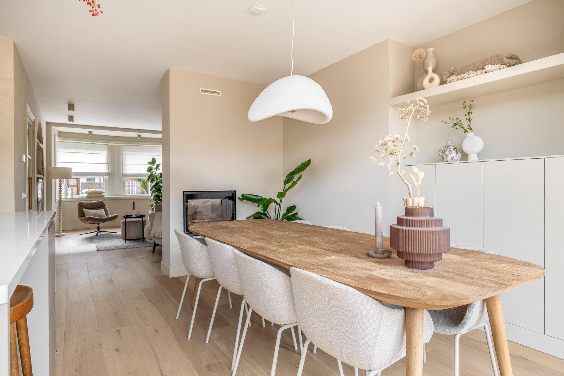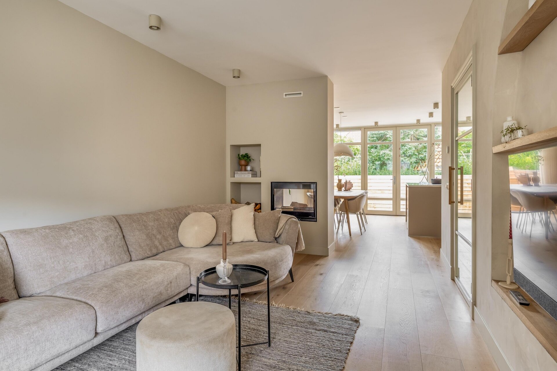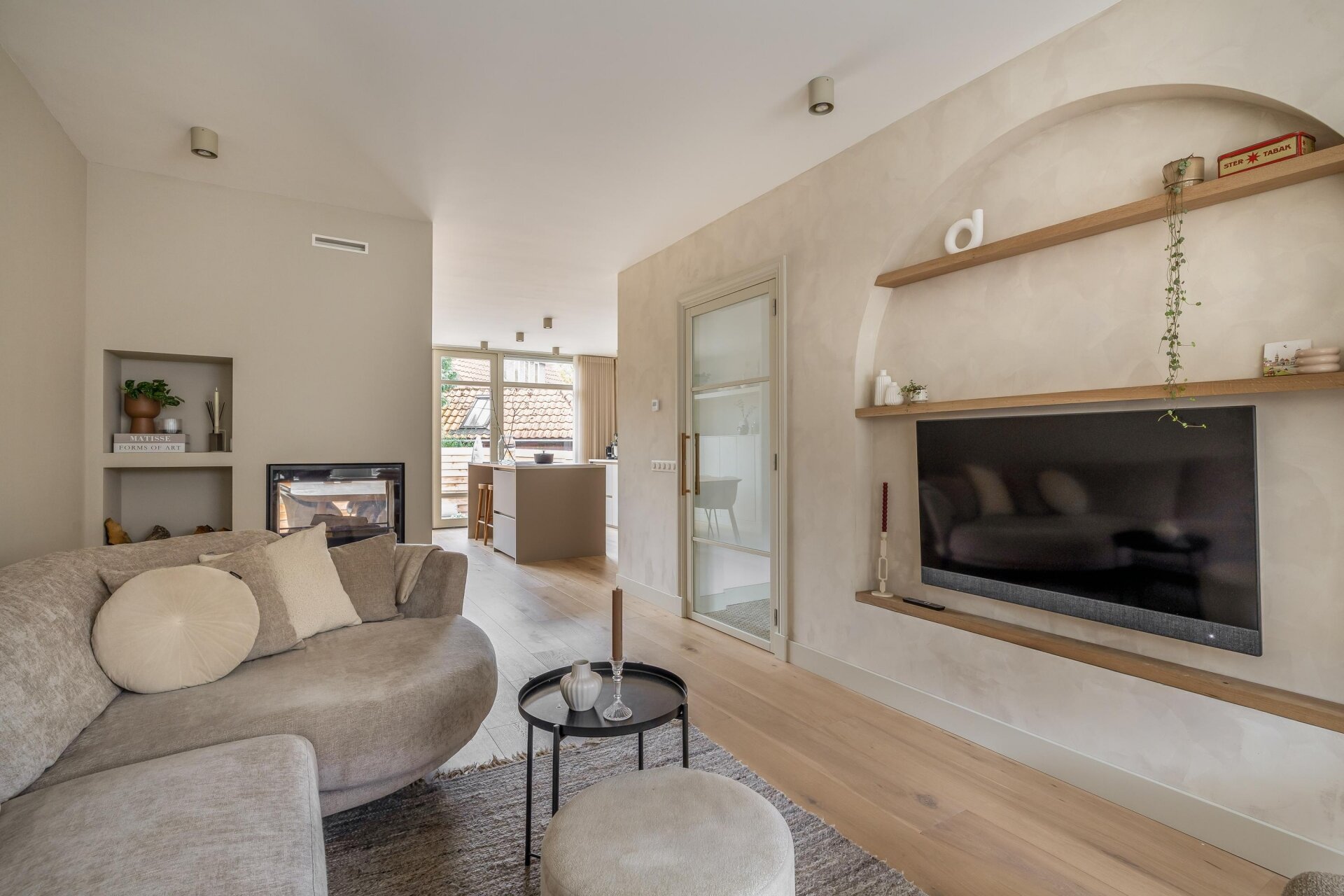 De lichte woonkamer is een plek waar je direct tot rust komt. Dankzij de erker aan de voorzijde en de zachte kleurstelling voelt het hier warm en uitnodigend. De zithoek met maatwerk-nis en ingebouwde tv is een echte eyecatcher en sluit mooi aan op de eetkamer en moderne keuken.