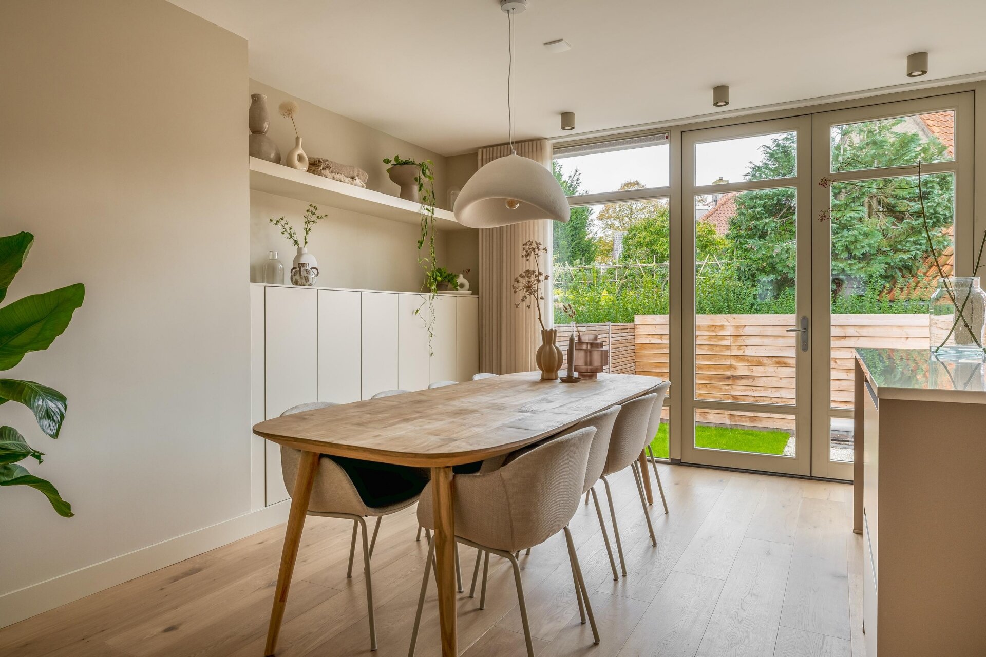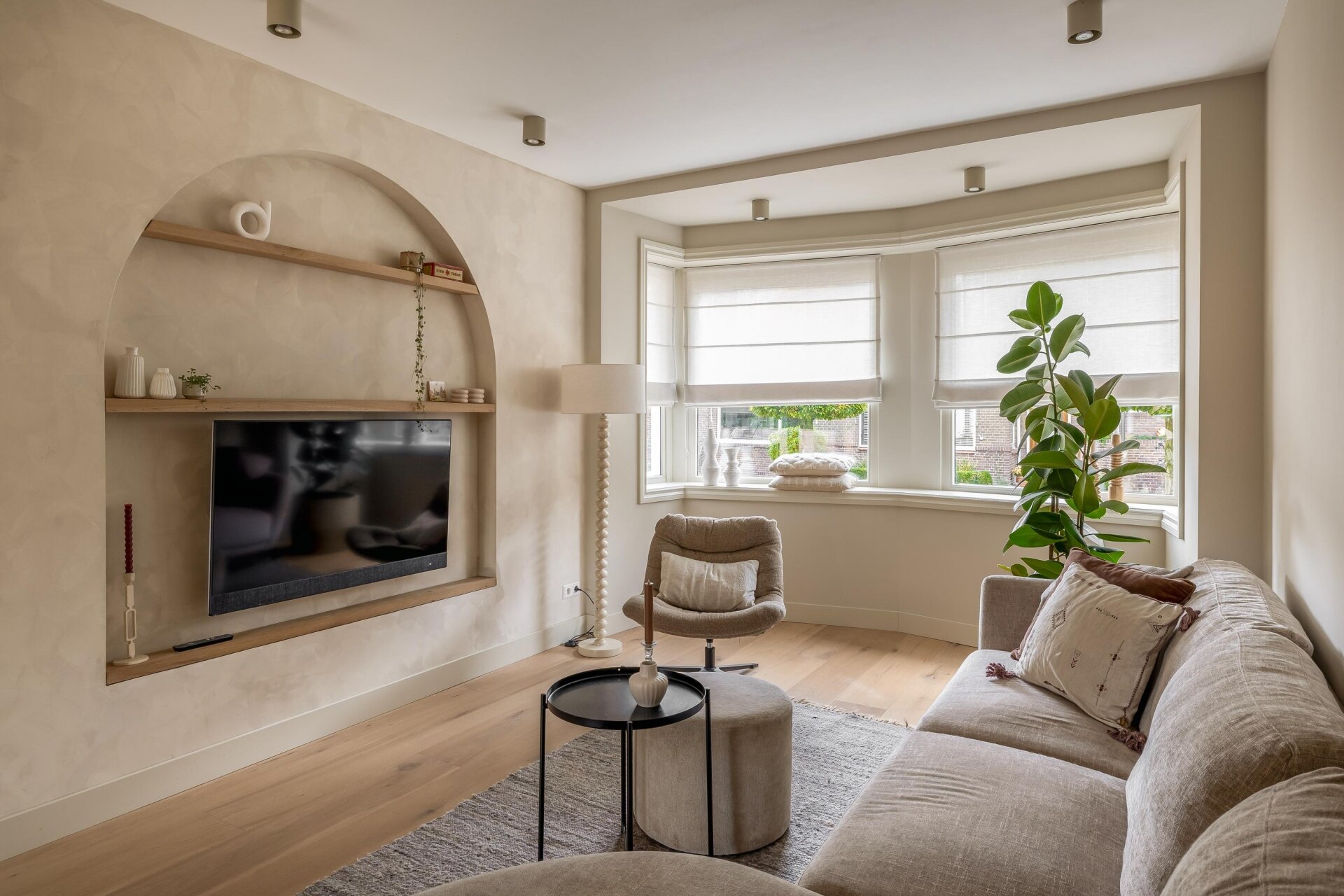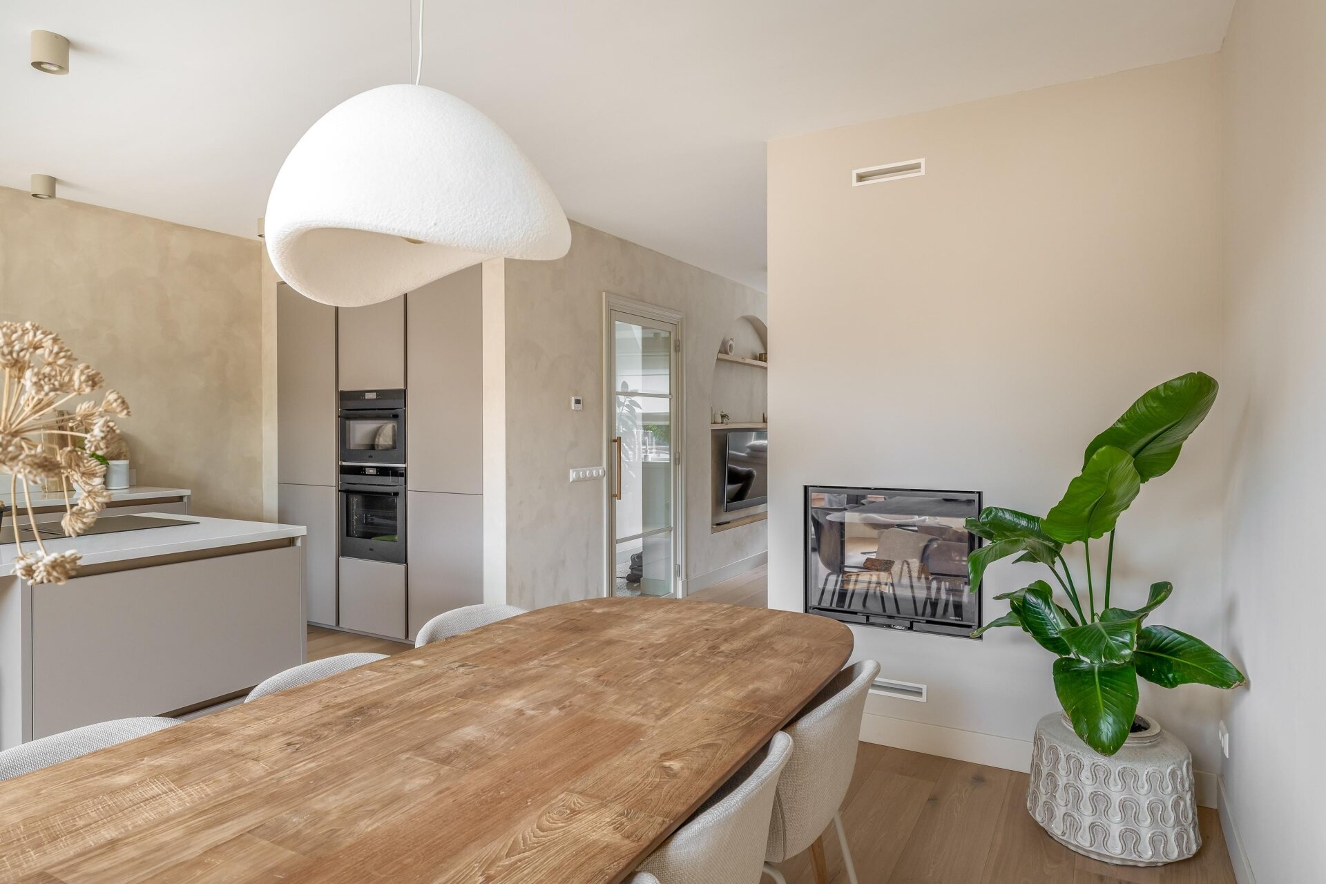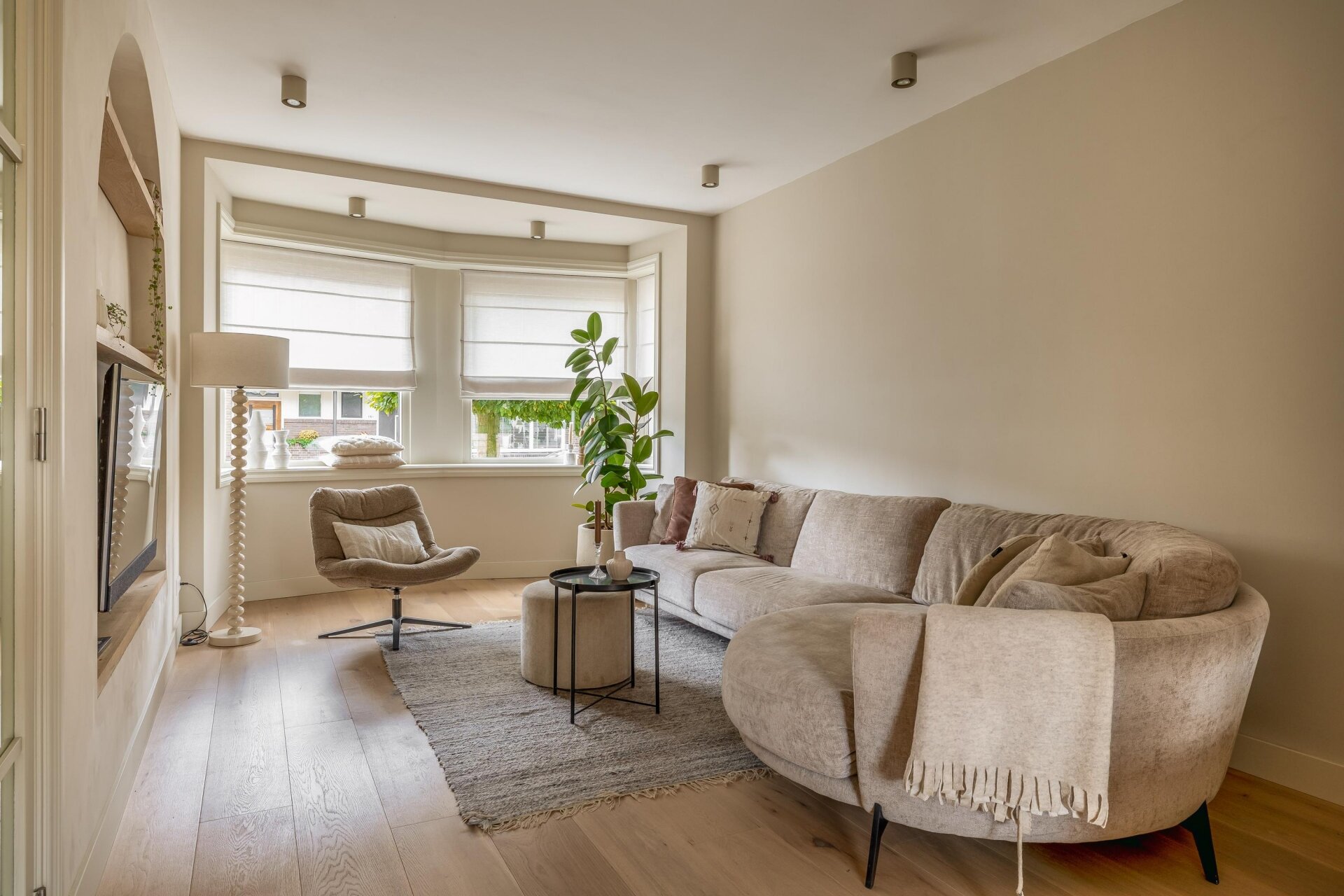 De lichte woonkamer is een plek waar je direct tot rust komt. Dankzij de erker aan de voorzijde en de zachte kleurstelling voelt het hier warm en uitnodigend. De zithoek met maatwerk-nis en ingebouwde tv is een echte eyecatcher en sluit mooi aan op de eetkamer en moderne keuken.