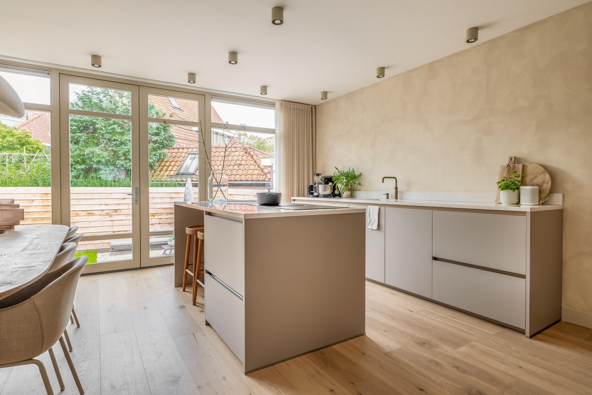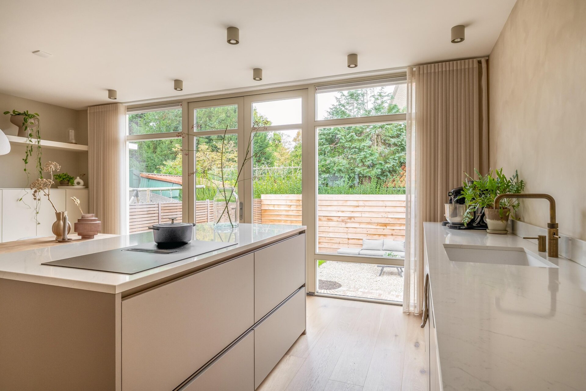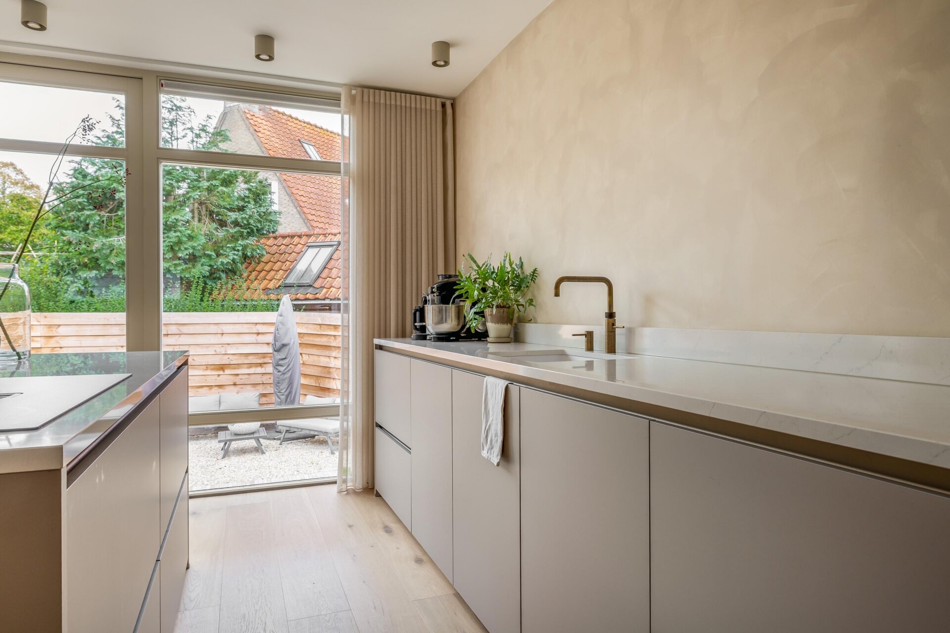 De keuken is zonder twijfel het hart van dit huis. Strak vormgegeven met lichte fronten, een groot kookeiland en moderne apparatuur, biedt deze ruimte alles voor wie graag kookt of gasten ontvangt. Terwijl jij aan het koken bent, klets je gezellig mee met familie of vrienden aan het eiland. De afwerking is tot in detail verzorgd: houten vloeren, glad gestuukte wanden en ingebouwde verlichting zorgen voor een rustige, eigentijdse uitstraling.
