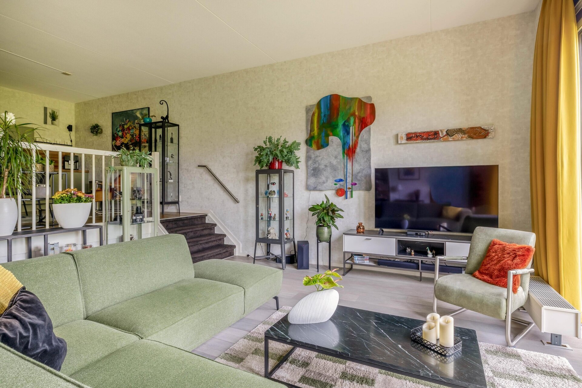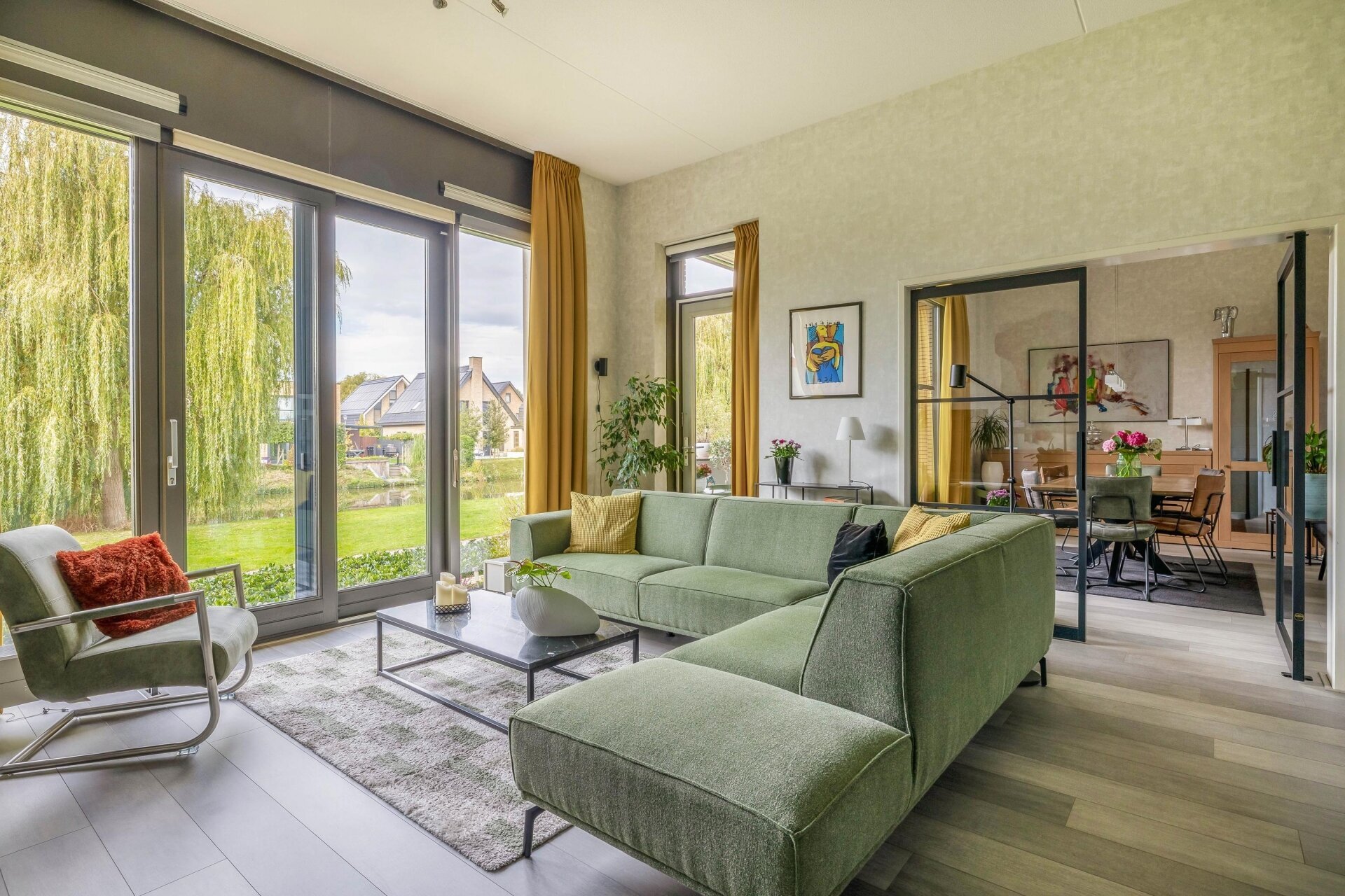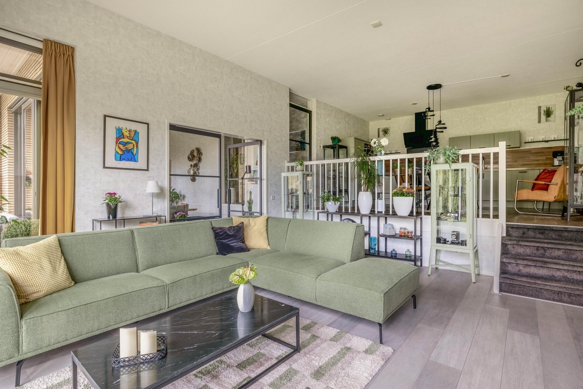 Wat direct opvalt bij binnenkomst is de royale hoogte van de plafonds in de woonkamers van ca. 3,40 meter, wat zorgt voor een indrukwekkend ruimtelijk gevoel. Dankzij de grote raampartijen aan de achterzijde stroomt het daglicht naar binnen en heb je prachtig uitzicht op het groen en de waterpartij. De sfeervolle woonkamer is verbonden met de woonkeuken via een trappetje van drie treden. De stijlvolle stalen taatsdeuren verdelen de woonkamer in twee gedeeltes. Dit geeft niet alleen een luxe uitstraling, maar maakt het geheel ook heerlijk licht en open. De woonkamers bieden voldoende plek voor een royale zithoek én bijvoorbeeld een extra leeshoek of eettafel. Vanuit de woonkamers loop je zo het balkon op, dat netjes is afgewerkt met kunststof vlonders en ruimte biedt voor een zitje met privacy én uitzicht.