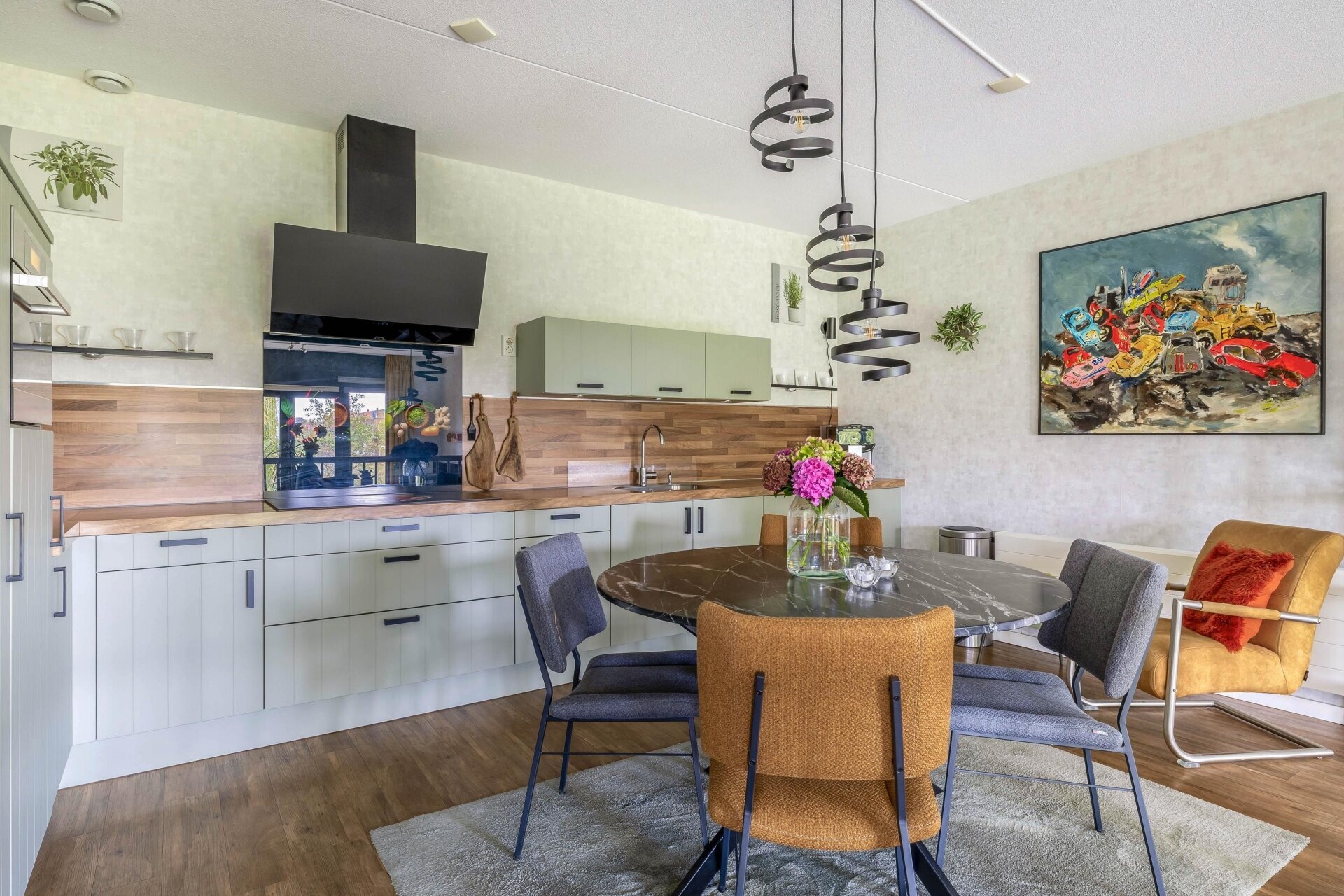 De open woonkeuken is een absolute eyecatcher. De combinatie van warme houttinten, moderne verlichting en strak vormgegeven apparatuur geeft deze ruimte karakter en gebruiksgemak. De keuken is van alle gemakken voorzien, met een inductiekookplaat, afzuiging, combi-oven, koelkast, vaatwasser en voldoende opbergruimte.