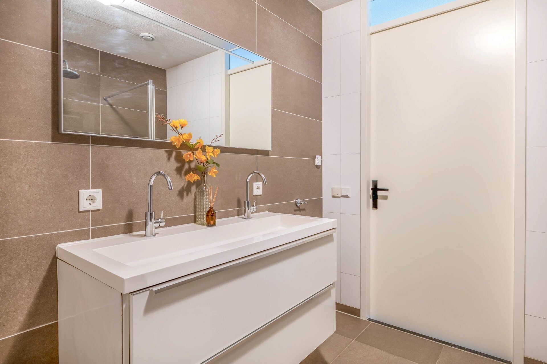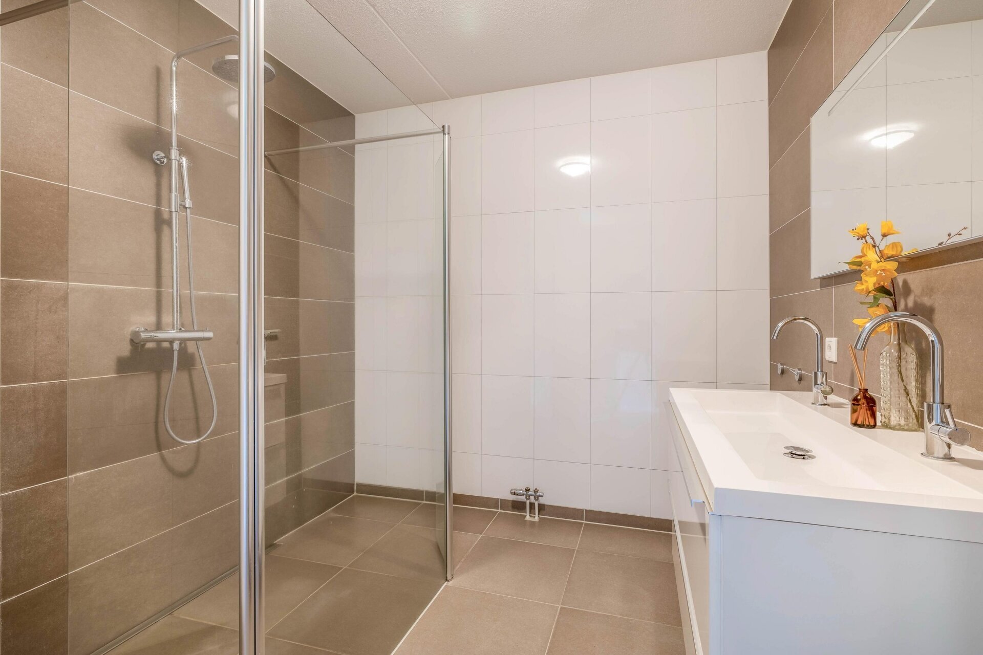 Ook aan de sanitaire voorzieningen is gedacht. De ruime badkamer is ingericht met een inloopdouche en dubbele wastafel. De afwerking is neutraal en verzorgd, wat de ruimte een rustige uitstraling geeft. Separaat vind je het toilet, evenals een aparte wasruimte en technische ruimte.