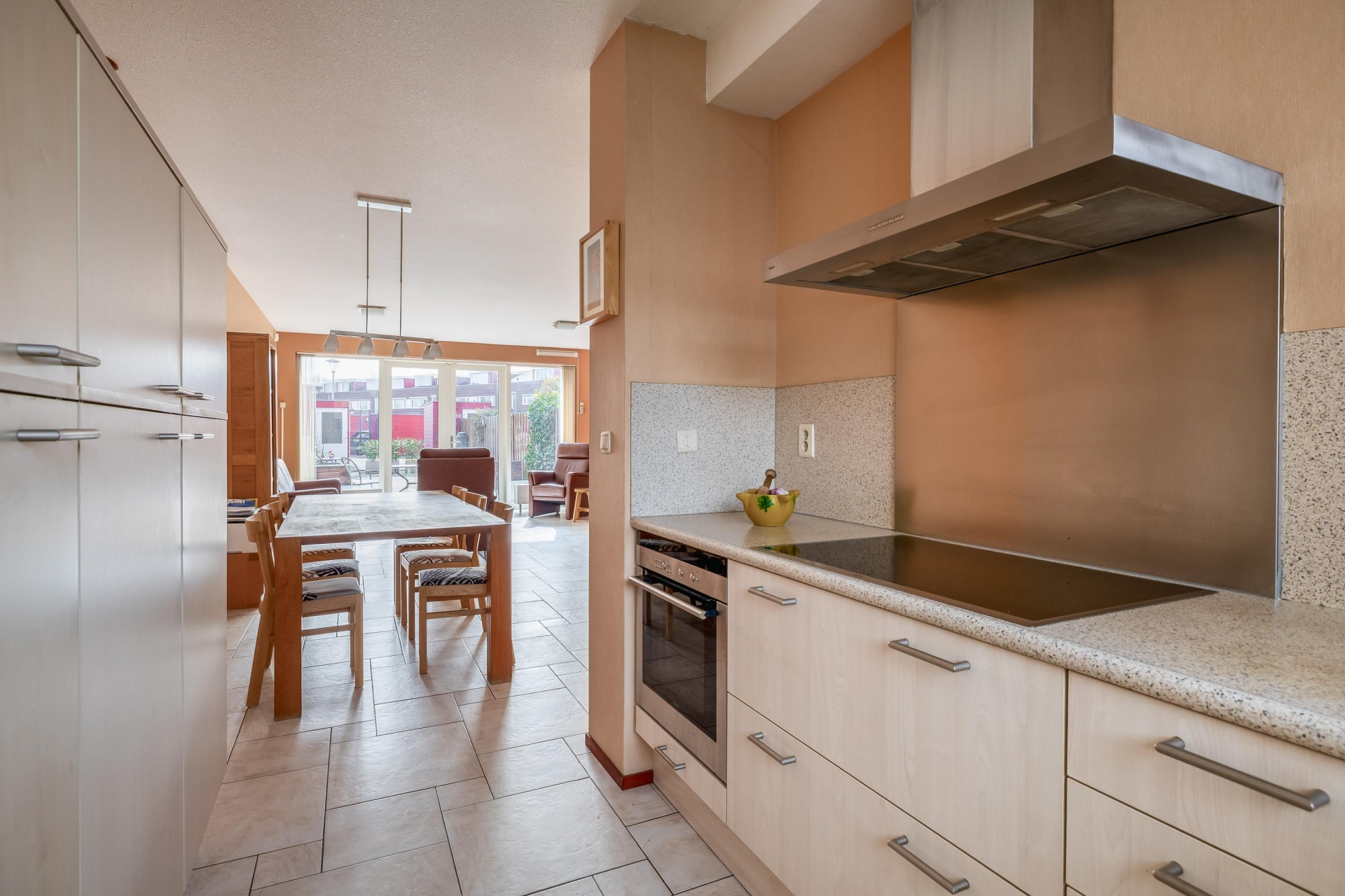 De keuken ligt aan de voorzijde van het huis en is uitgevoerd in een praktische L-opstelling. Dankzij het grote raam aan de voorzijde is ook hier veel natuurlijk licht aanwezig. De keuken biedt voldoende werk- en kastruimte en is voorzien van diverse inbouwapparatuur. Vanuit de keuken kijk je uit over de straat en de groenstrook voor het huis.