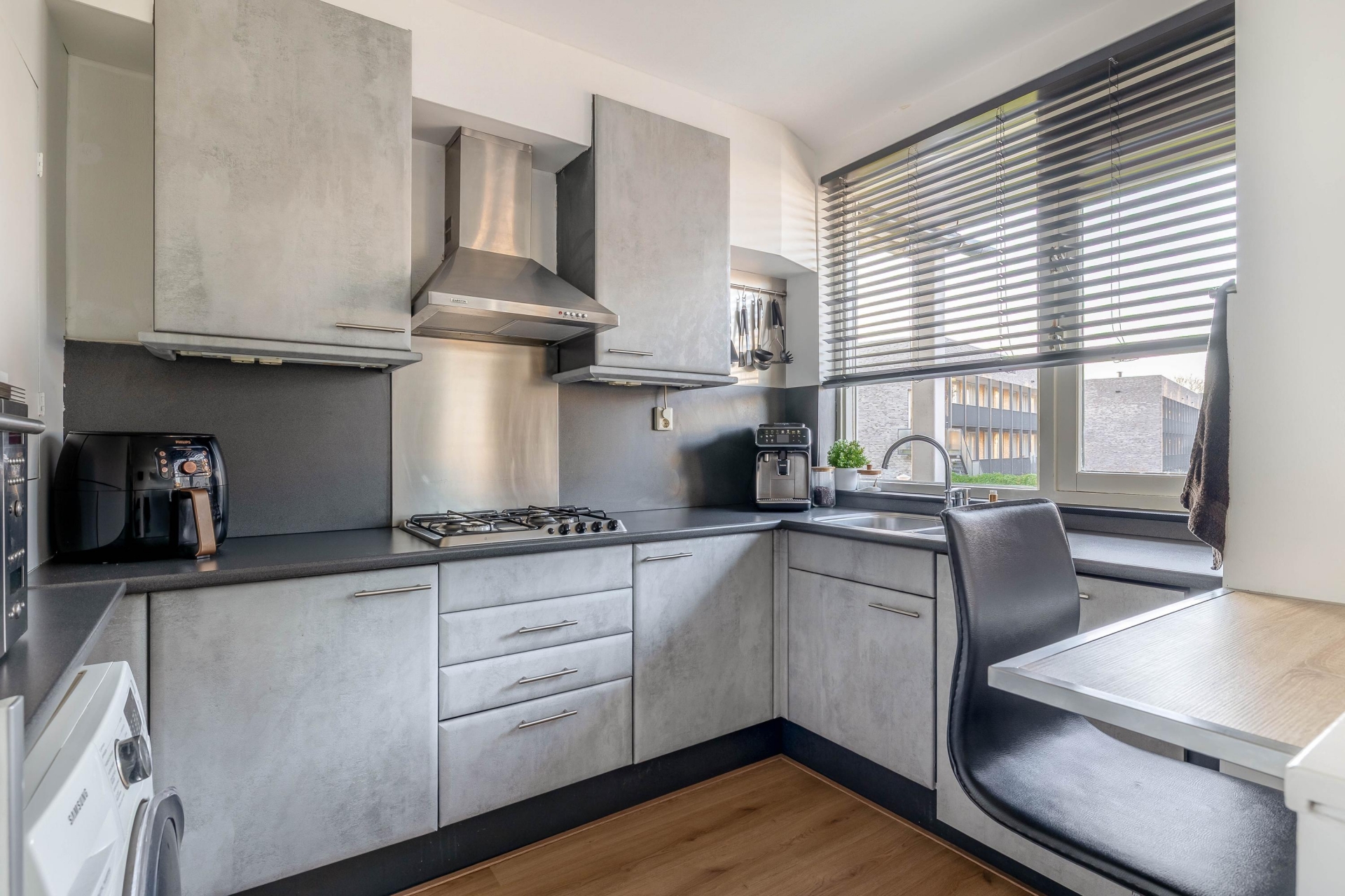 De keuken is netjes en praktisch ingericht met voldoende werkruimte en een moderne uitstraling. Dankzij het grote raam boven het aanrecht heb je hier veel daglicht, wat het een prettige plek maakt om te koken. De opstelling is functioneel, met voldoende kastruimte en apparatuur en sluit mooi aan op de rest van het appartement.