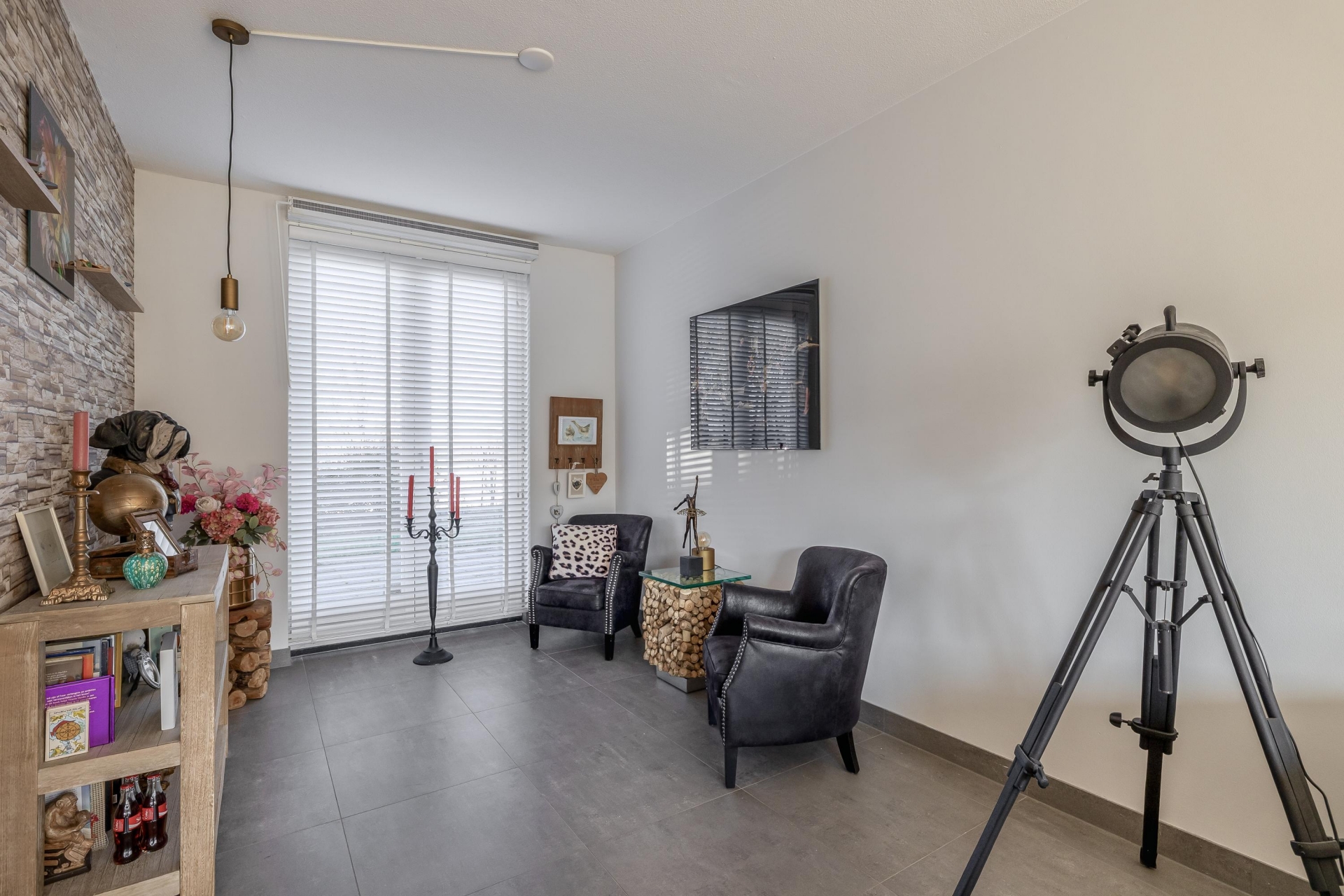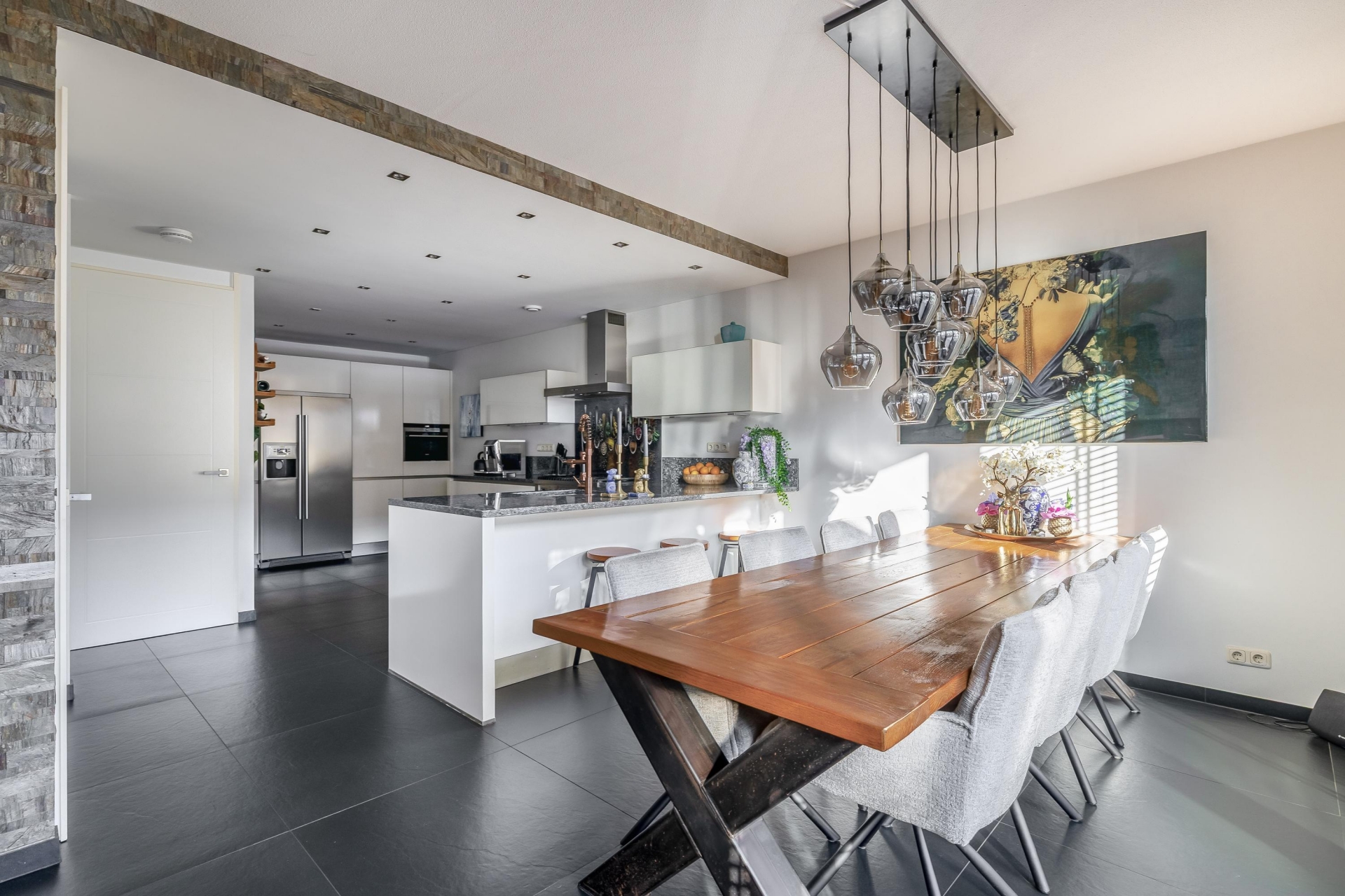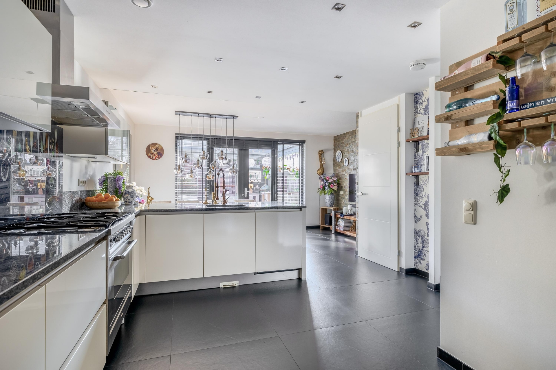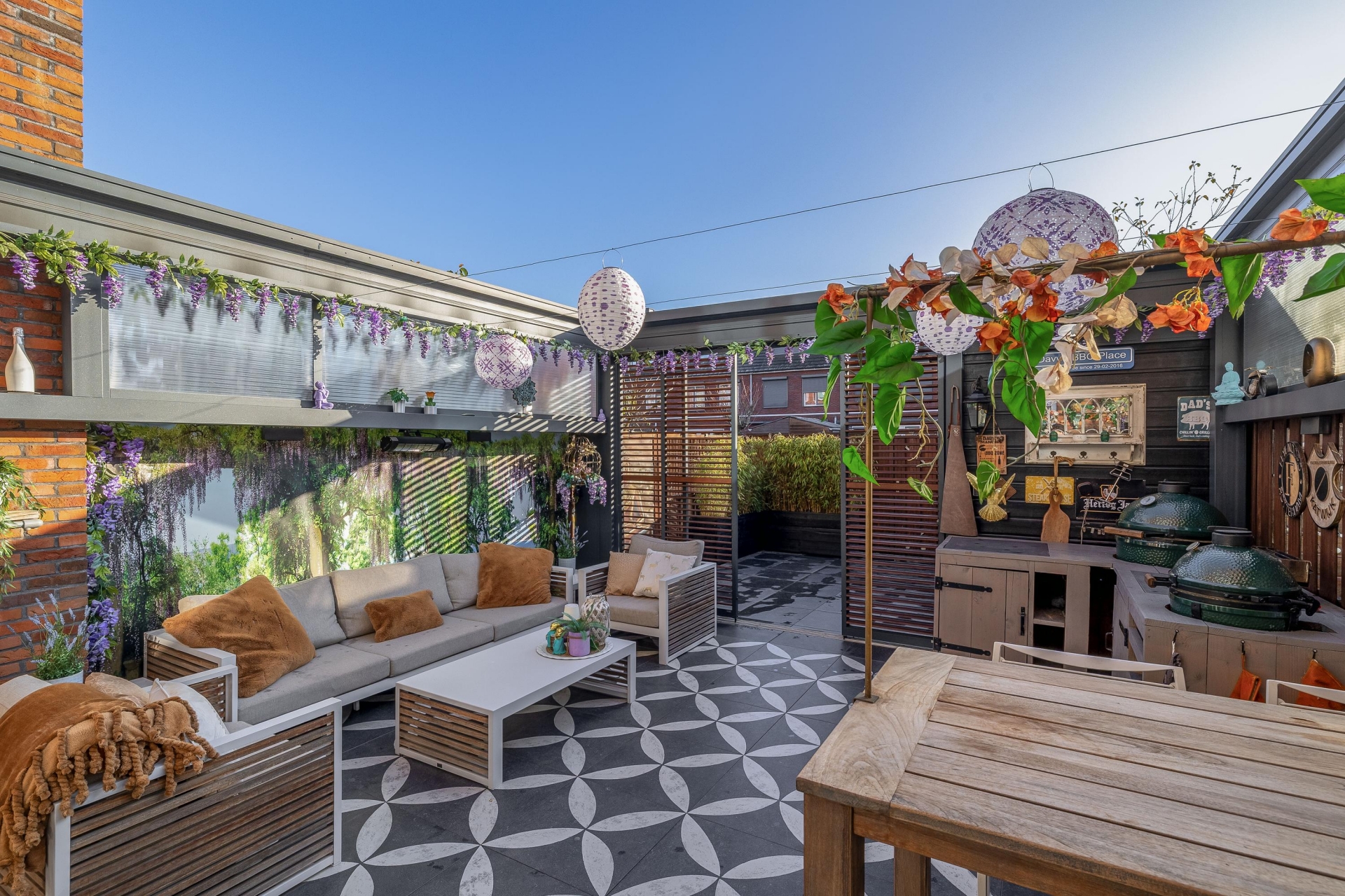 De keuken is zonder twijfel één van de eyecatchers van het huis. Met het ruime werkblad, het stoere fornuis en een stijlvolle afwerking is dit een plek waar koken echt een plezier is. Of je nu uitgebreid voor gasten kookt of even snel iets opwarmt – alles ligt binnen handbereik. Vanuit de keuken loop je direct de tuin in: een sfeervol aangelegde buitenruimte met overkapping die je open of dicht kunt zetten. Ideaal voor lange zomeravonden, maar ook perfect om het hele jaar door droog buiten te zitten.