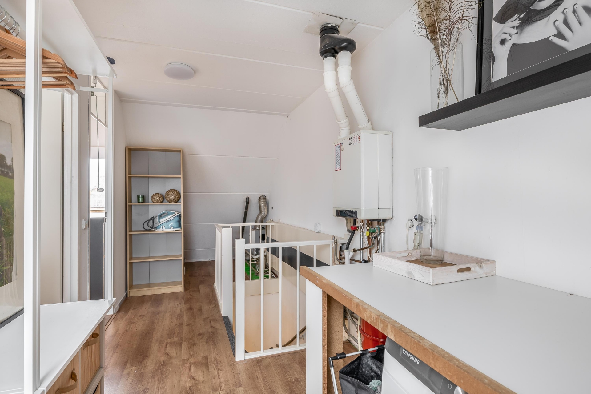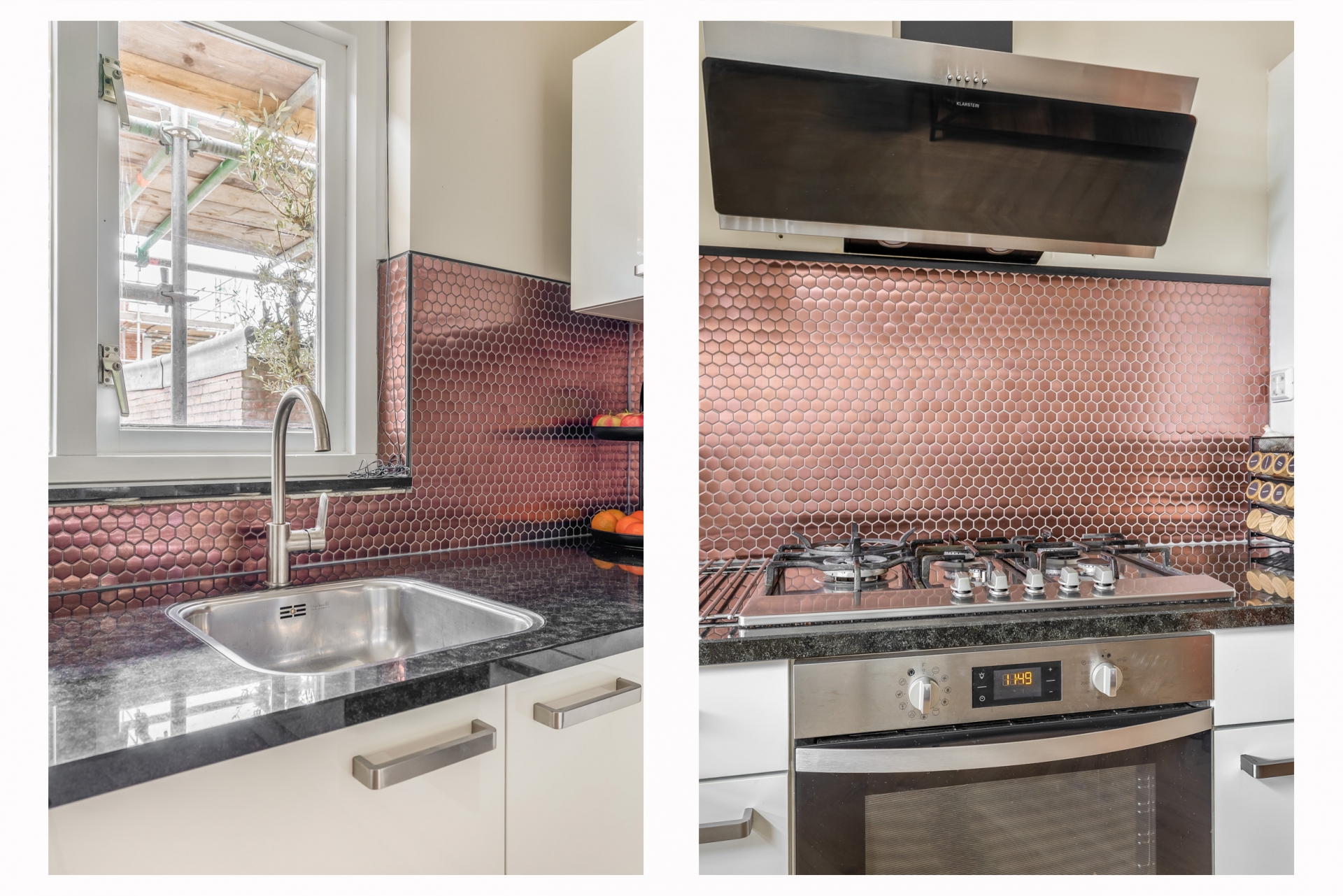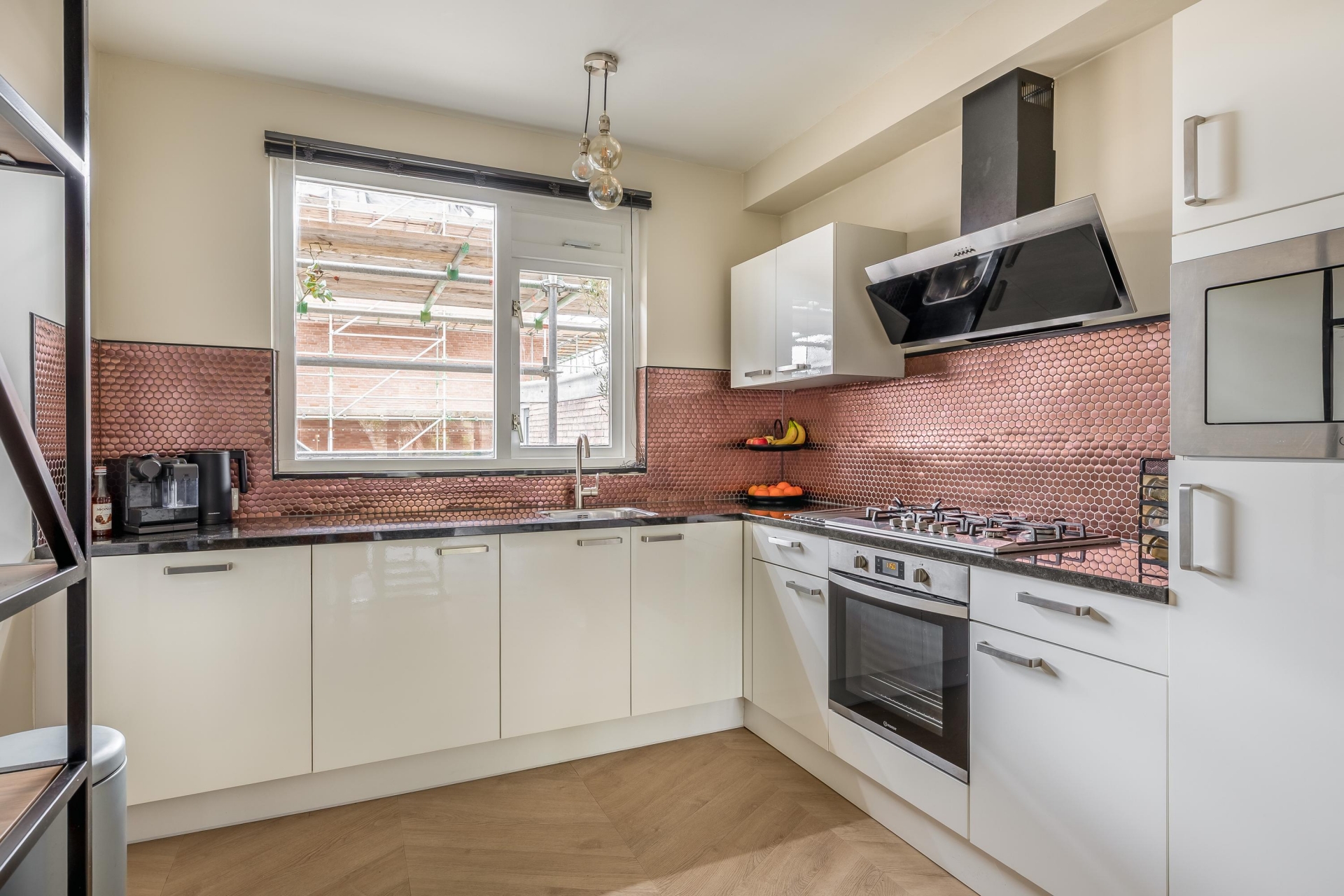 De keuken is eigentijds en stijlvol uitgevoerd met een opvallende, koperkleurige achterwand en een functionele indeling. Hier vind je een vijfpits-gasfornuis met afzuigkap, magnetron, oven, koelkast, vaatwasser en veel praktische werk? en bergruimte. De keuken heeft een prettige ligging aan de voorzijde van het huis met natuurlijk licht via het raam.