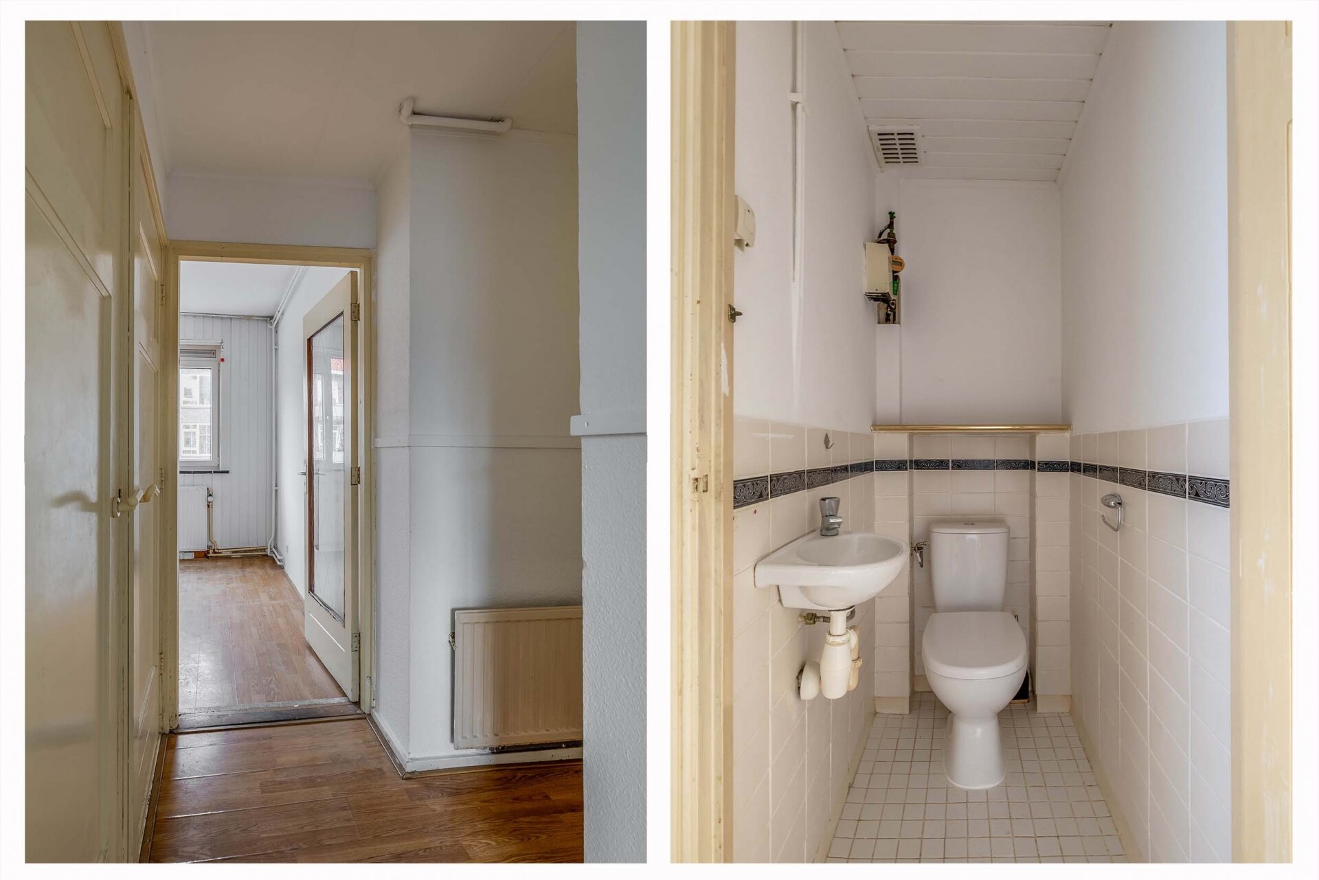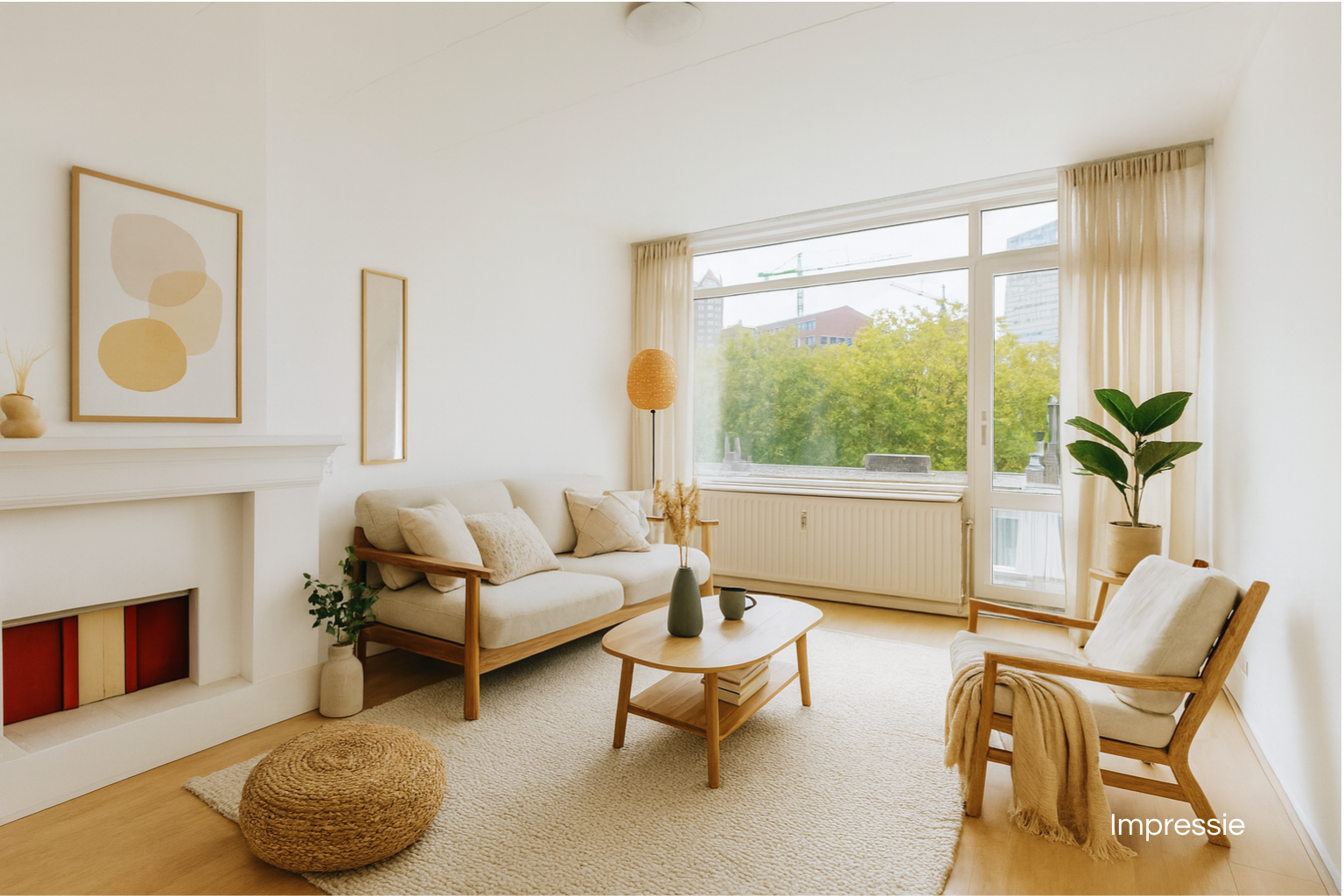 Zodra je binnenkomt in het appartement stap je binnen in een centrale hal. Vanuit hier heb je toegang tot alle vertrekken, met als eyecatcher de ruime woonkamer aan de voorzijde van het huis. Dankzij de grote raampartijen aan de straatkant komt er veel daglicht binnen en heb je uitzicht op de gezellige Pannekoekstraat. De originele schouw geeft het geheel net dat beetje extra karakter.