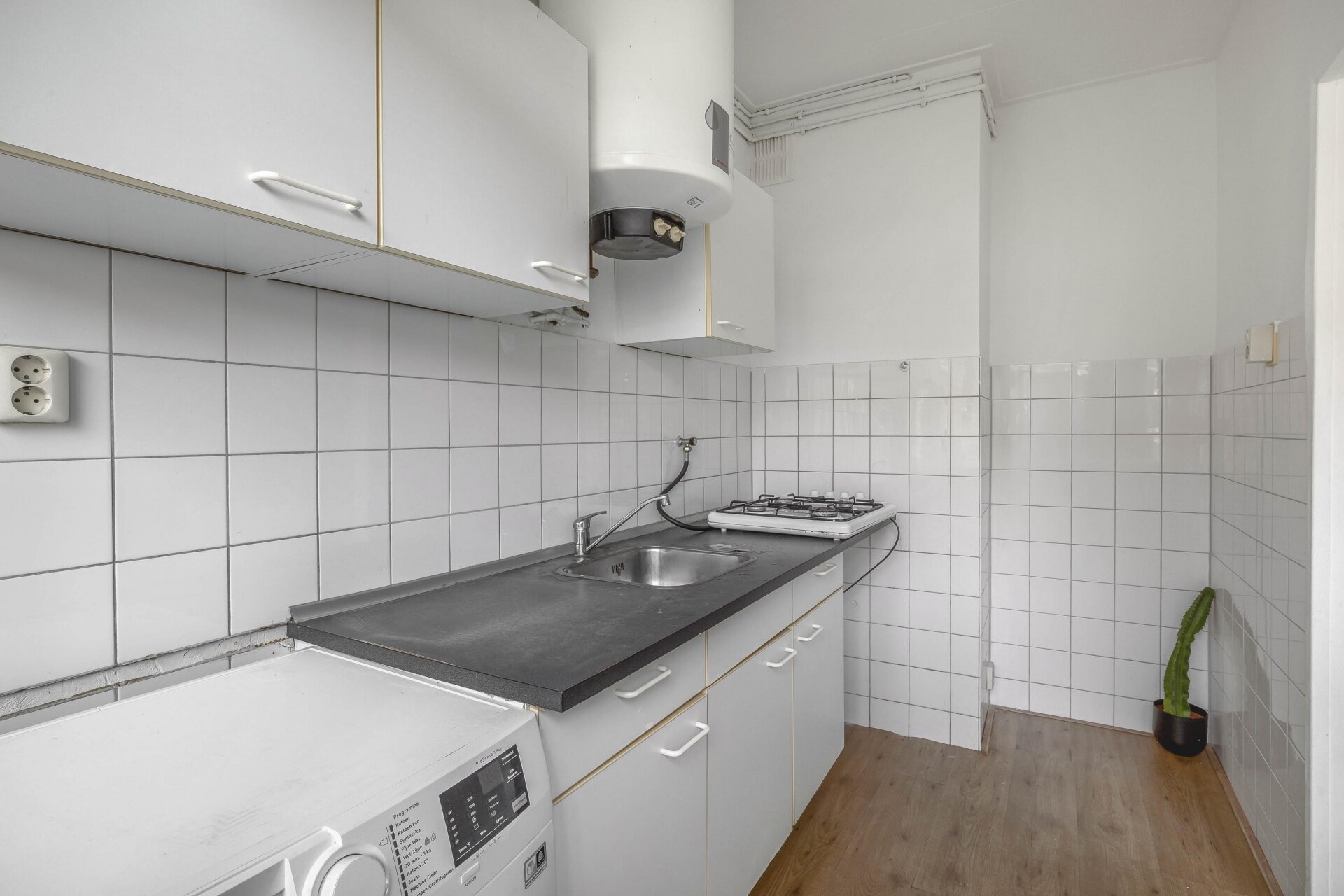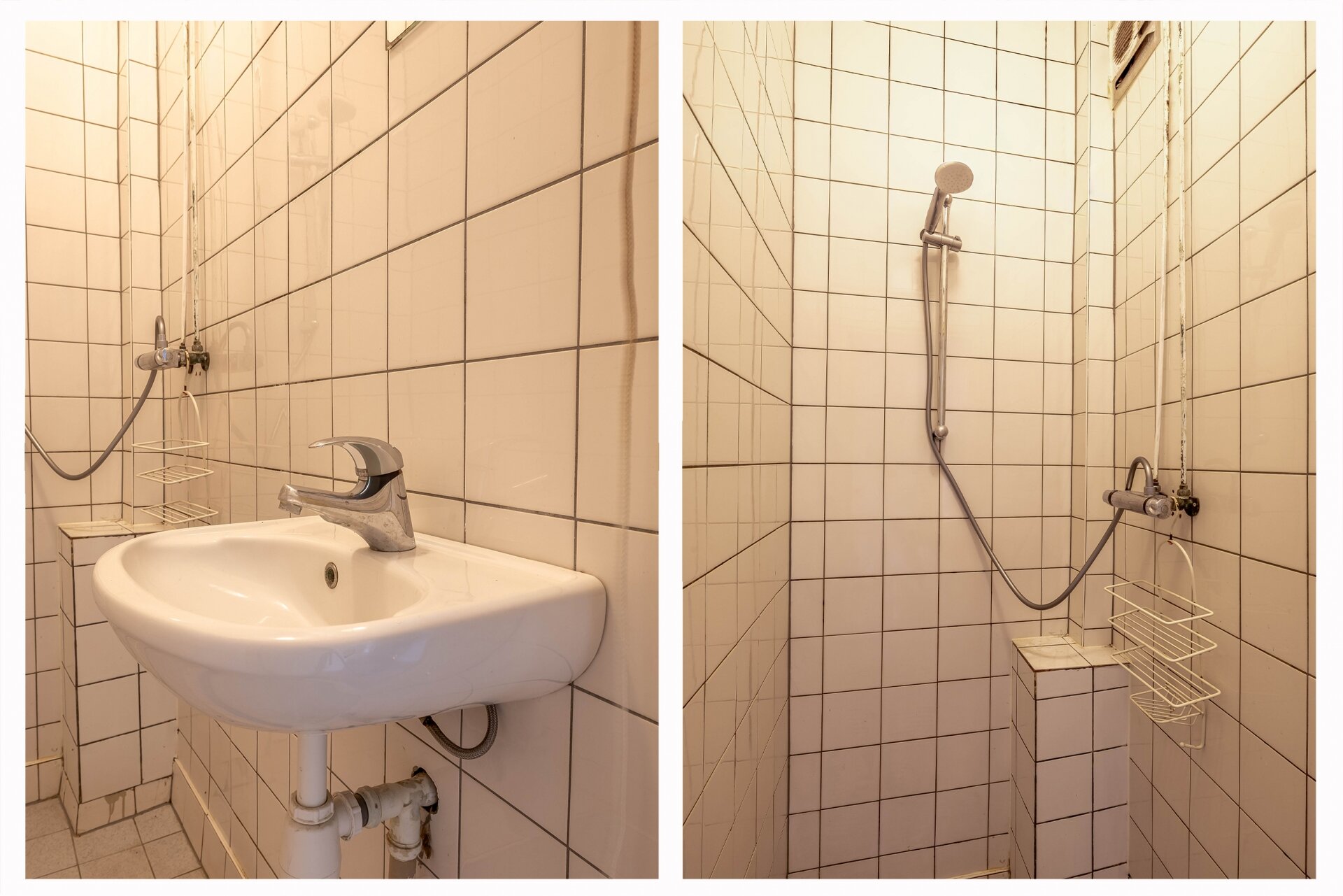 De keuken ligt naast de slaapkamers en is compact maar functioneel en geeft toegang tot de eetkamer, welke voorheen een slaapkamer is geweest. De keuken is voorzien van een recht keukenblok met inbouwapparatuur en een aansluiting voor de wasmachine. Zowel de eetkamer als keuken geven toegang aan het balkon, welke is gelegen op het noordoosten, dus in de ochtend en vroege middag kun je hier heerlijk genieten van de zon. Ook vanuit de keuken is er toegang tot het balkon. Het toilet en de aparte doucheruimte zijn eenvoudig uitgevoerd, maar wel praktisch van elkaar gescheiden.