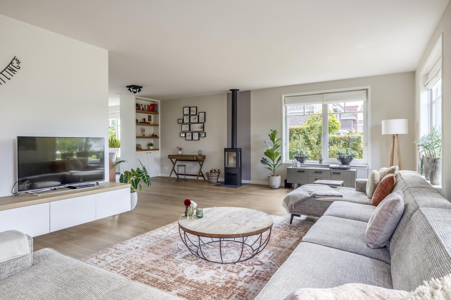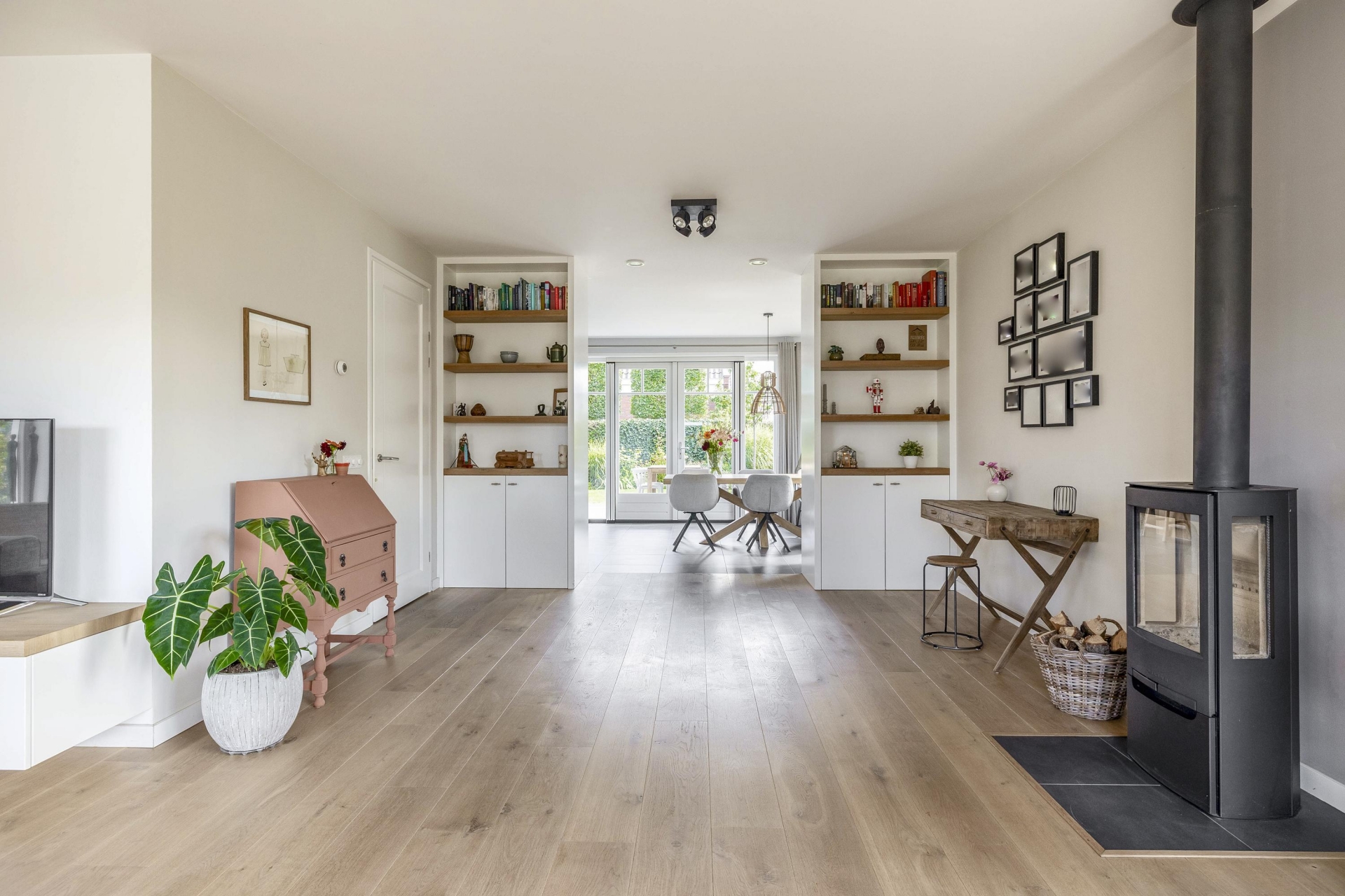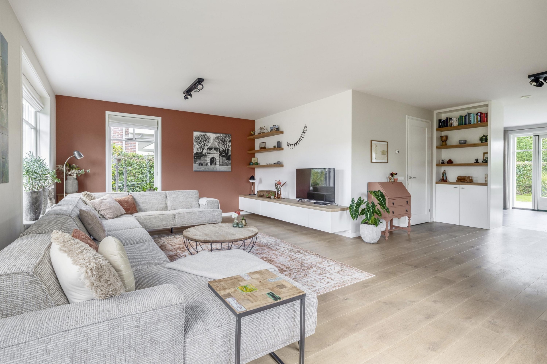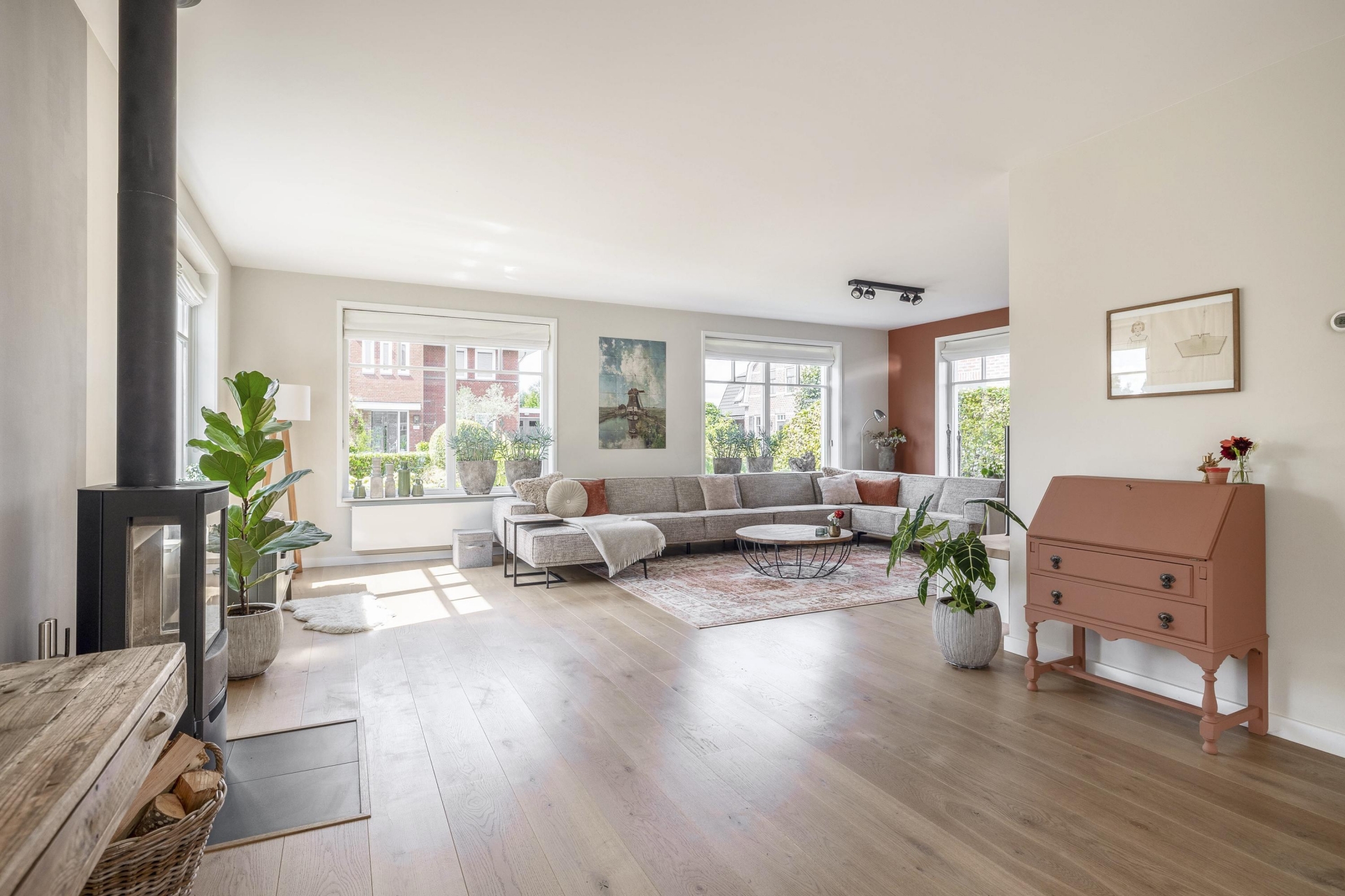 Wat direct opvalt als je binnenkomt? De ruimte en het licht. De woonkamer aan de voorzijde strekt zich uit over de volledige breedte van het huis en is ingericht met grote raampartijen aan meerdere zijden. Hierdoor komt het daglicht van alle kanten naar binnen. De eikenhouten vloer, strak gestucte wanden en warme kleuraccenten zorgen voor een huiselijke en moderne sfeer.