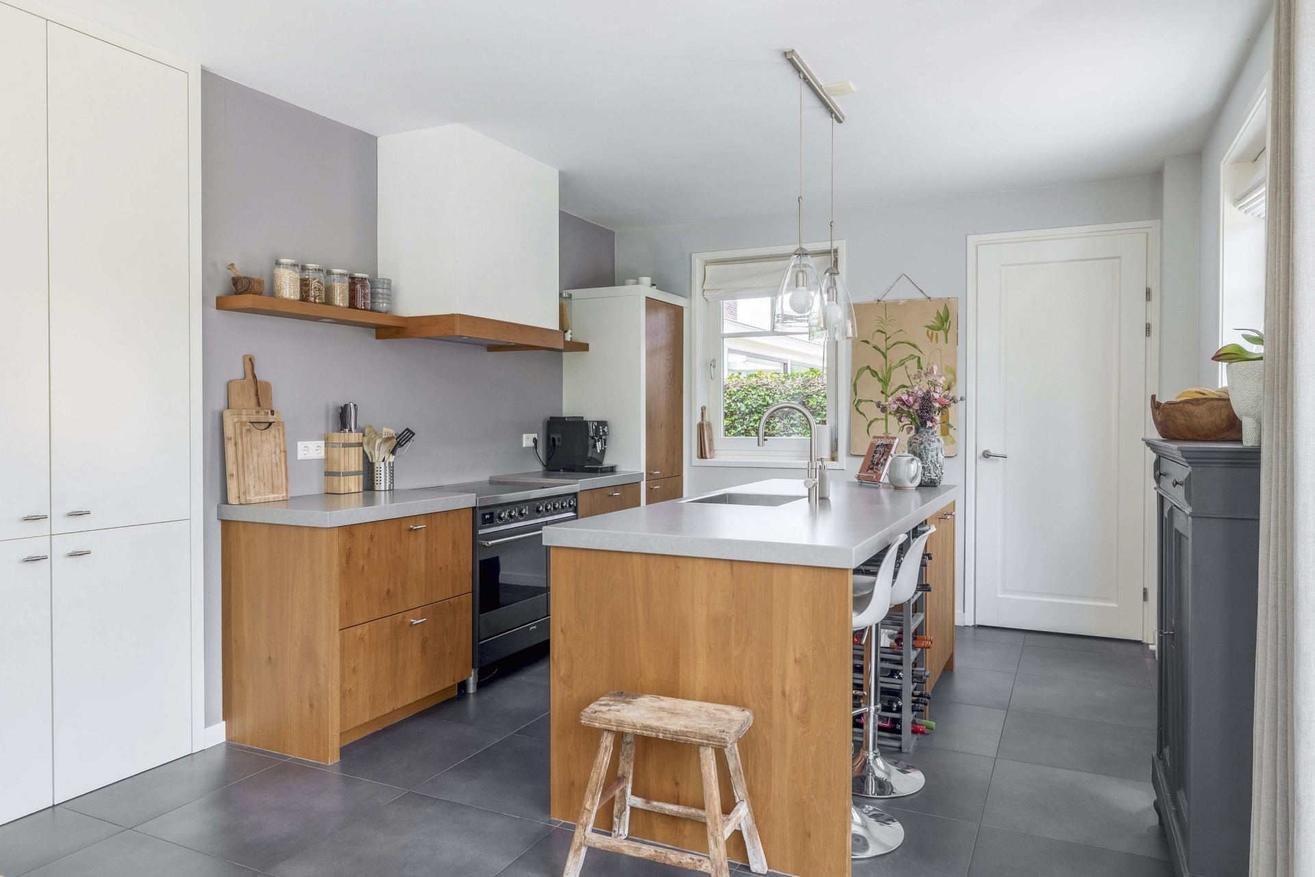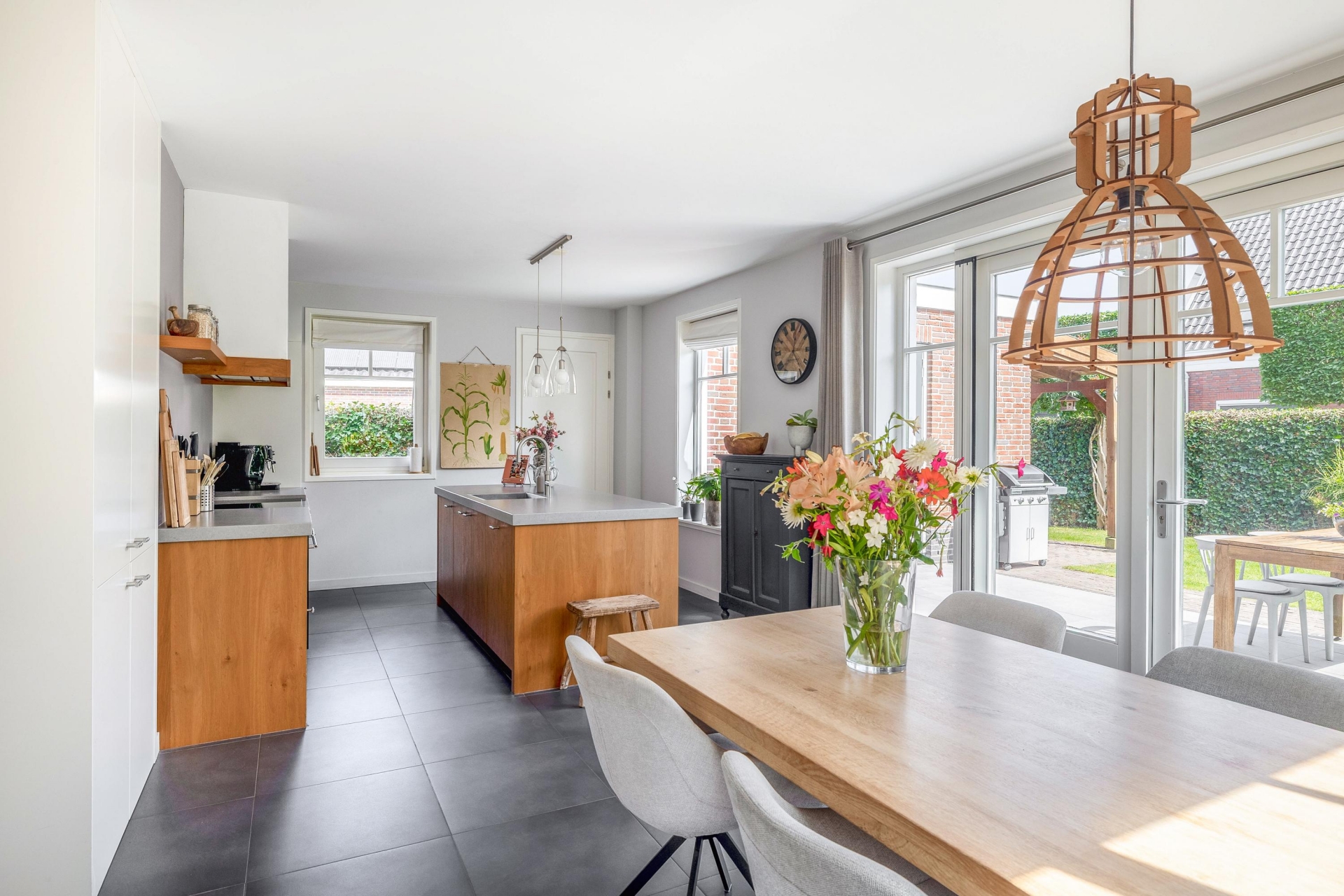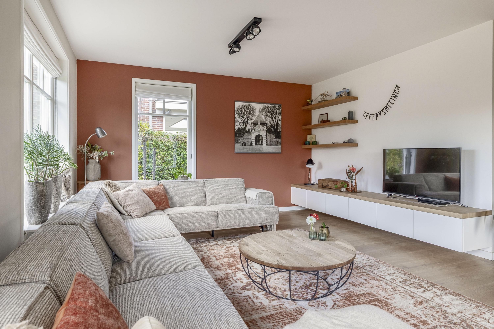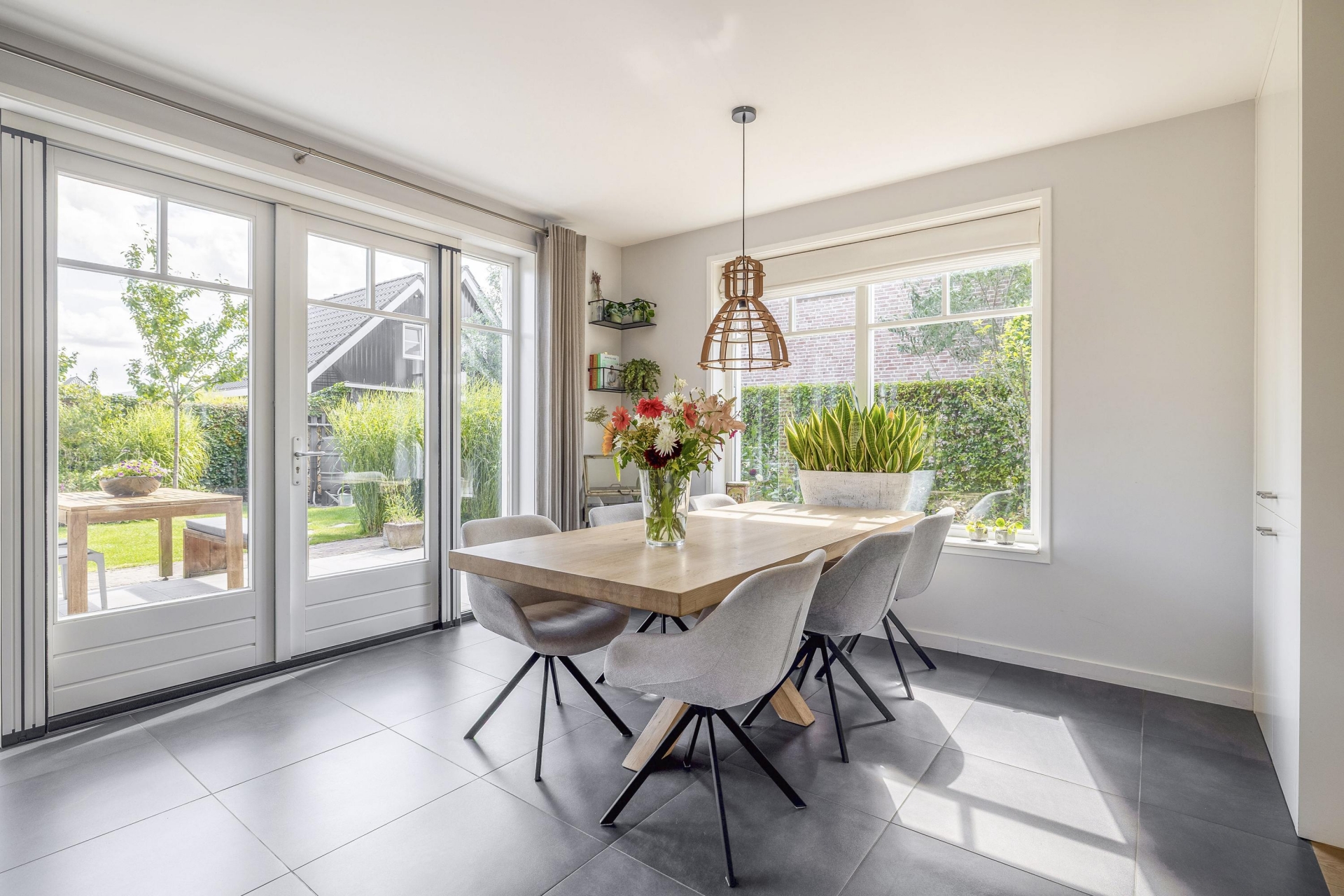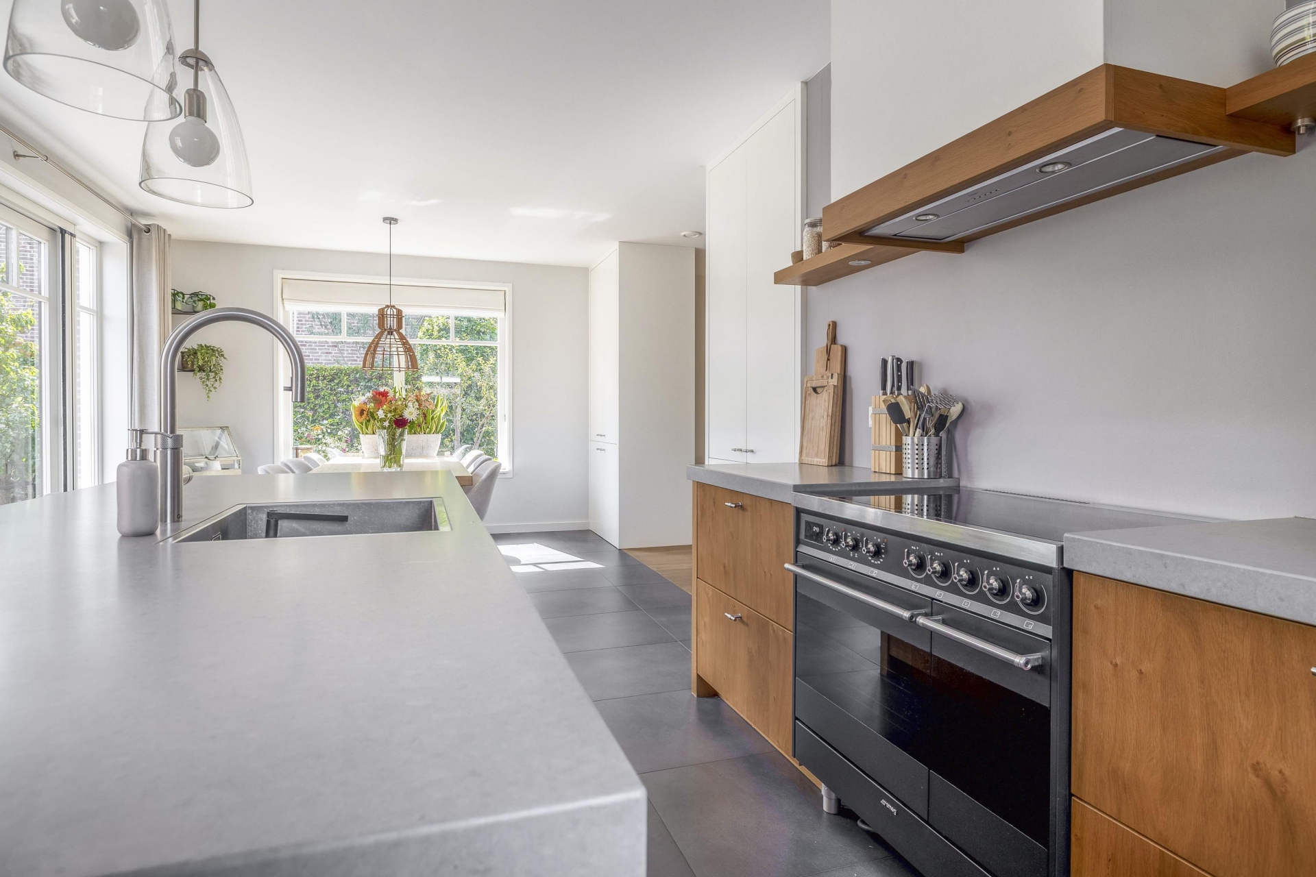 Wat direct opvalt als je binnenkomt? De ruimte en het licht. De woonkamer aan de voorzijde strekt zich uit over de volledige breedte van het huis en is ingericht met grote raampartijen aan meerdere zijden. Hierdoor komt het daglicht van alle kanten naar binnen. De eikenhouten vloer, strak gestucte wanden en warme kleuraccenten zorgen voor een huiselijke en moderne sfeer.