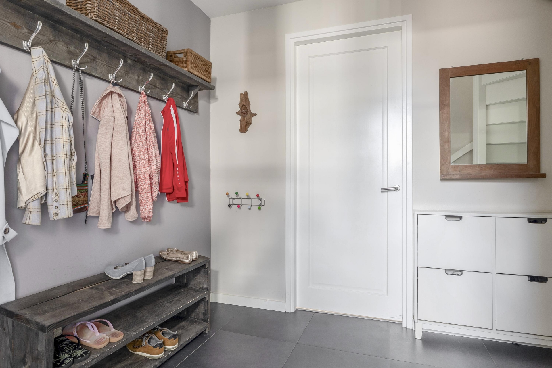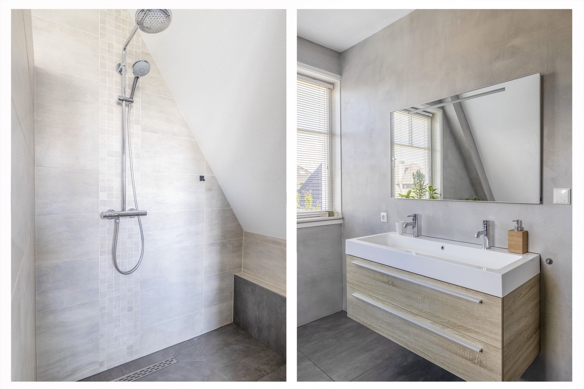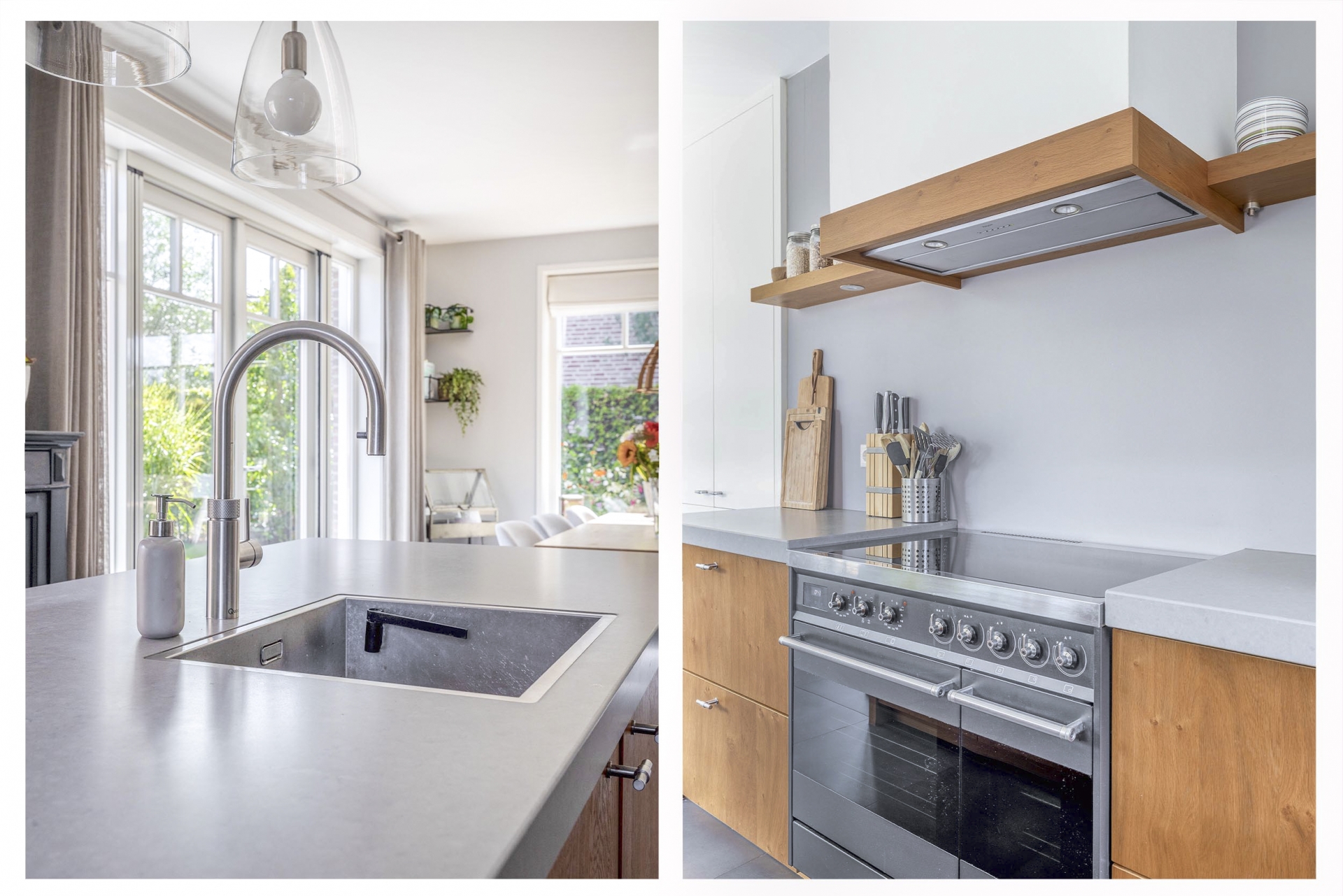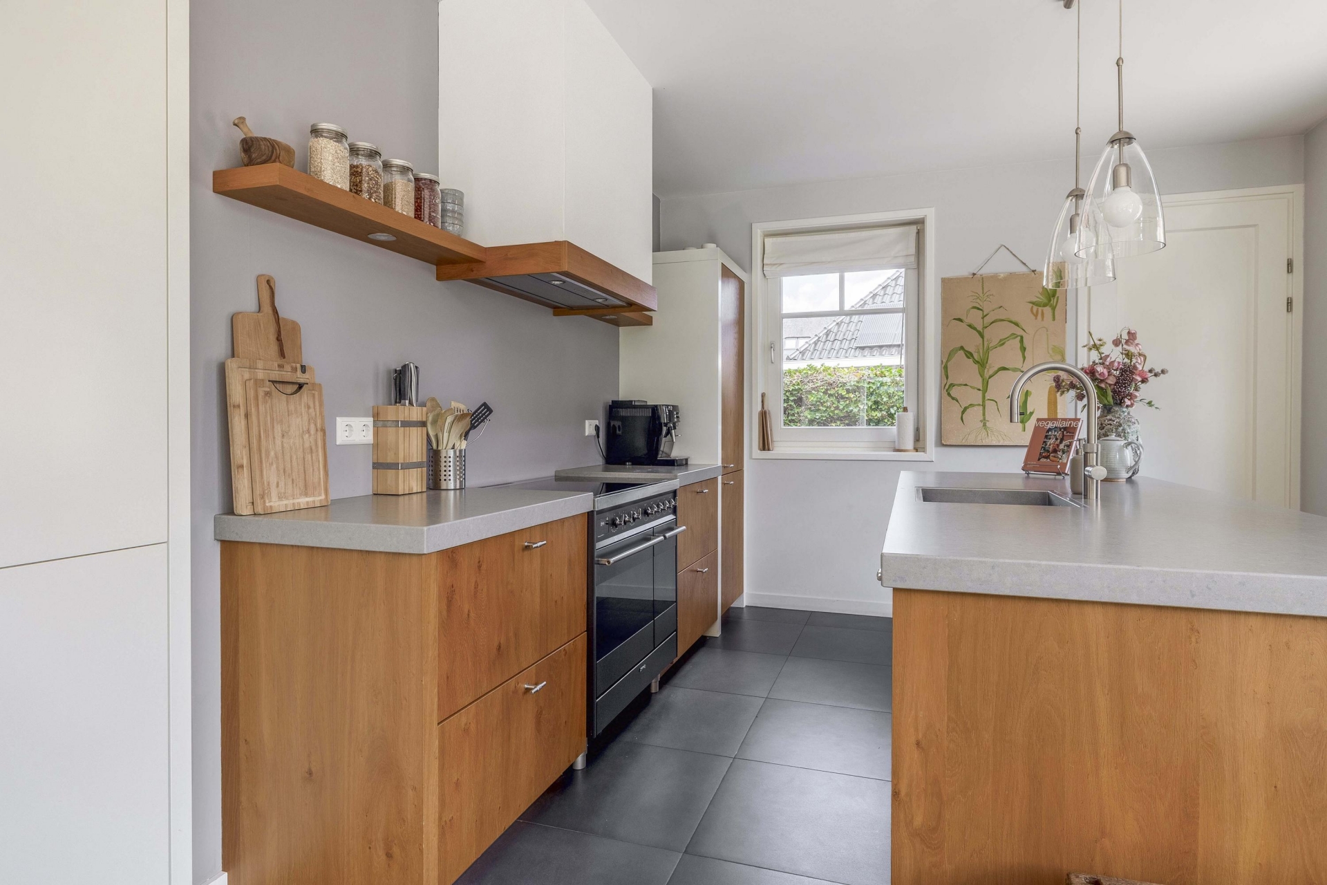 Wat direct opvalt als je binnenkomt? De ruimte en het licht. De woonkamer aan de voorzijde strekt zich uit over de volledige breedte van het huis en is ingericht met grote raampartijen aan meerdere zijden. Hierdoor komt het daglicht van alle kanten naar binnen. De eikenhouten vloer, strak gestucte wanden en warme kleuraccenten zorgen voor een huiselijke en moderne sfeer.
