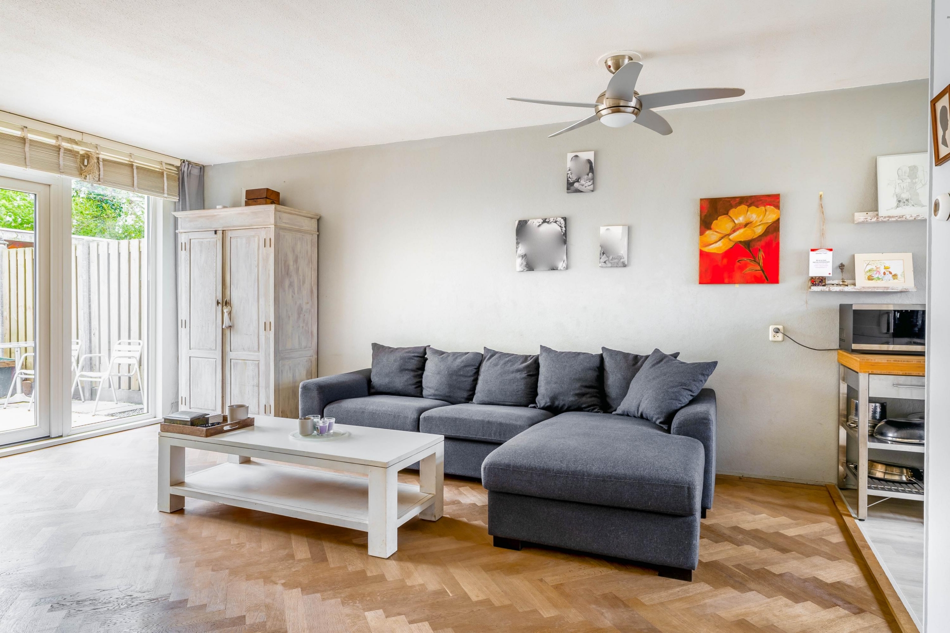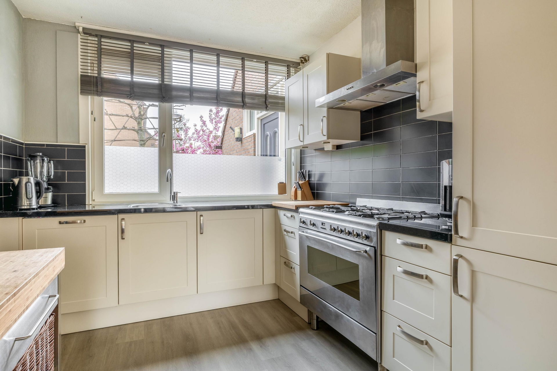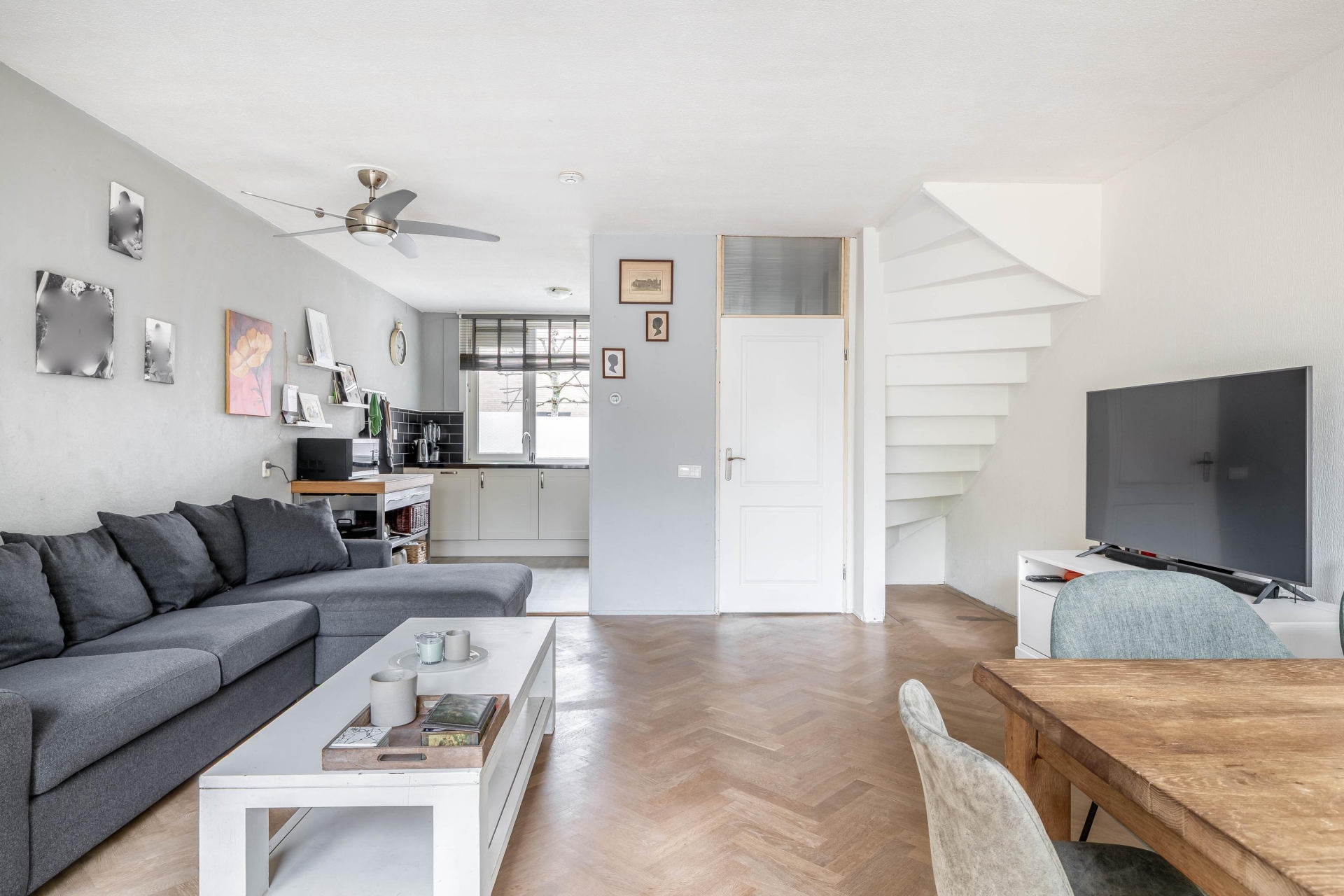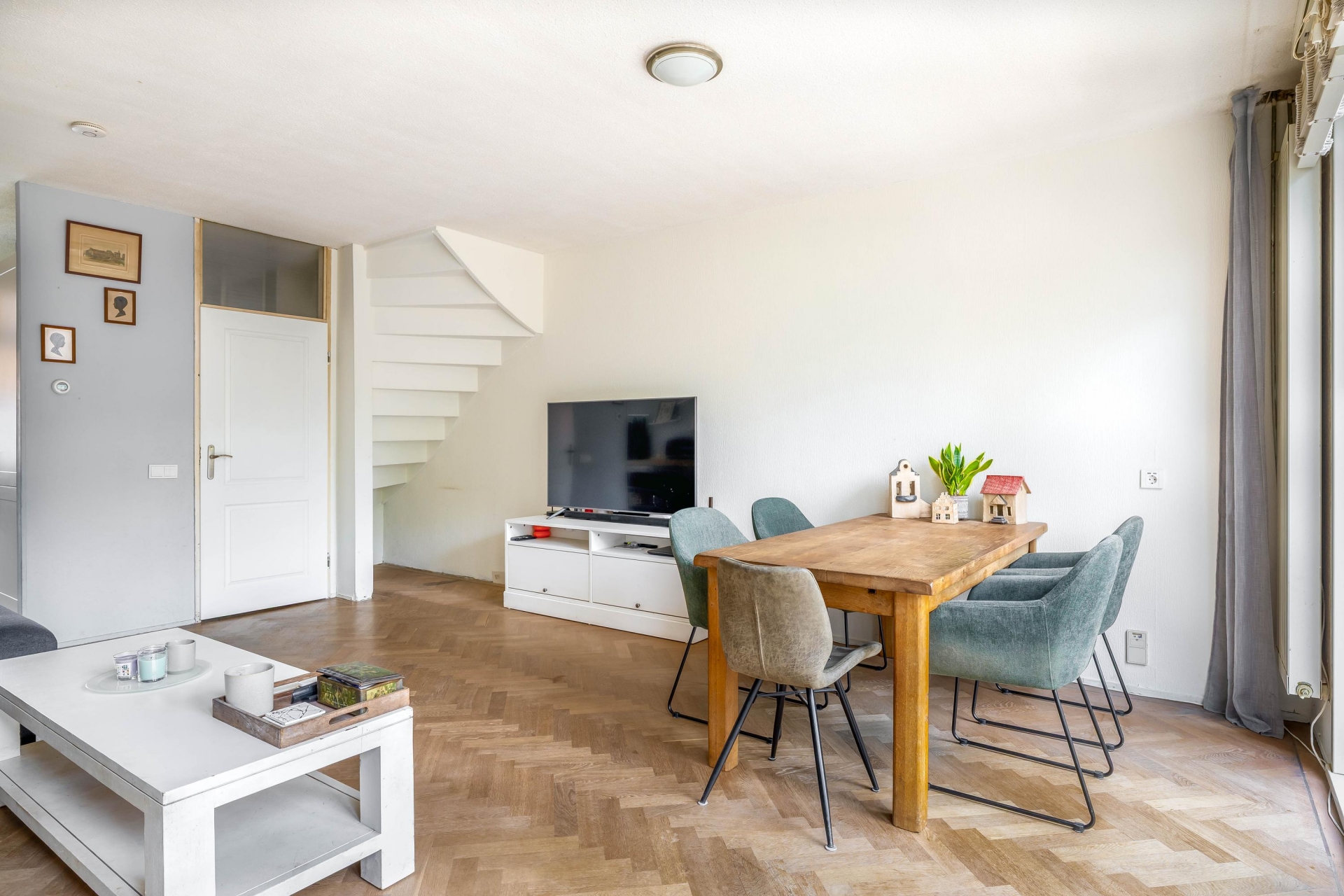 Wat direct opvalt bij dit huis is de fijne breedte en de hoeveelheid licht. De woonkamer aan de achterzijde is ruim opgezet en biedt met circa 28 m² alle ruimte voor een comfortabele zithoek en een grote eettafel. Dankzij de brede pui naar de tuin valt het daglicht hier rijkelijk naar binnen, wat zorgt voor een prettige en open sfeer.