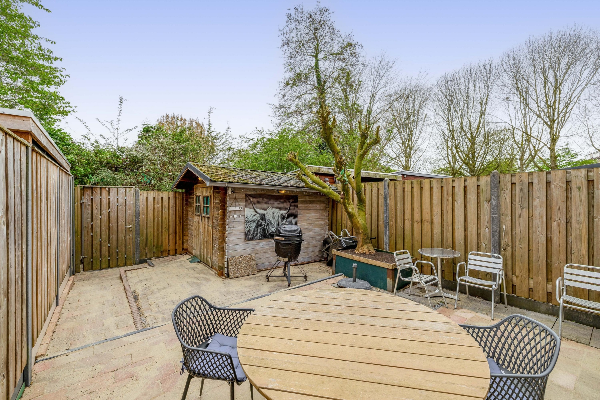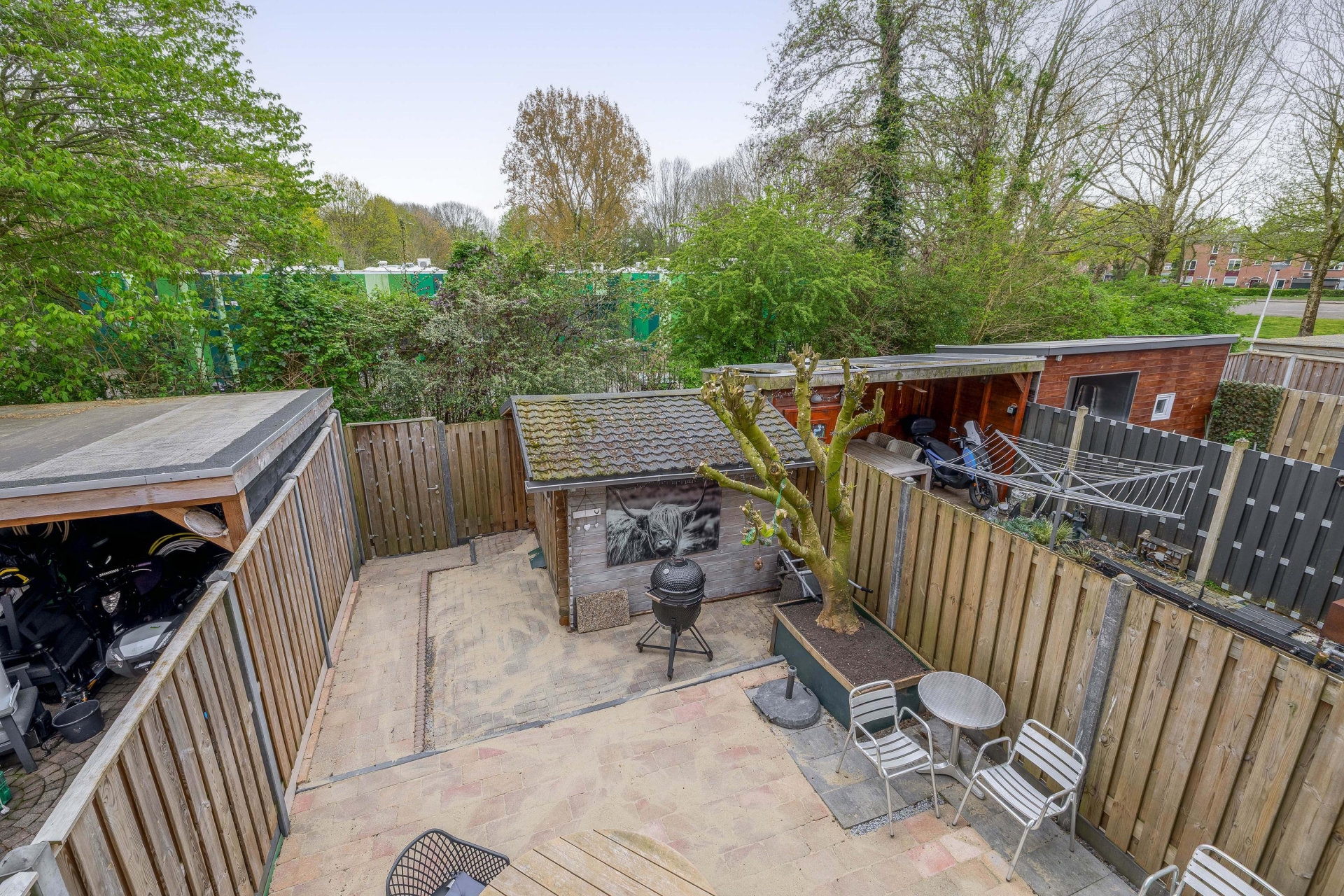 Achterin de tuin bevinden zich een extra houten schuur, ideaal voor extra opslag. Daarnaast is er een handige achterom aanwezig.