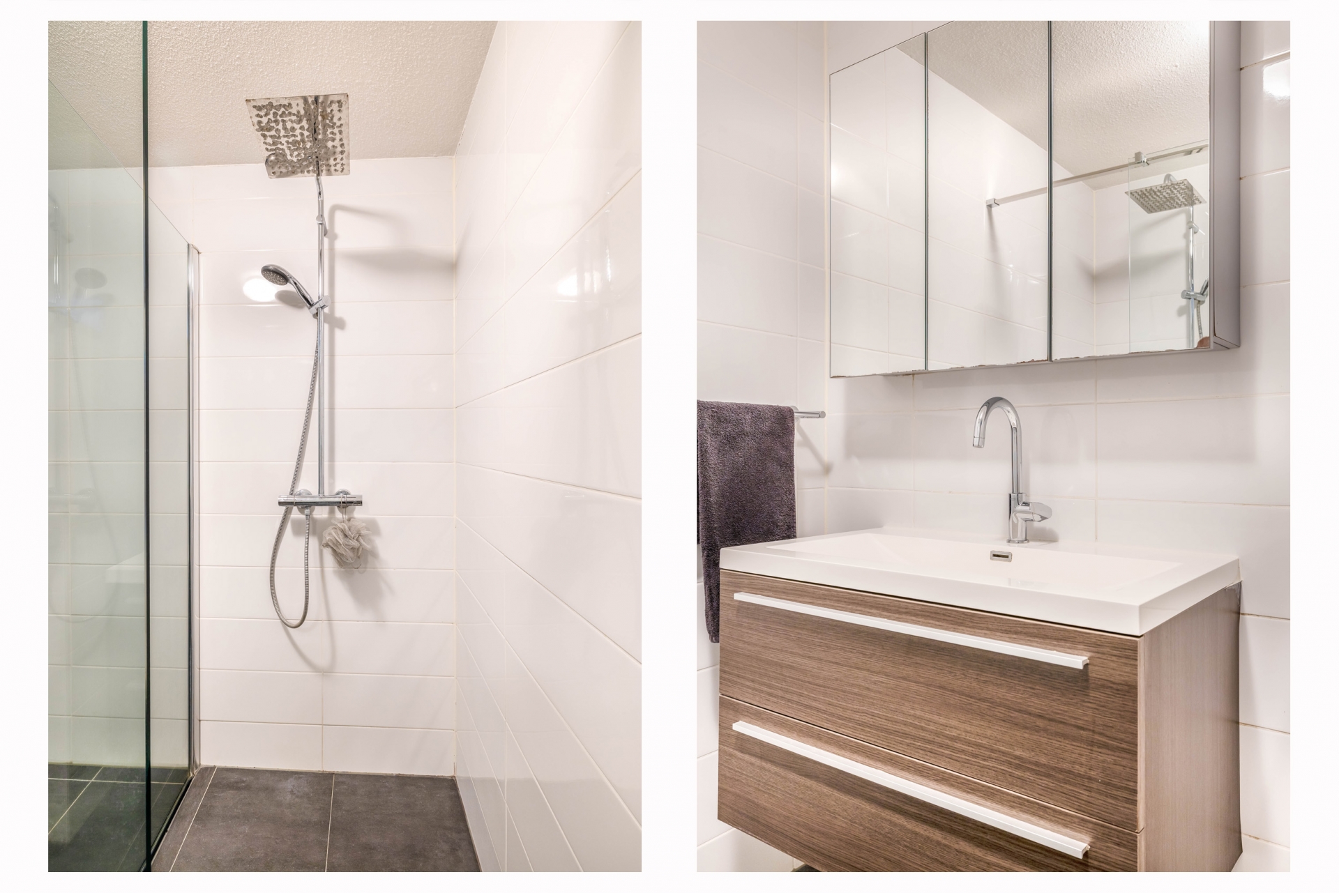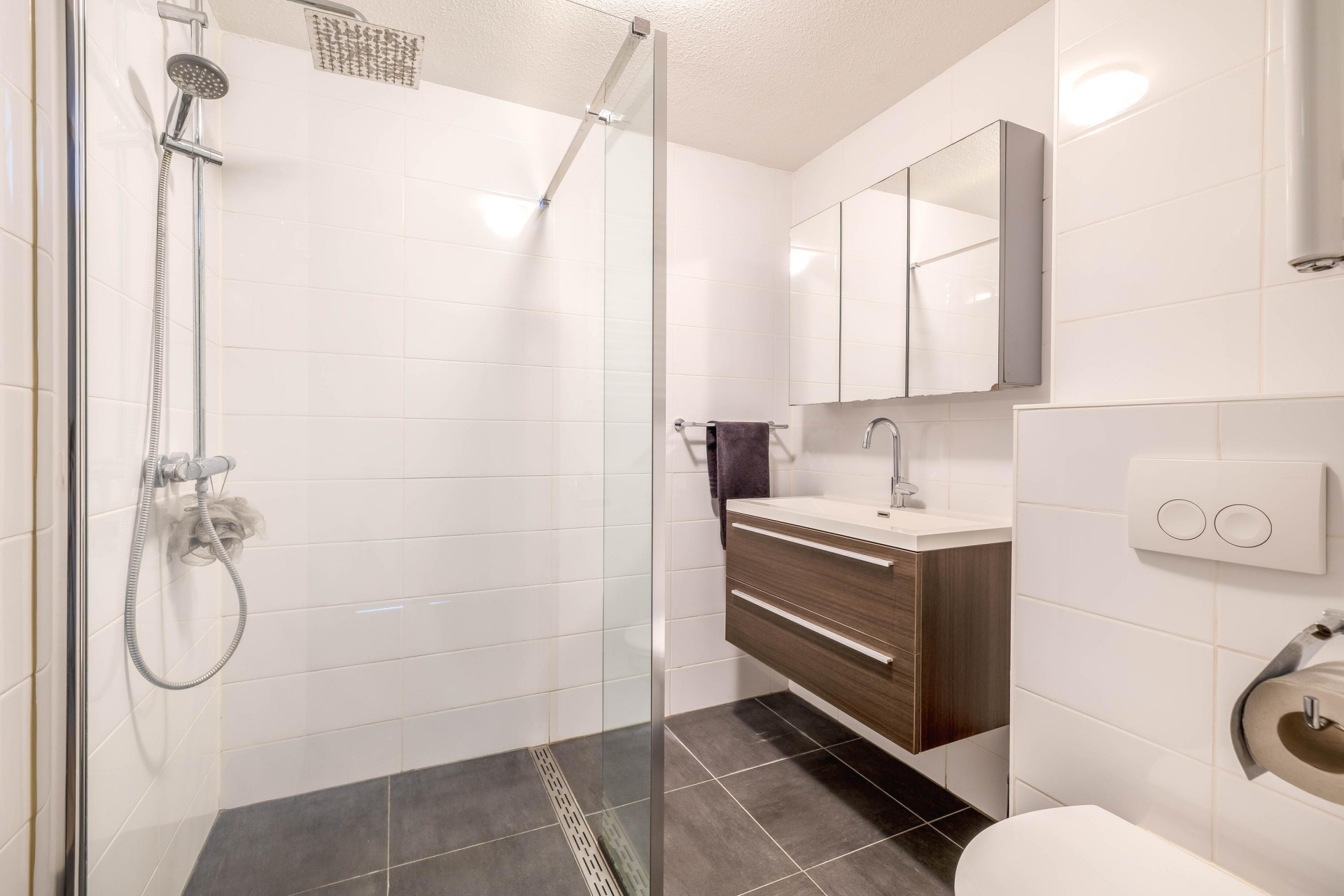 De badkamer is modern uitgevoerd en voorzien van een inloopdouche, wastafelmeubel en een toilet. De afwerking is strak en tijdloos, waardoor je hier weinig omkijken naar hebt.