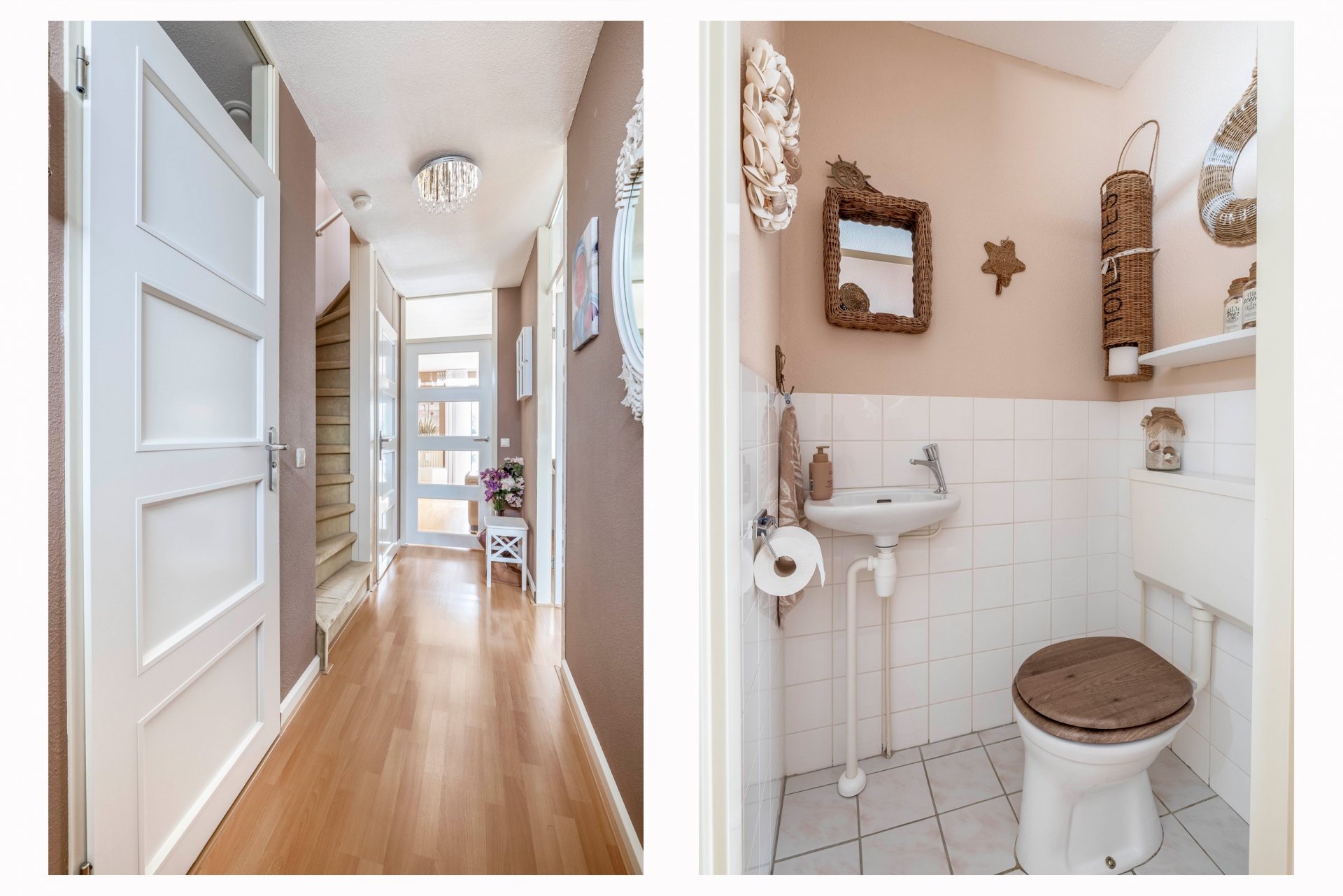 Via de ruime entree heb je toegang tot alle vertrekken. Hier is voldoende ruimte voor een garderobe en bevindt zich de meterkast. Het toilet is separaat en voorzien van een fonteintje. In de hal vind je tevens de trapopgang met praktische trapkast en de toegang tot de woonkamer en keuken.