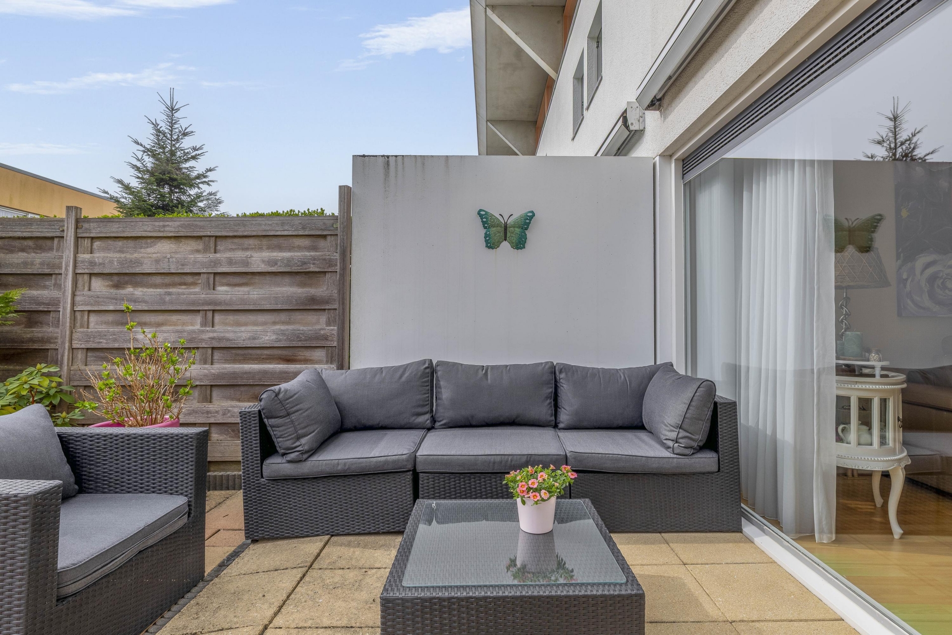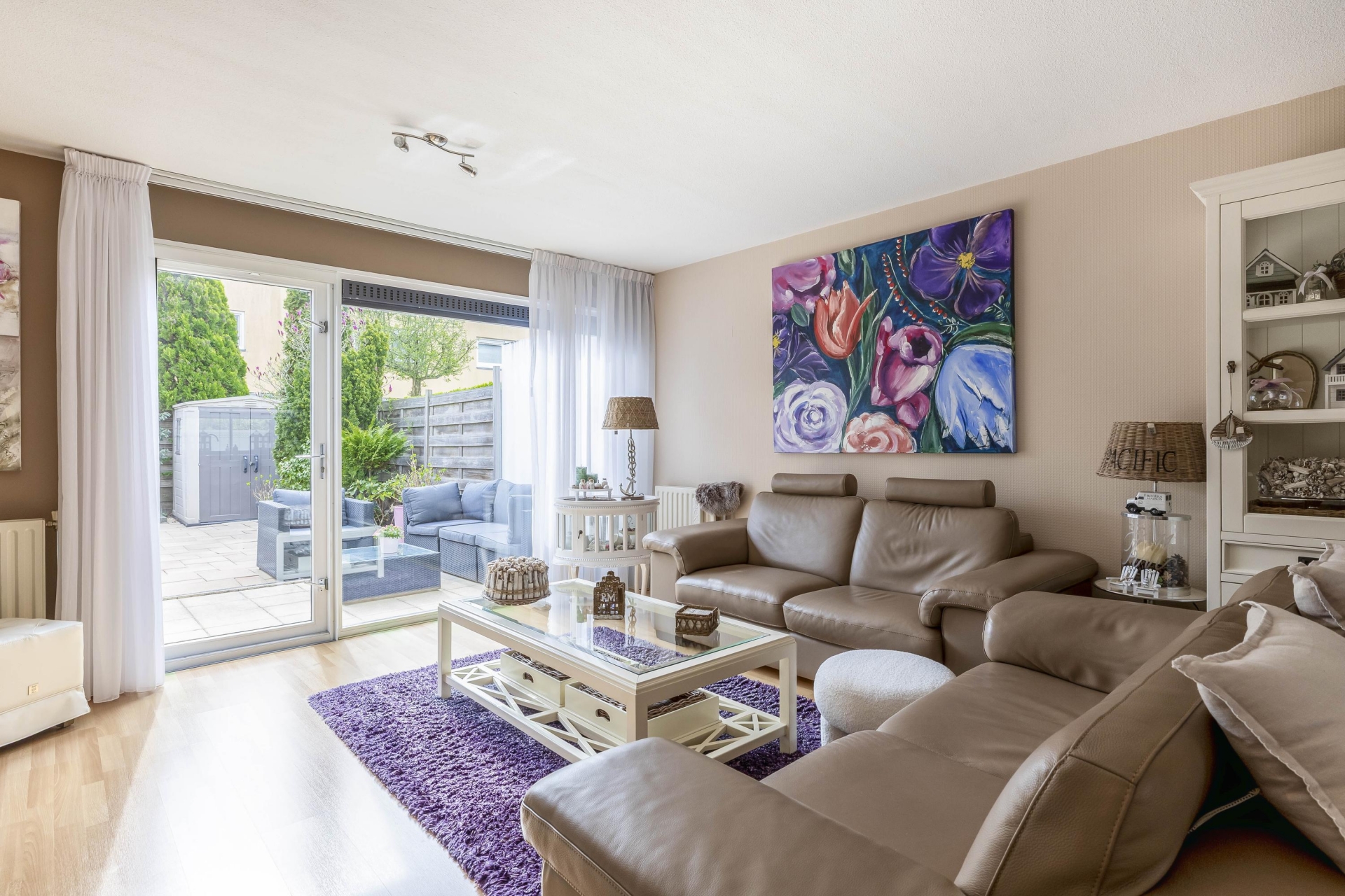 De lichte woonkamer sluit naadloos aan op de keuken en wordt gekenmerkt door grote raampartijen, waardoor er veel natuurlijk licht binnenvalt. Vanuit de woonkamer heb je toegang tot de zonnige achtertuin op het zuiden, die tevens beschikt over een achterom.