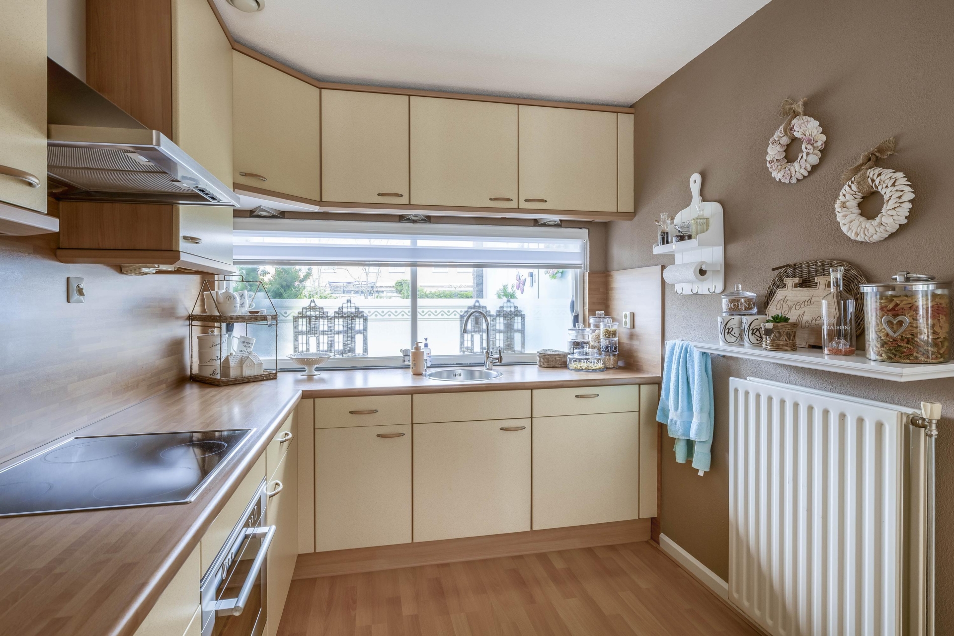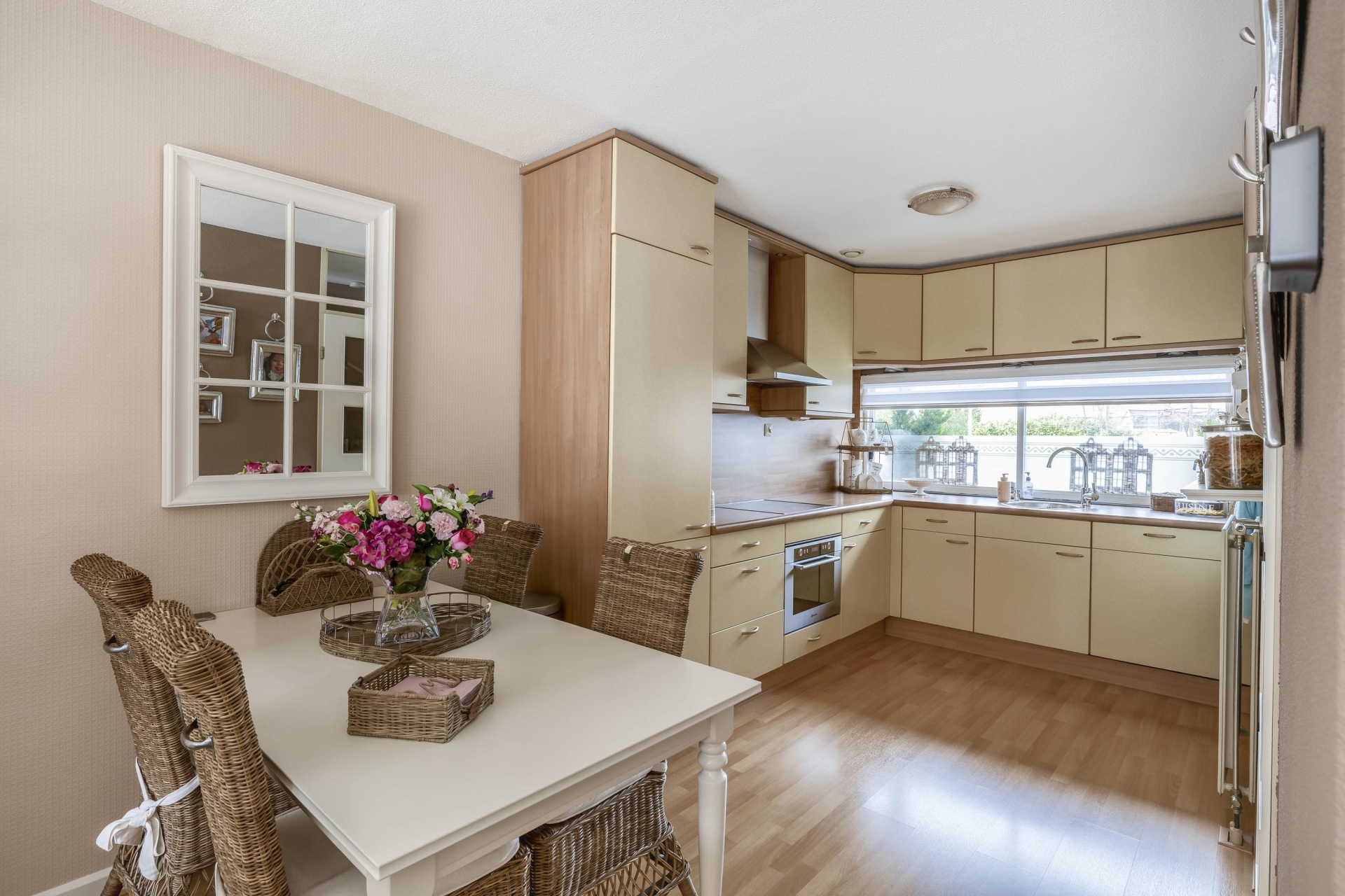 De keuken is aan de voorzijde van de woning gelegen en opgesteld in een L-vorm. Deze is voorzien van diverse inbouwapparatuur en biedt voldoende werk- en opbergruimte.