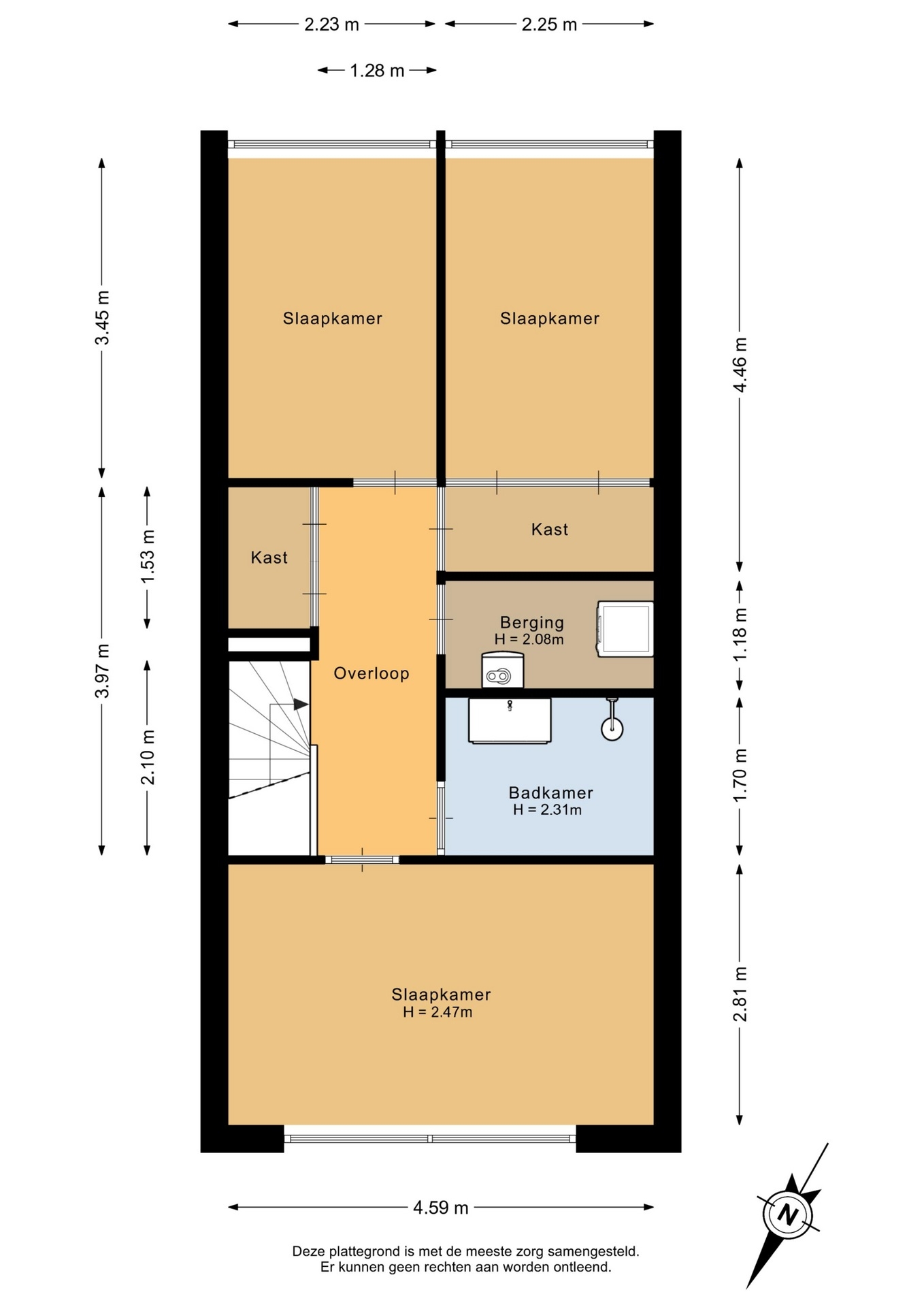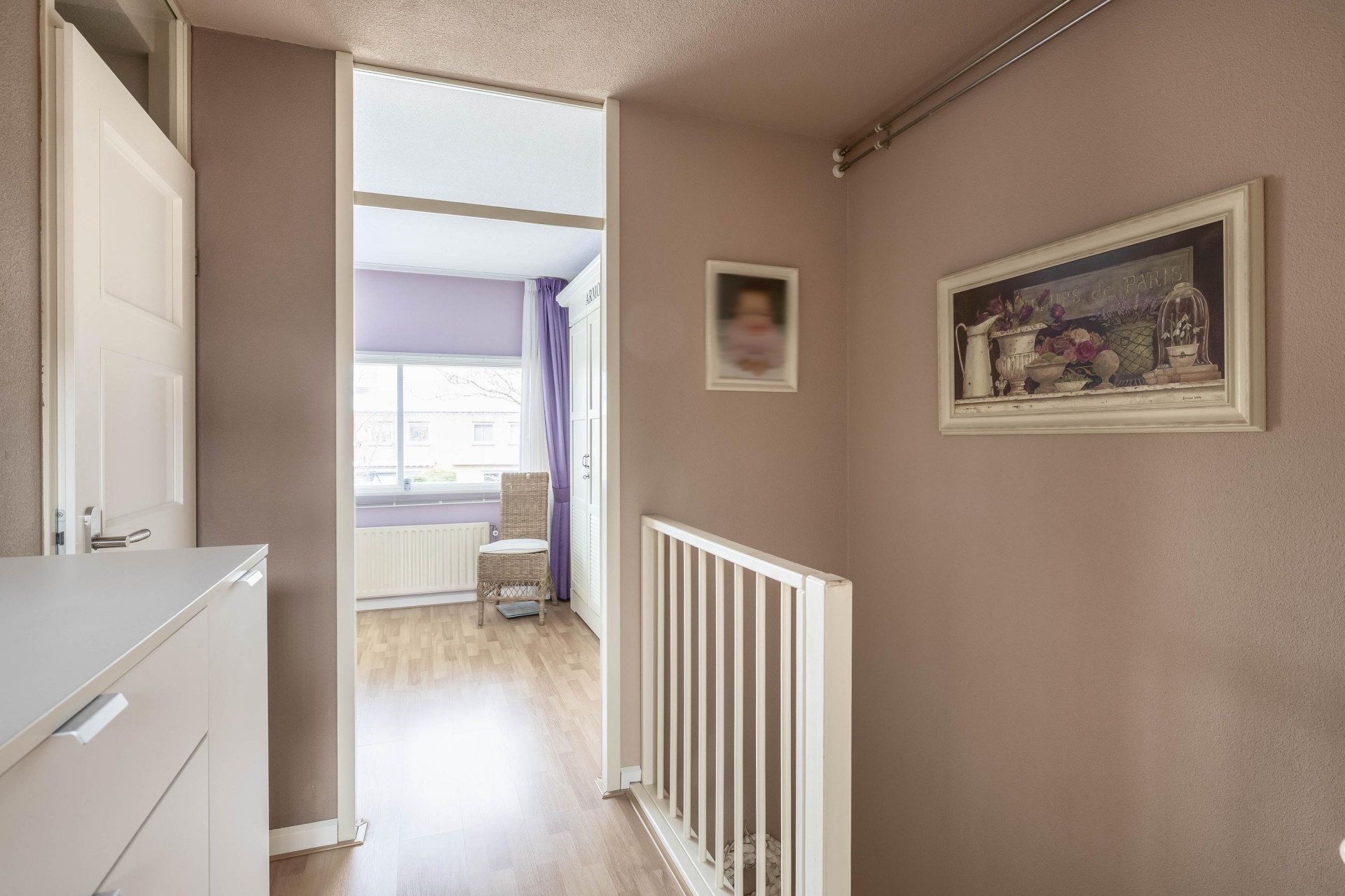 De overloop geeft toegang tot alle vertrekken. Aan de achterzijde bevinden zich twee slaapkamers van circa 10 m² en 8 m².