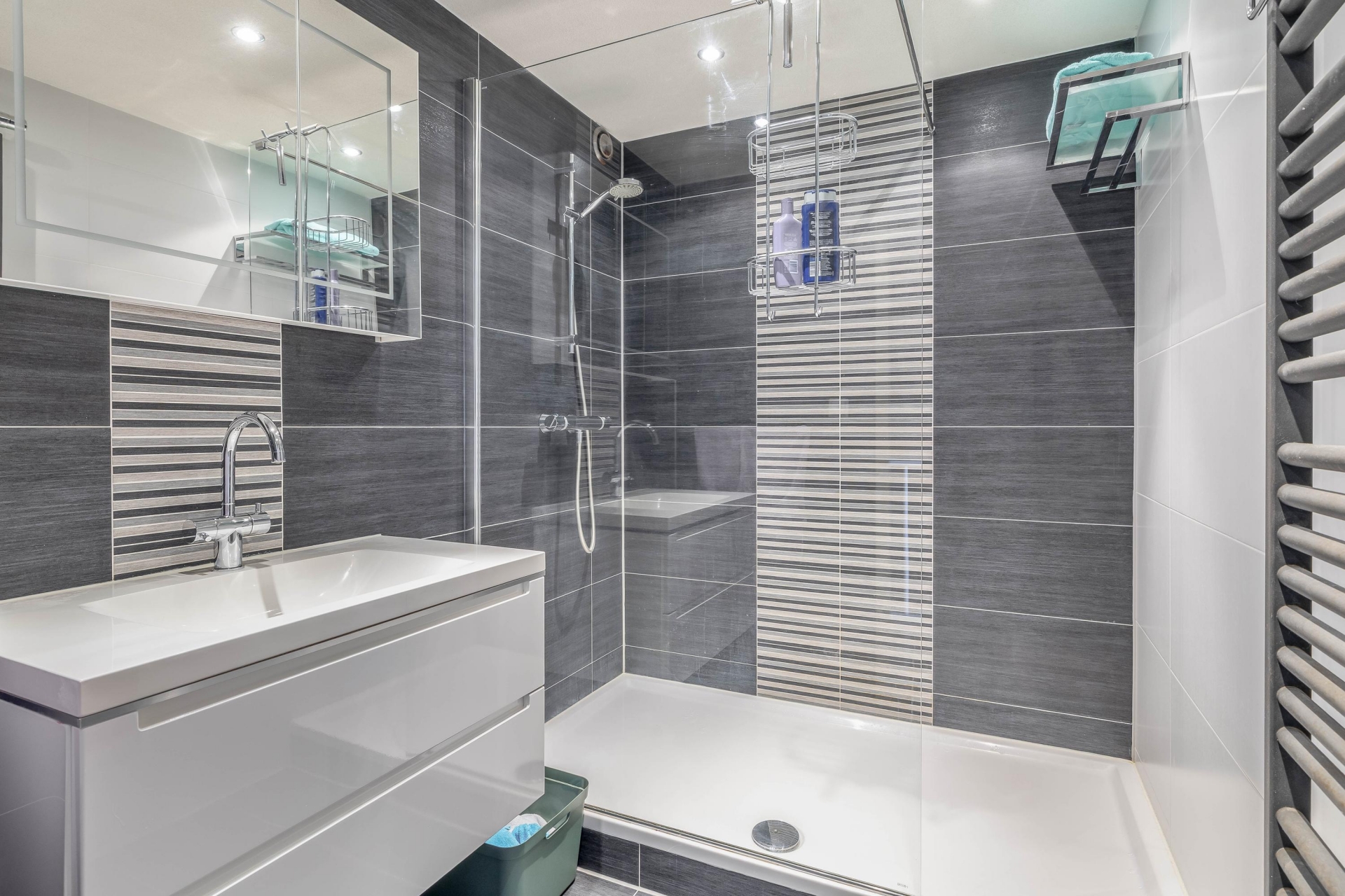 De centraal gelegen badkamer is ruim en verzorgd, en voorzien van een wastafelmeubel en een inloopdouche.