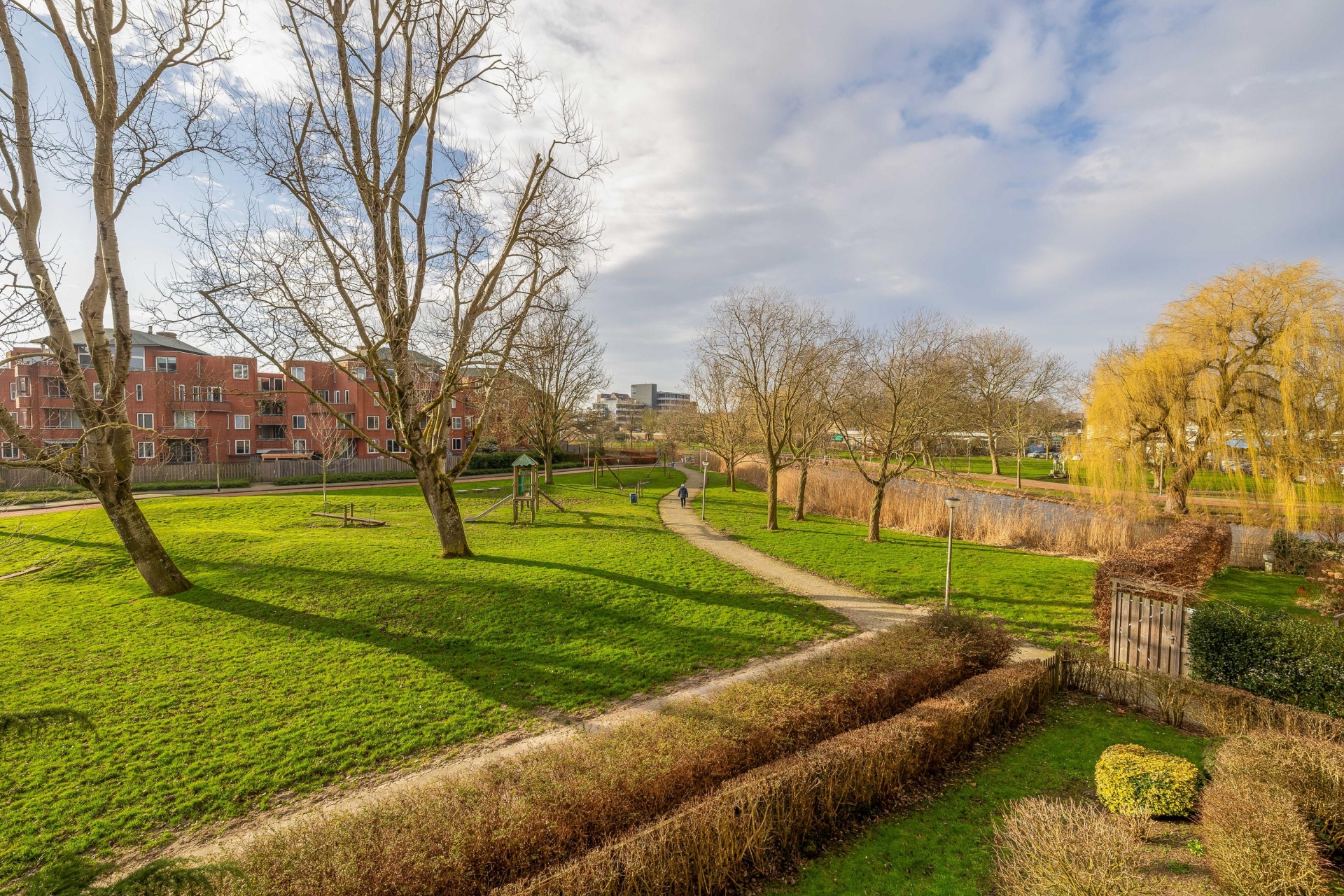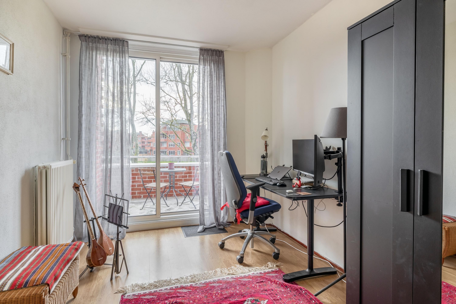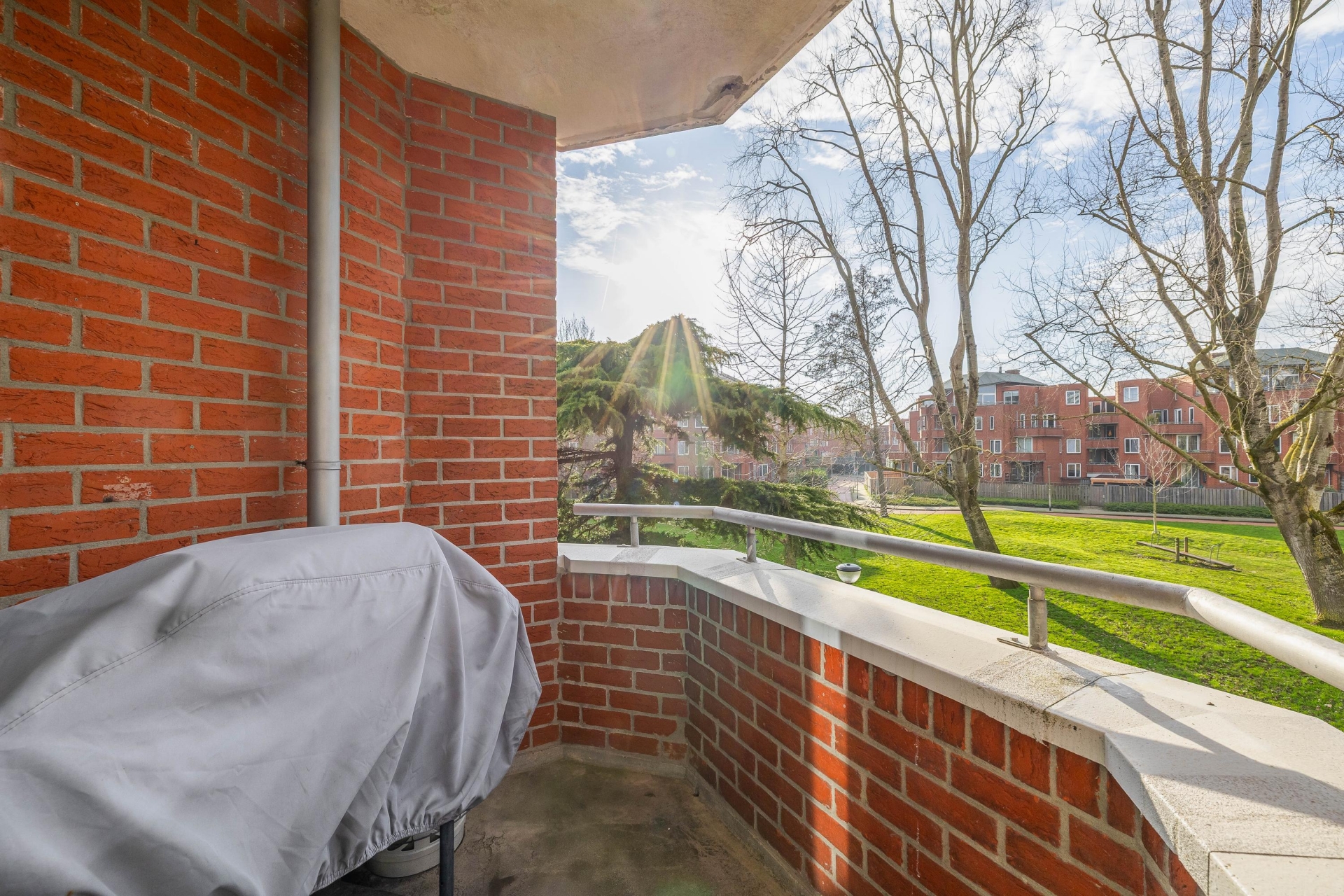 Vanuit de woonkamer stap je zo het balkon op. Hier zit je heerlijk beschut met uitzicht op groen.