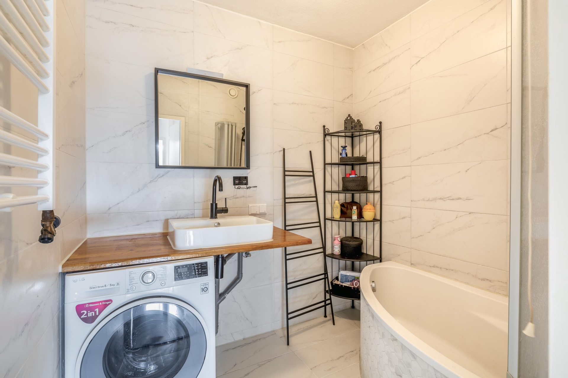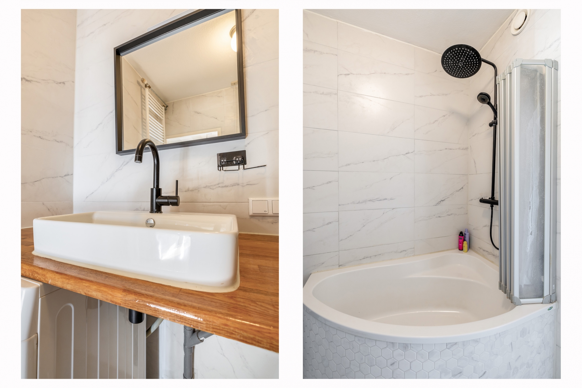 De badkamer is in 2020 gerenoveerd en strak afgewerkt met lichte wandtegels en een moderne uitstraling. Je beschikt hier over een ligbad met douche, een wastafel en aansluitingen voor de wasmachine. Alles is netjes afgewerkt, waardoor ook deze ruimte instapklaar is.