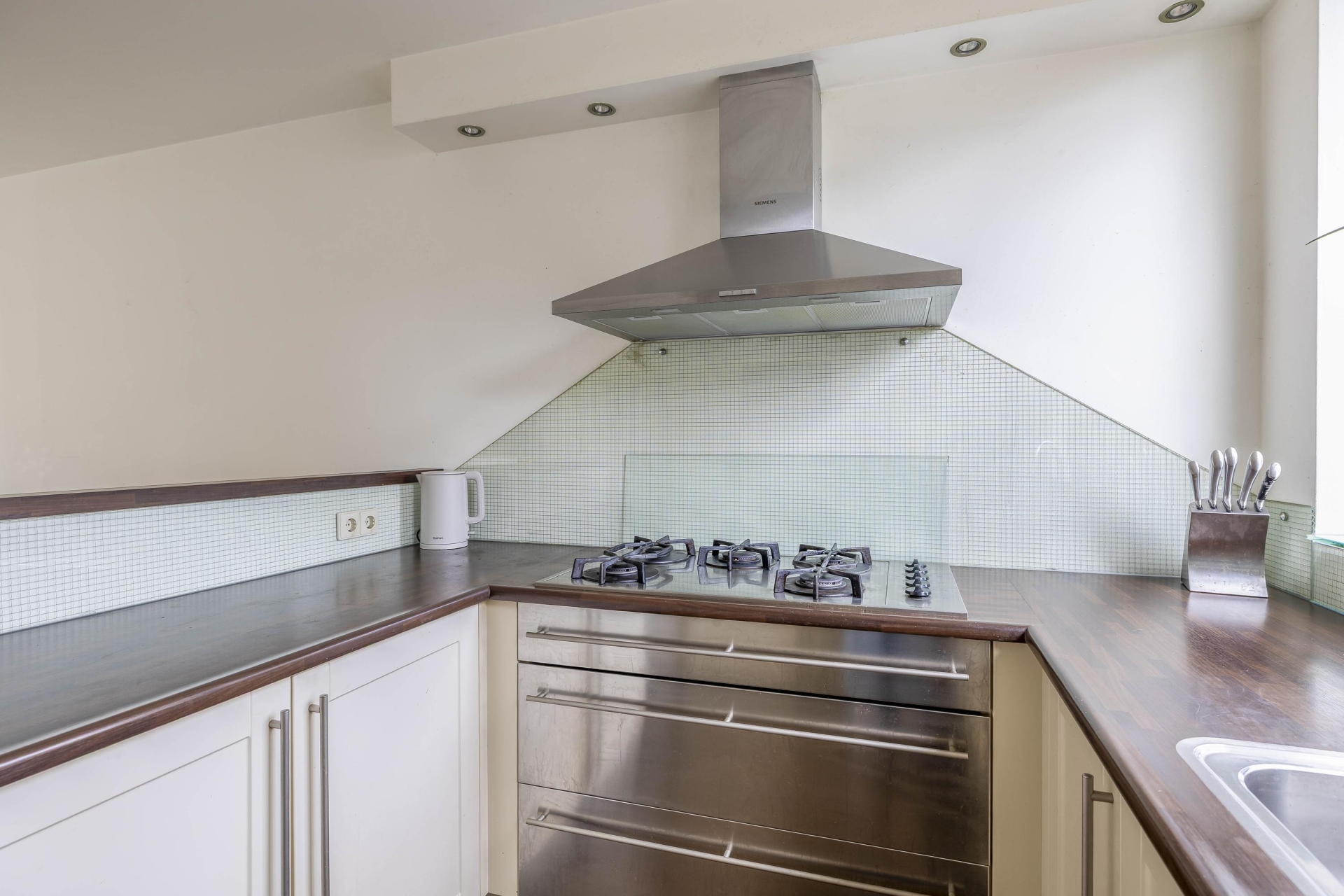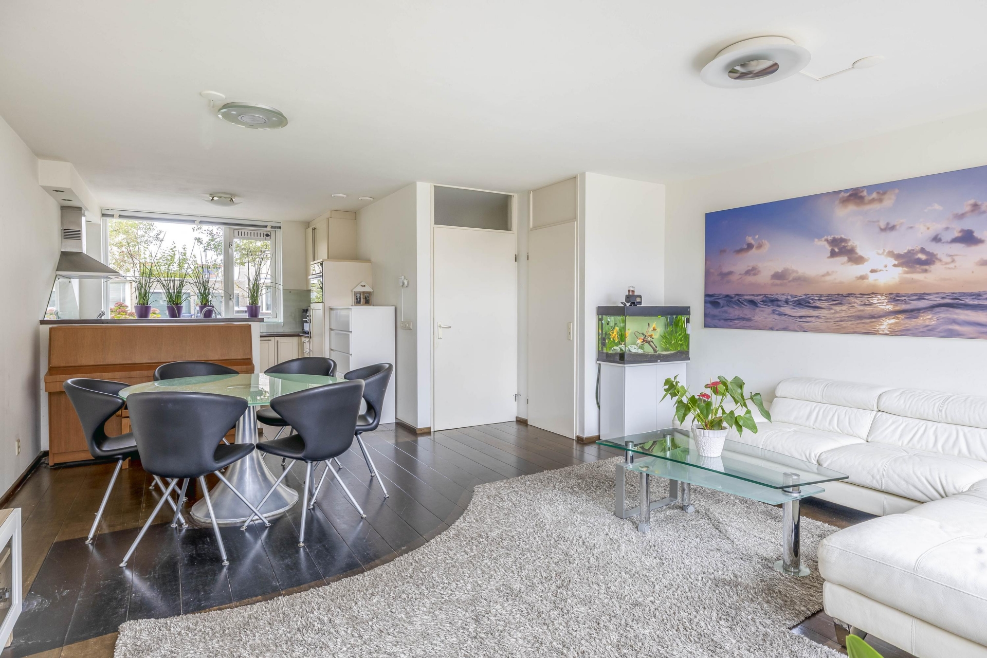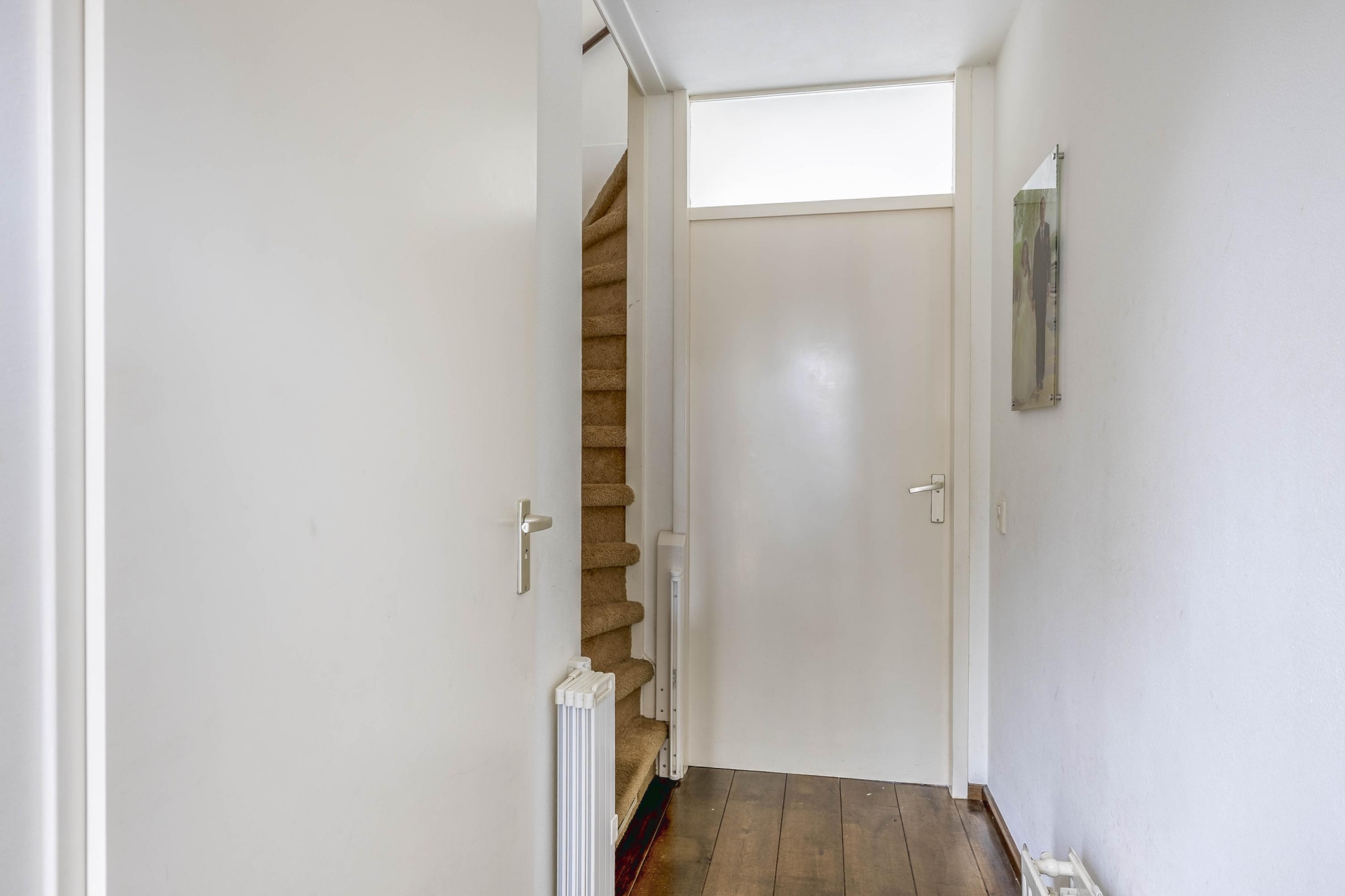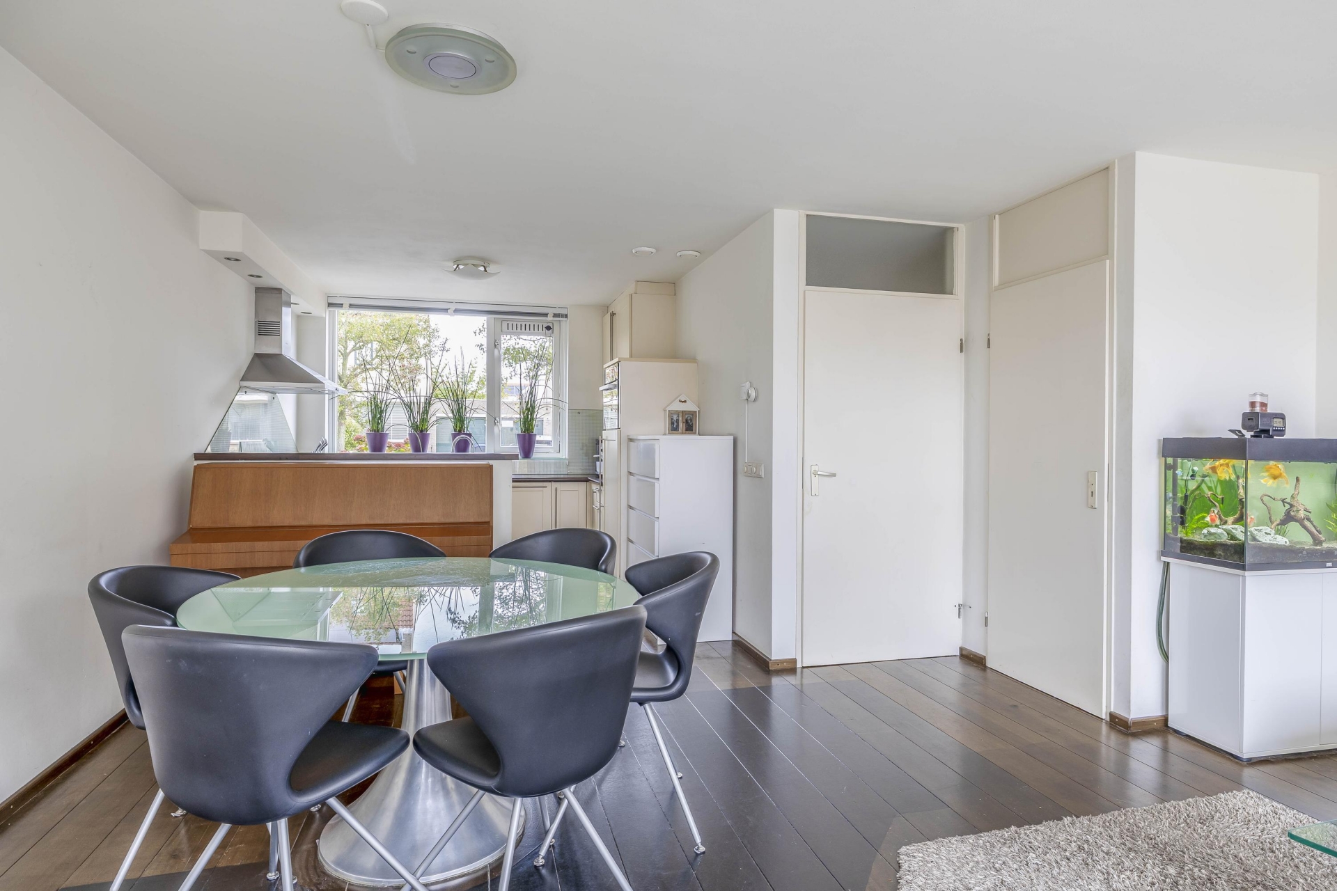 De begane grond biedt een prettige leefruimte met volop daglicht dankzij de grote raampartijen aan de achterzijde. De woonkamer voelt ruim en open aan, met een mooie doorloop naar de eethoek en tuin. De tuin is direct bereikbaar via een achterdeur, wat het buitenleven makkelijk maakt — ideaal voor zomerse etentjes of gewoon een kop koffie of glas wijn in de zon. Aan de voorzijde bevindt zich de halfopen keuken, functioneel ingedeeld en voorzien van de benodigde apparatuur. Deze is netjes onderhouden en goed bruikbaar. De combinatie van een doorzonindeling met een directe verbinding naar buiten maakt dit een fijne, praktische begane grond waar je je snel thuis zult voelen.