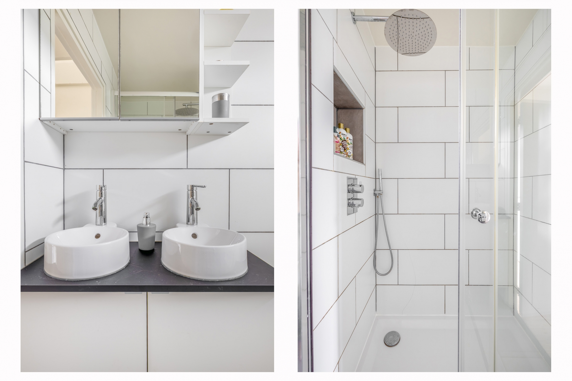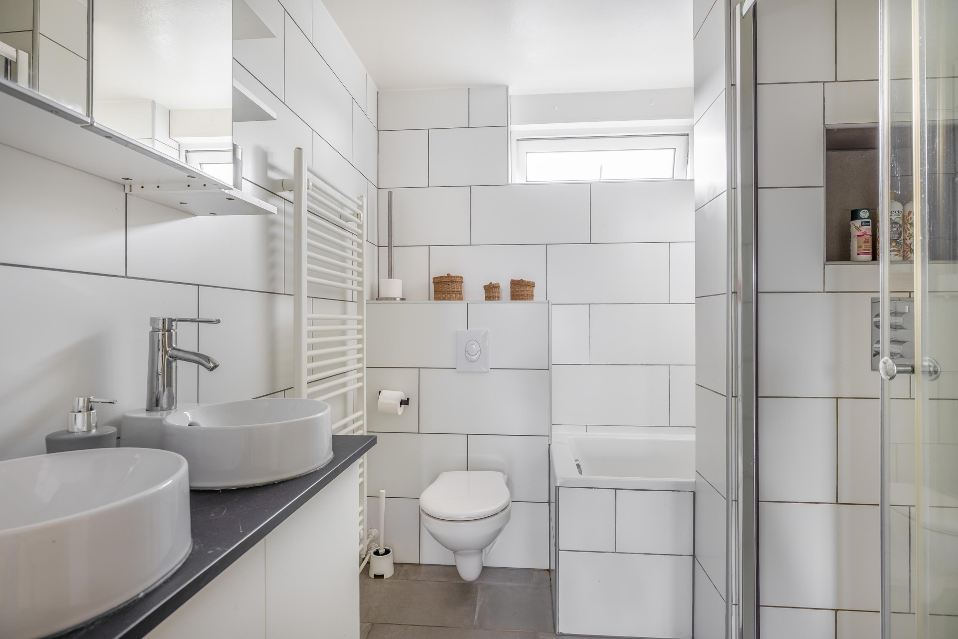 Overloop, 3 slaapkamers met laminaat en moderne badkamer uit 2018 met ligbad, inloopdouche, toilet, badkamermeubel met dubbele wastafel en geheel betegeld.