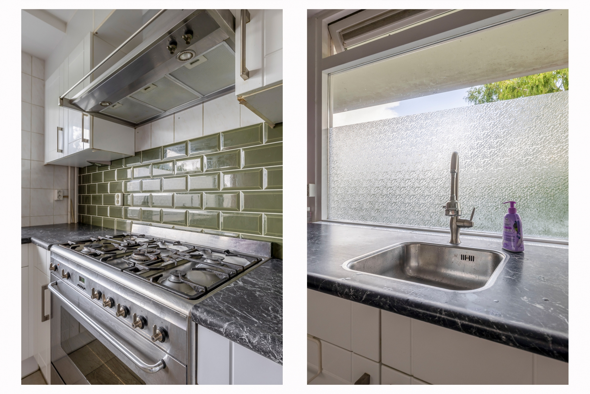 De half open keuken is royaal van opzet en biedt volop ruimte om lekker te koken en op te bergen. Dankzij het grote raam aan de voorzijde kook je hier met natuurlijk licht en uitzicht naar buiten. De keuken is voorzien van een robuust 5-pits gasfornuis met oven, een rvs-afzuigkap en veel kastruimte. De stijl is fris en tijdloos, met witte fronten en een donkeren aanrechtblad dat mooi combineert met de groene wandtegel.