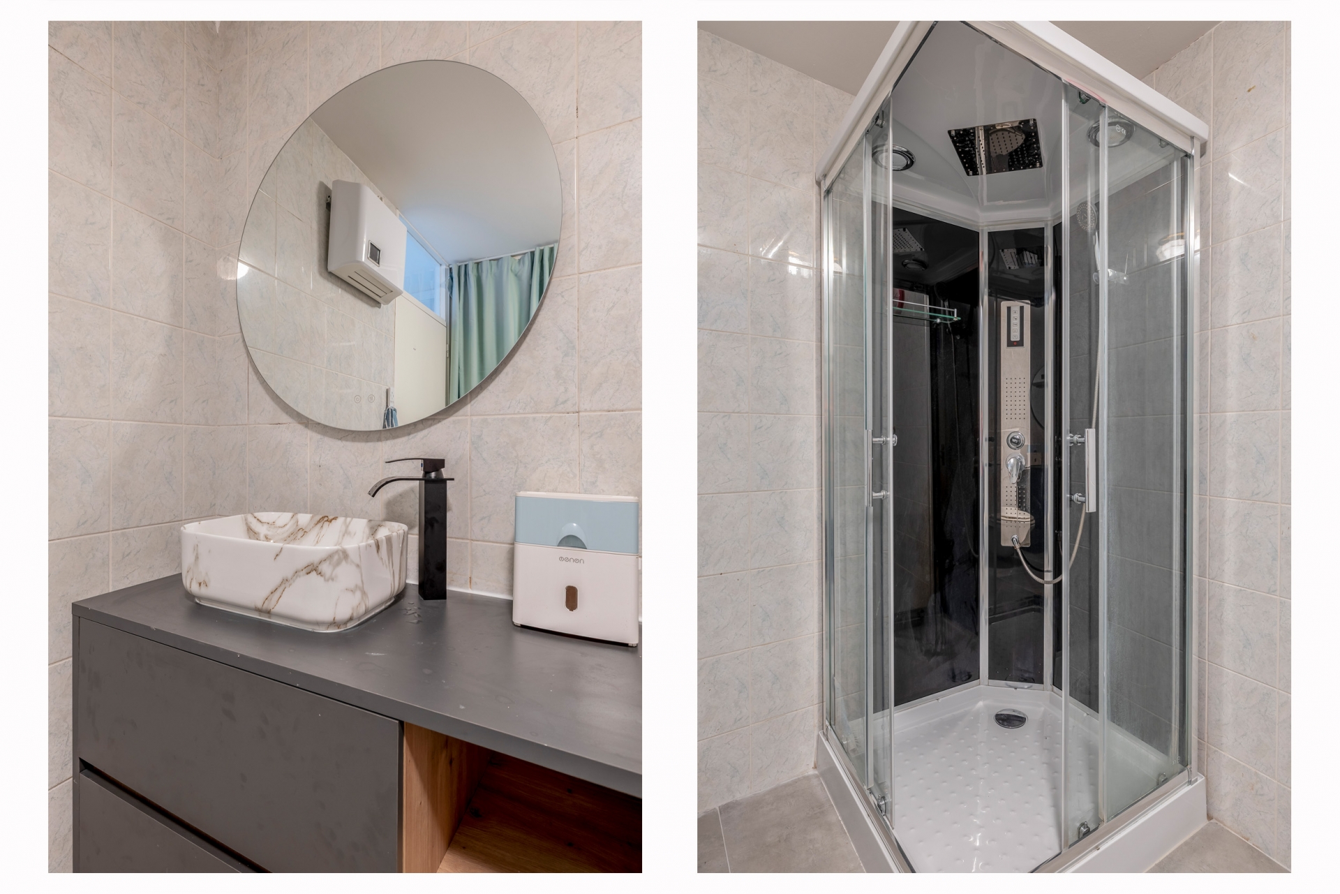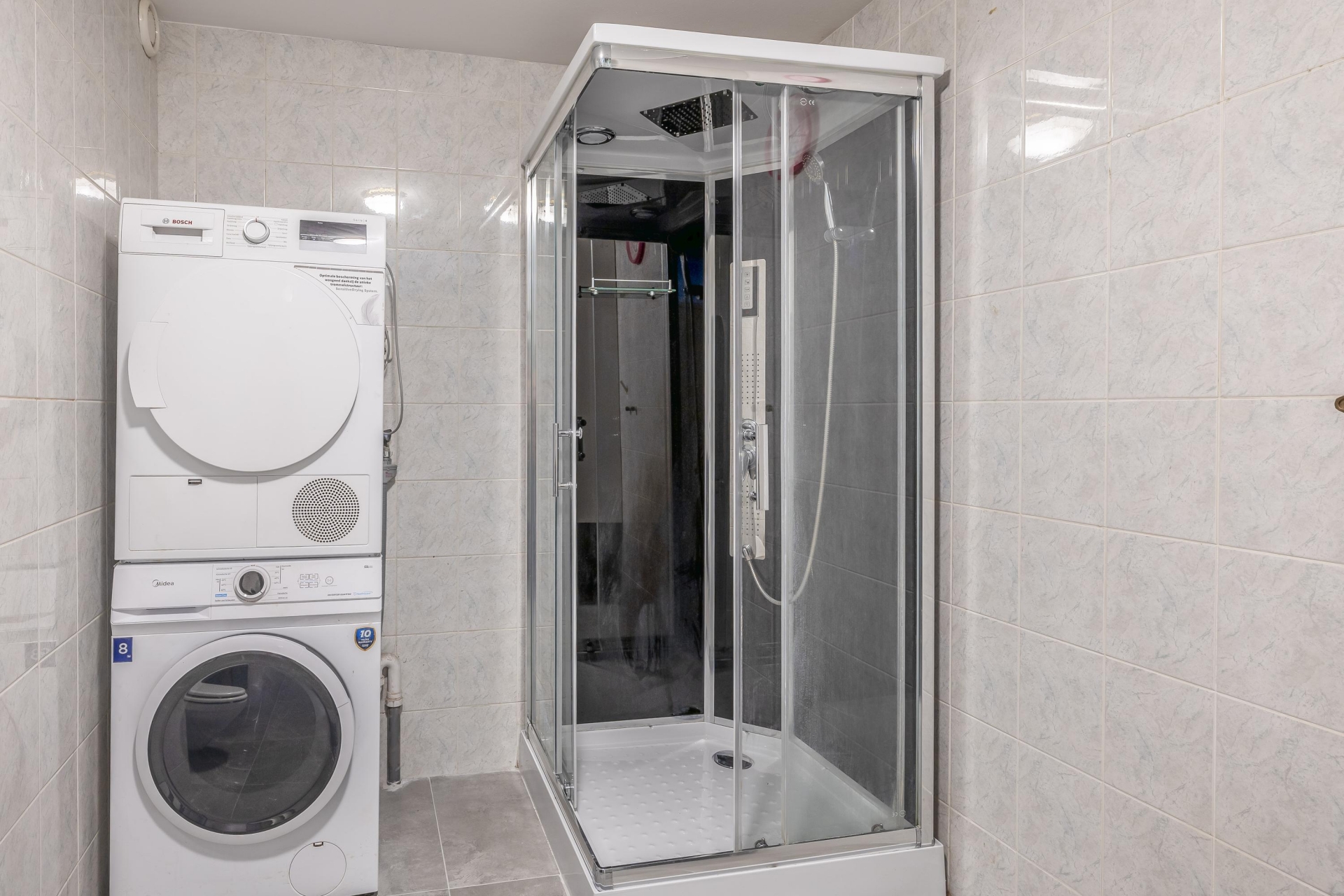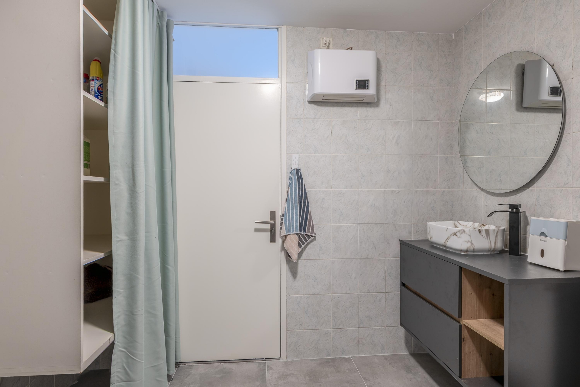 De badkamer is keurig en strak afgewerkt met lichte wandtegels en een moderne wastafel met bijpassend meubel. De douchecabine is voorzien van verschillende sproeistanden, ideaal voor een verfrissende start van de dag. Ook vind je hier het toilet en de aansluiting voor de wasmachine, zodat alles bij elkaar op één praktische plek zit.
