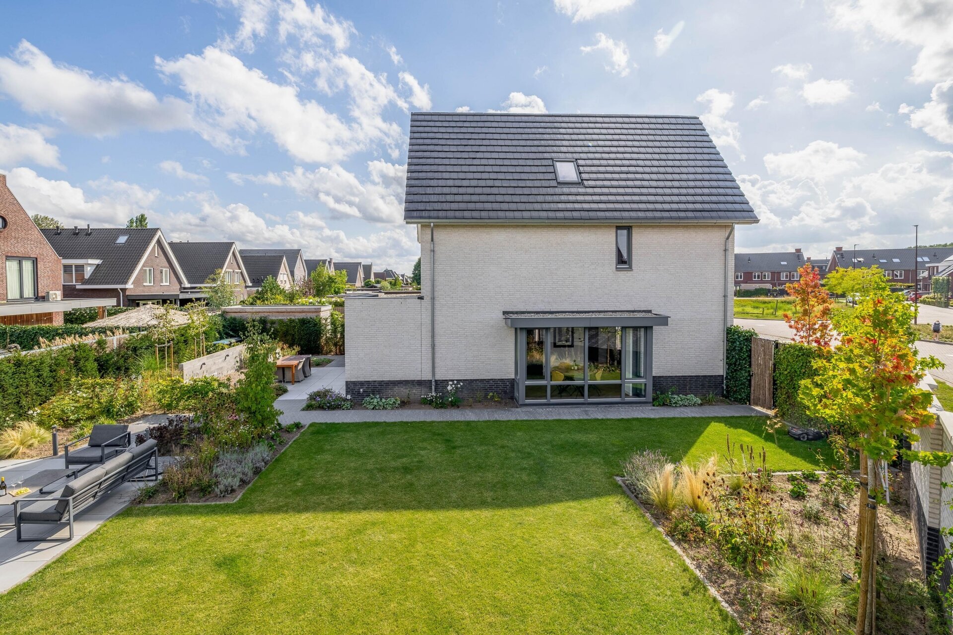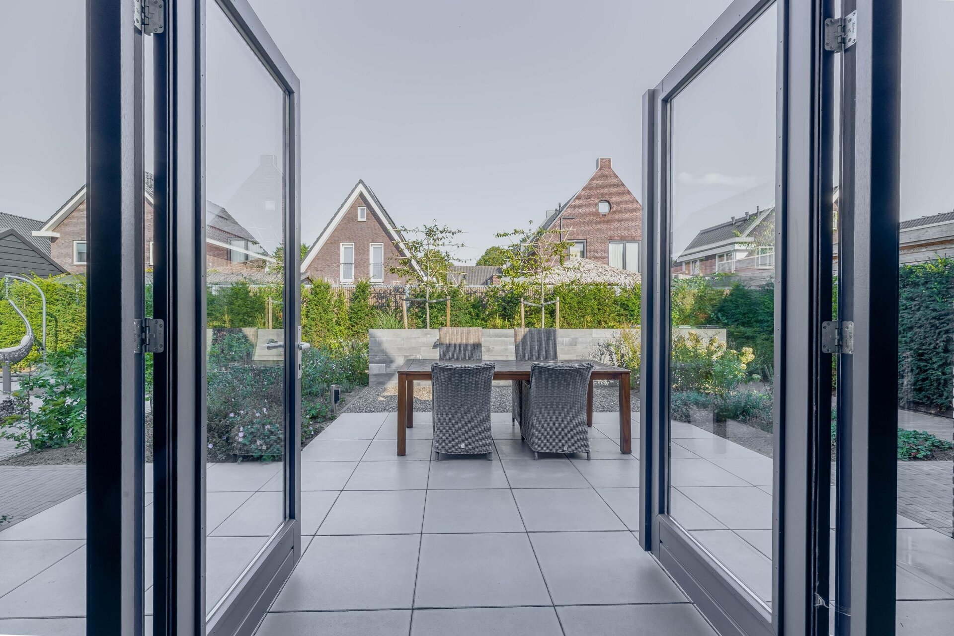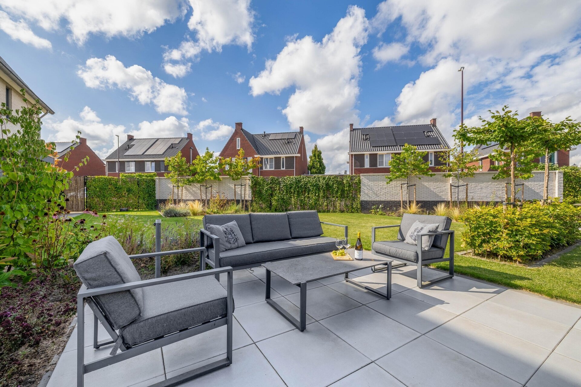 De tuin is modern aangelegd met meerdere terrassen, een strak gazon en volwassen beplanting. Er staat geen aparte berging in de tuin, maar dankzij de aangebouwde garage heb je voldoende praktische opbergruimte. De brede oprit biedt plaats aan circa vier auto’s op eigen terrein.