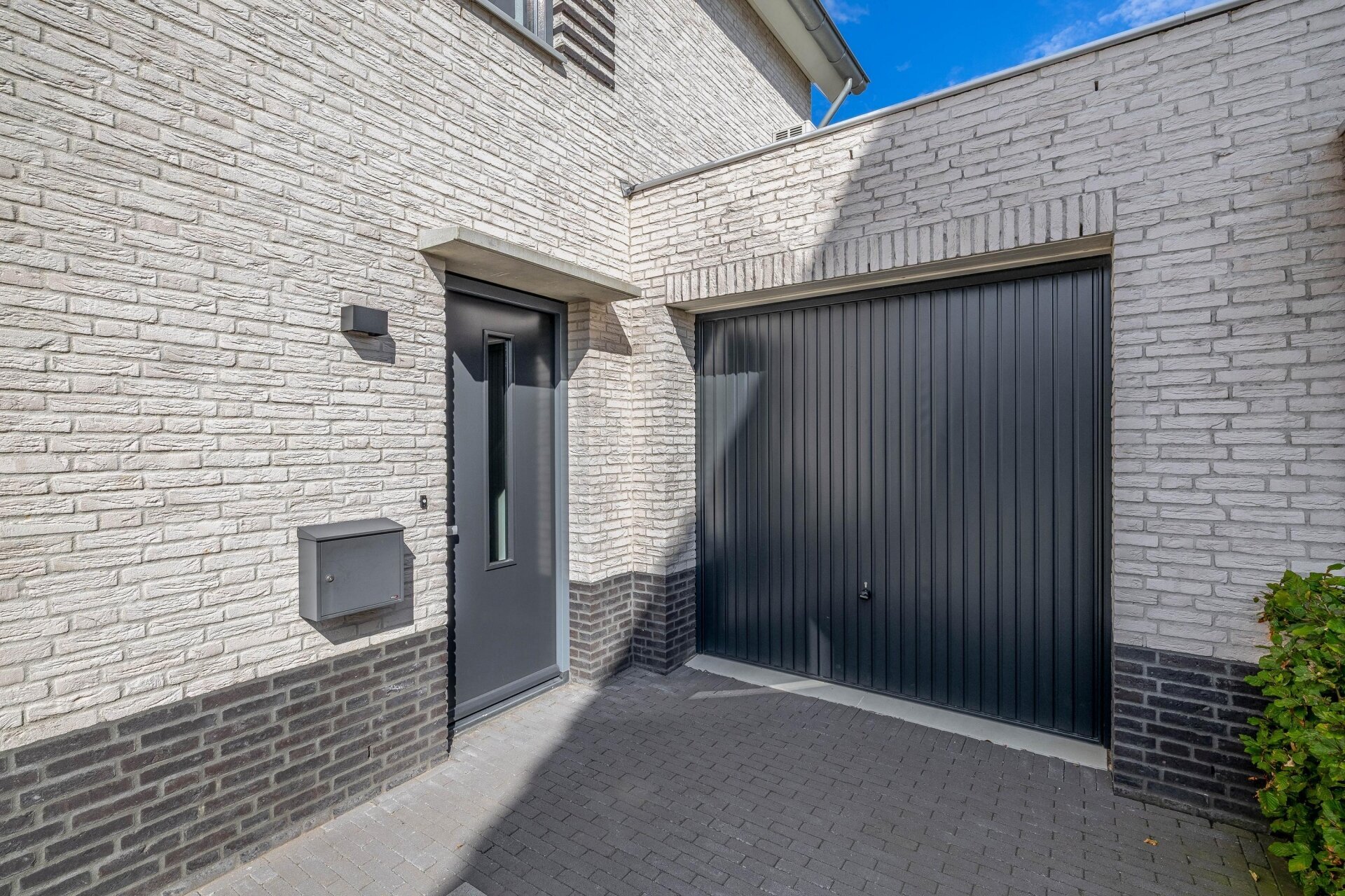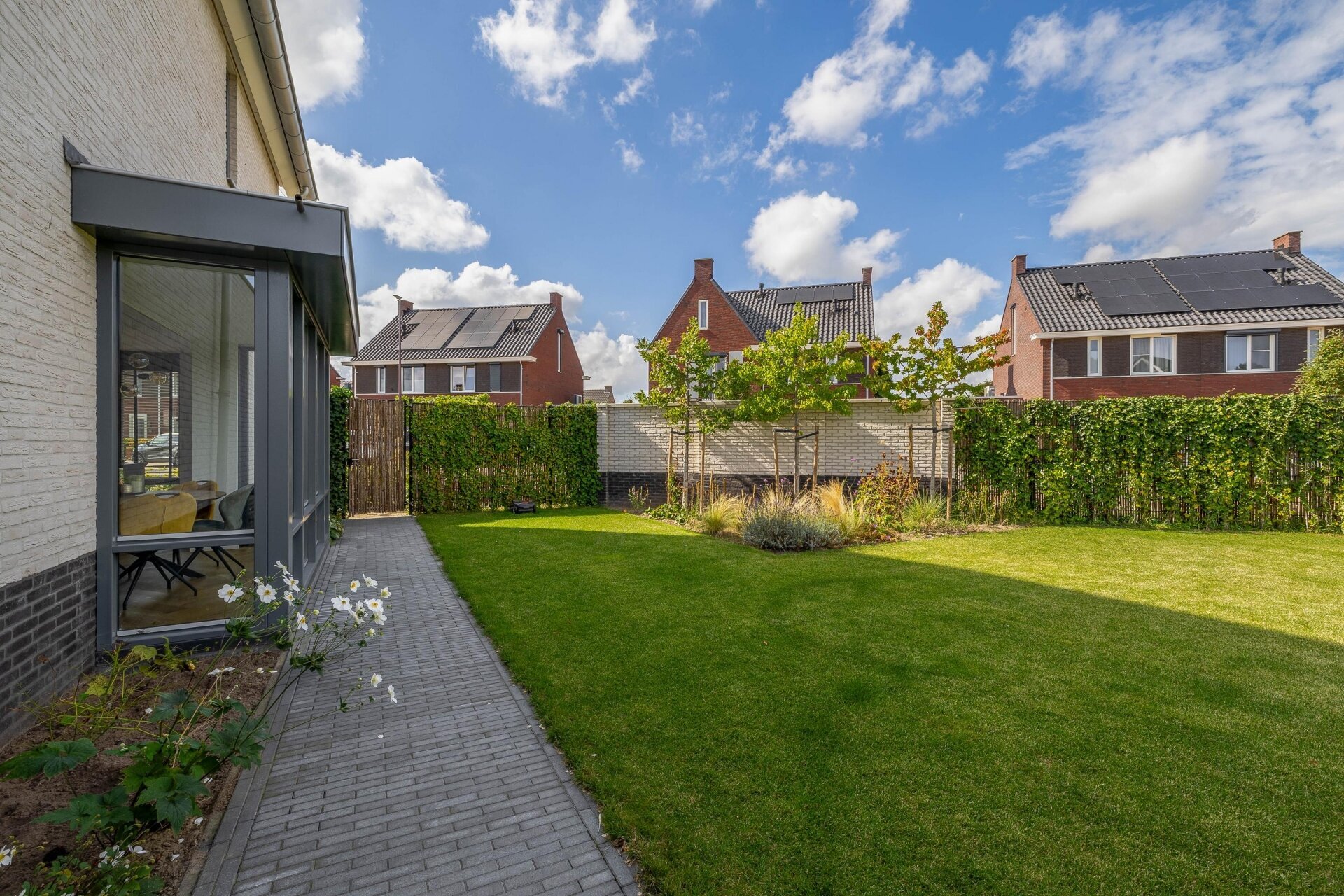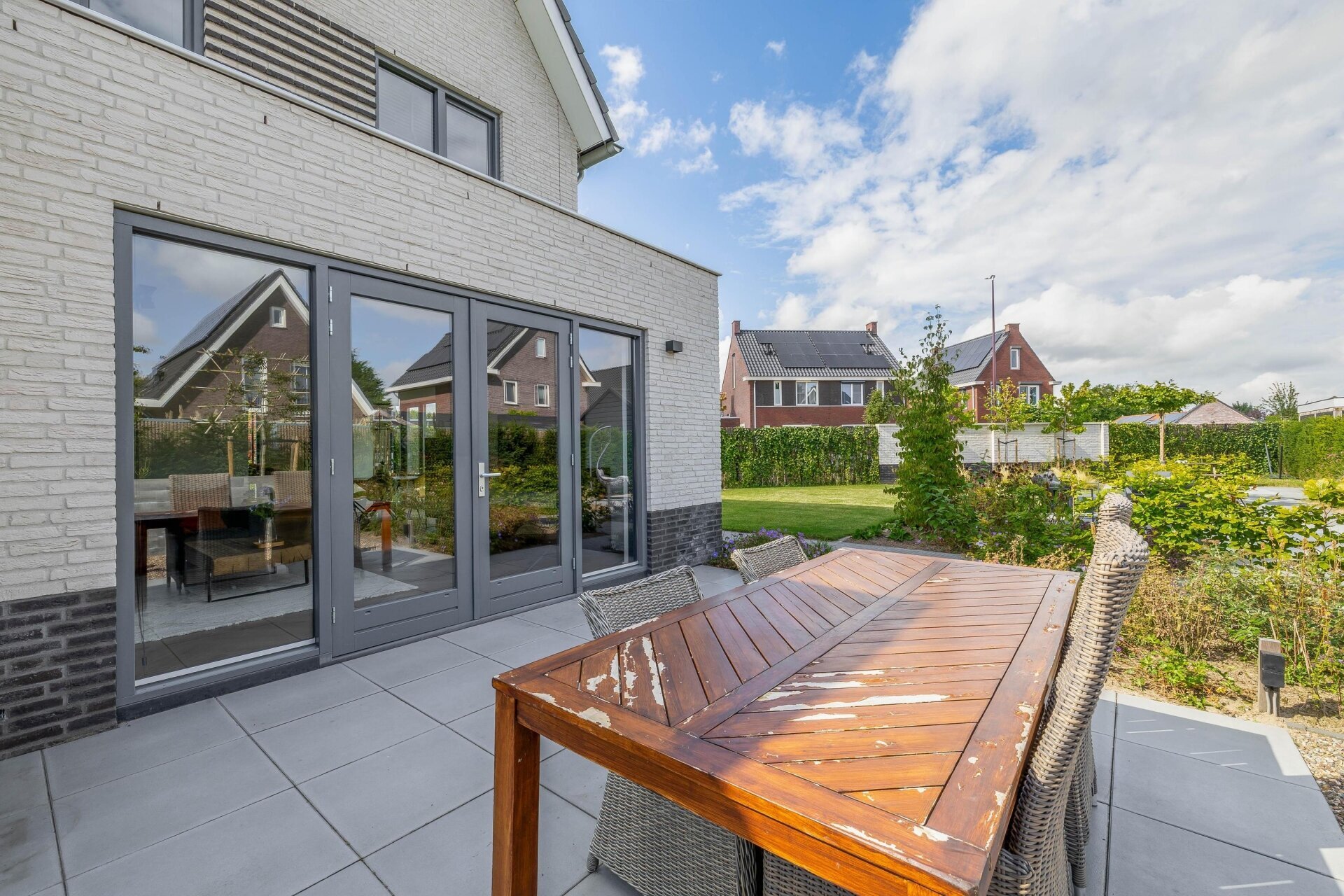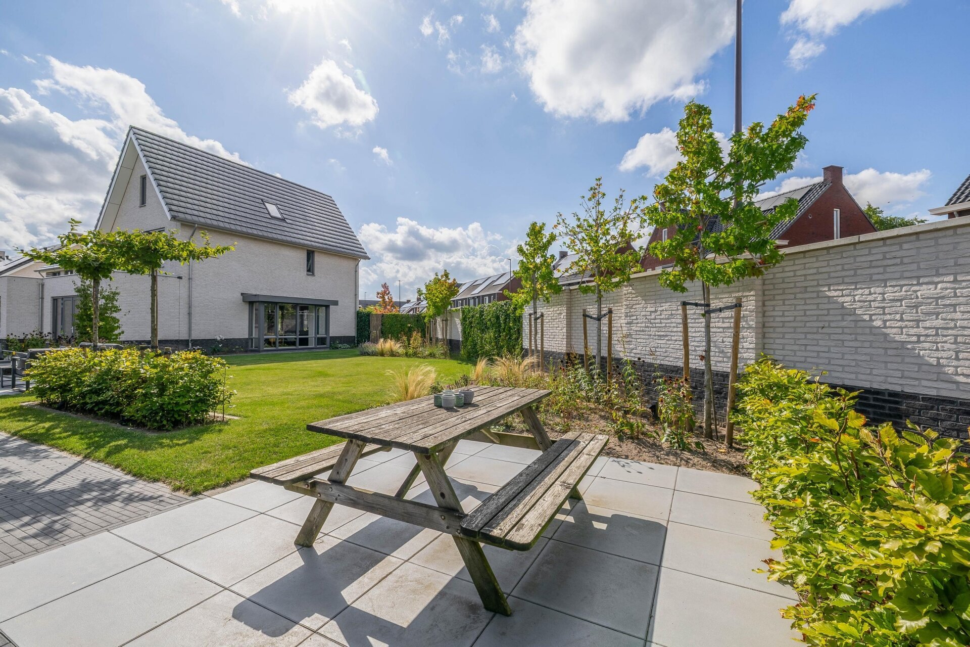 De tuin is modern aangelegd met meerdere terrassen, een strak gazon en volwassen beplanting. Er staat geen aparte berging in de tuin, maar dankzij de aangebouwde garage heb je voldoende praktische opbergruimte. De brede oprit biedt plaats aan circa vier auto’s op eigen terrein.