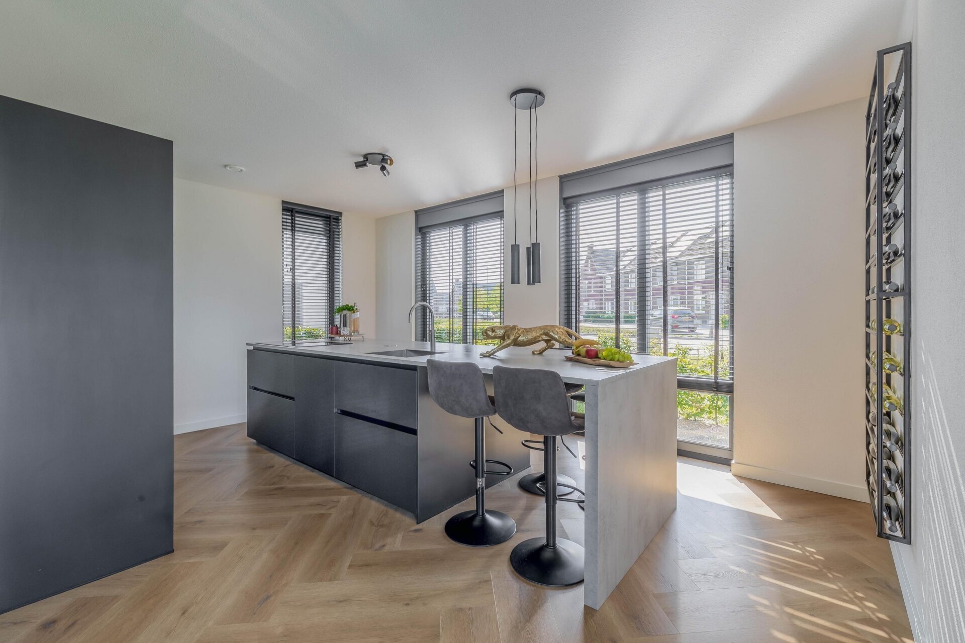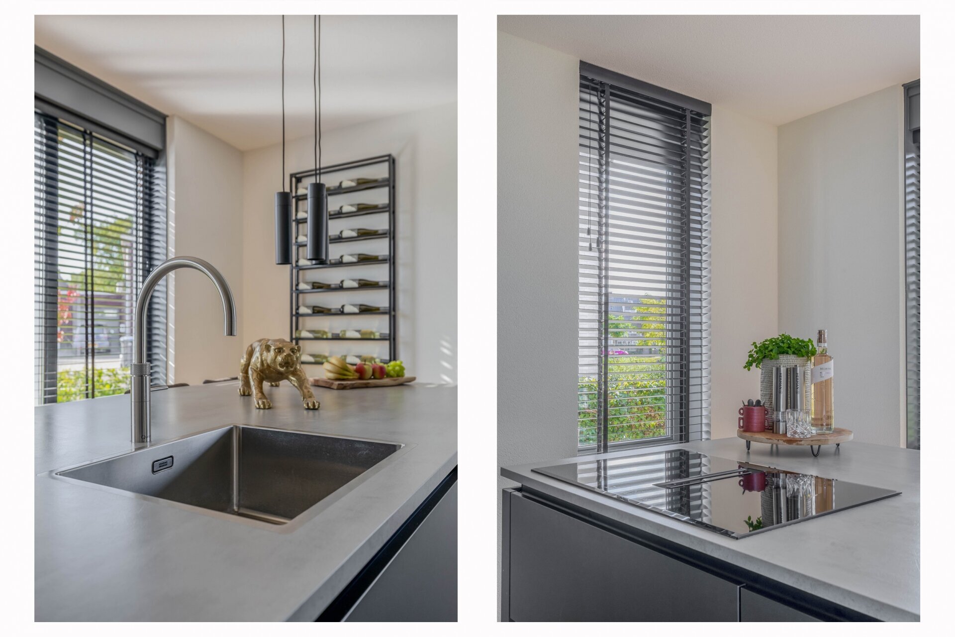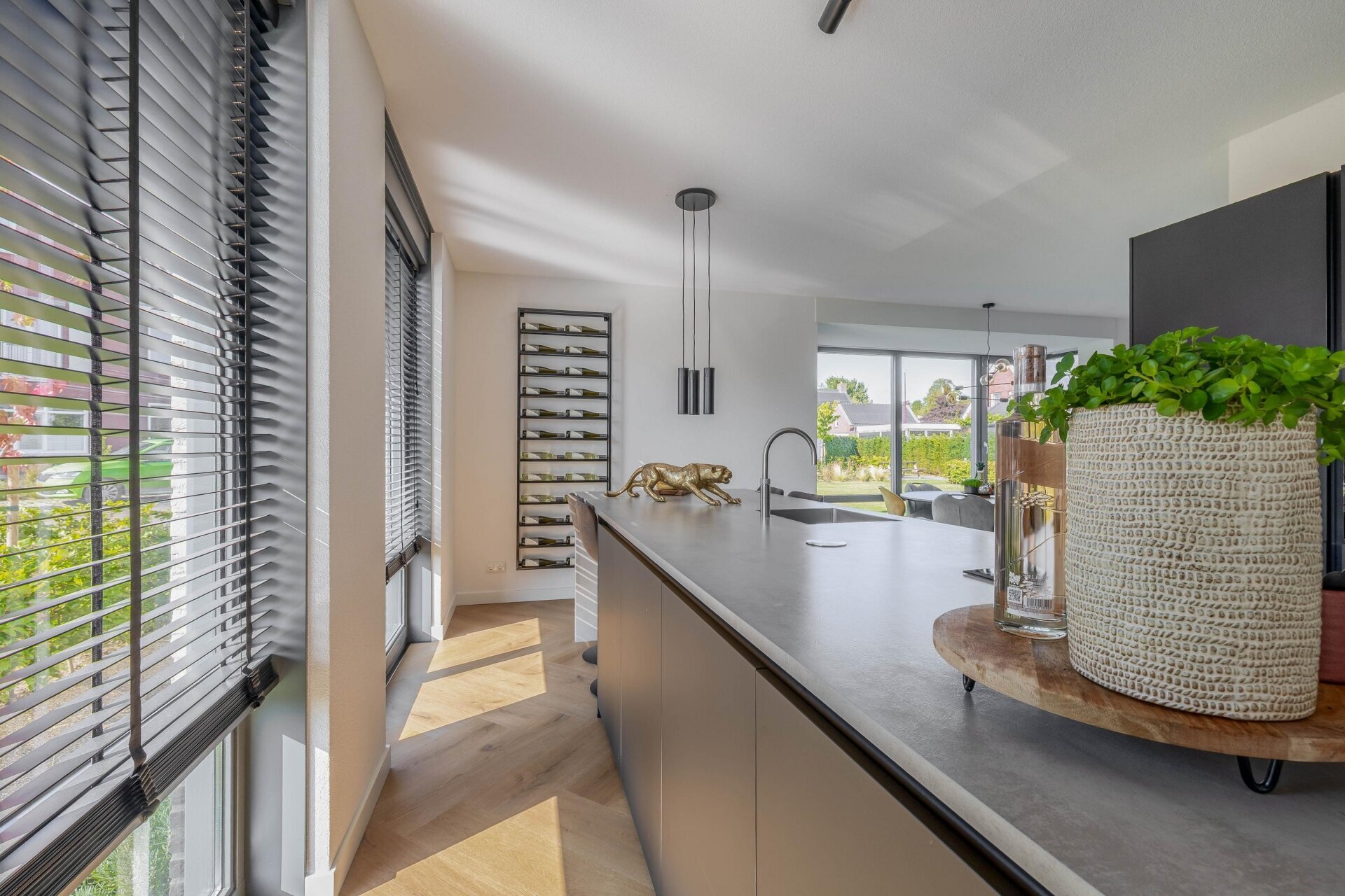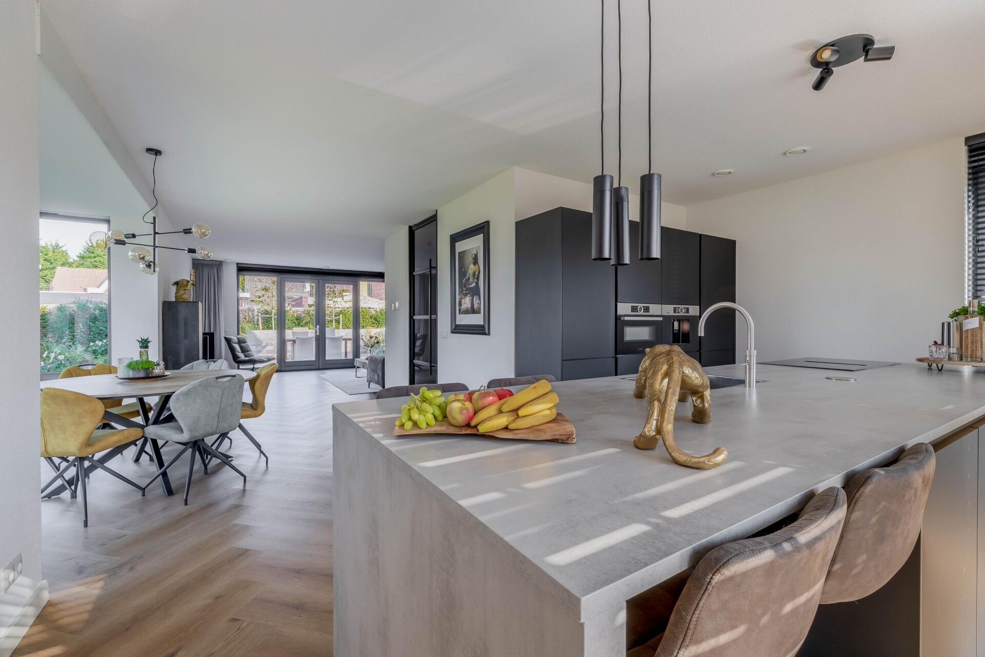 Aan de voorzijde van het huis vind je de luxe open keuken met een royaal kookeiland. De afwerking is modern en strak, met matte zwarte kasten en hoogwaardige inbouwapparatuur, waaronder een inductiekookplaat met geïntegreerde afzuiging, combi-oven, koelkast, vriezer, quooker en een volautomatisch koffiesysteem. Een droomkeuken voor elke kookliefhebber.