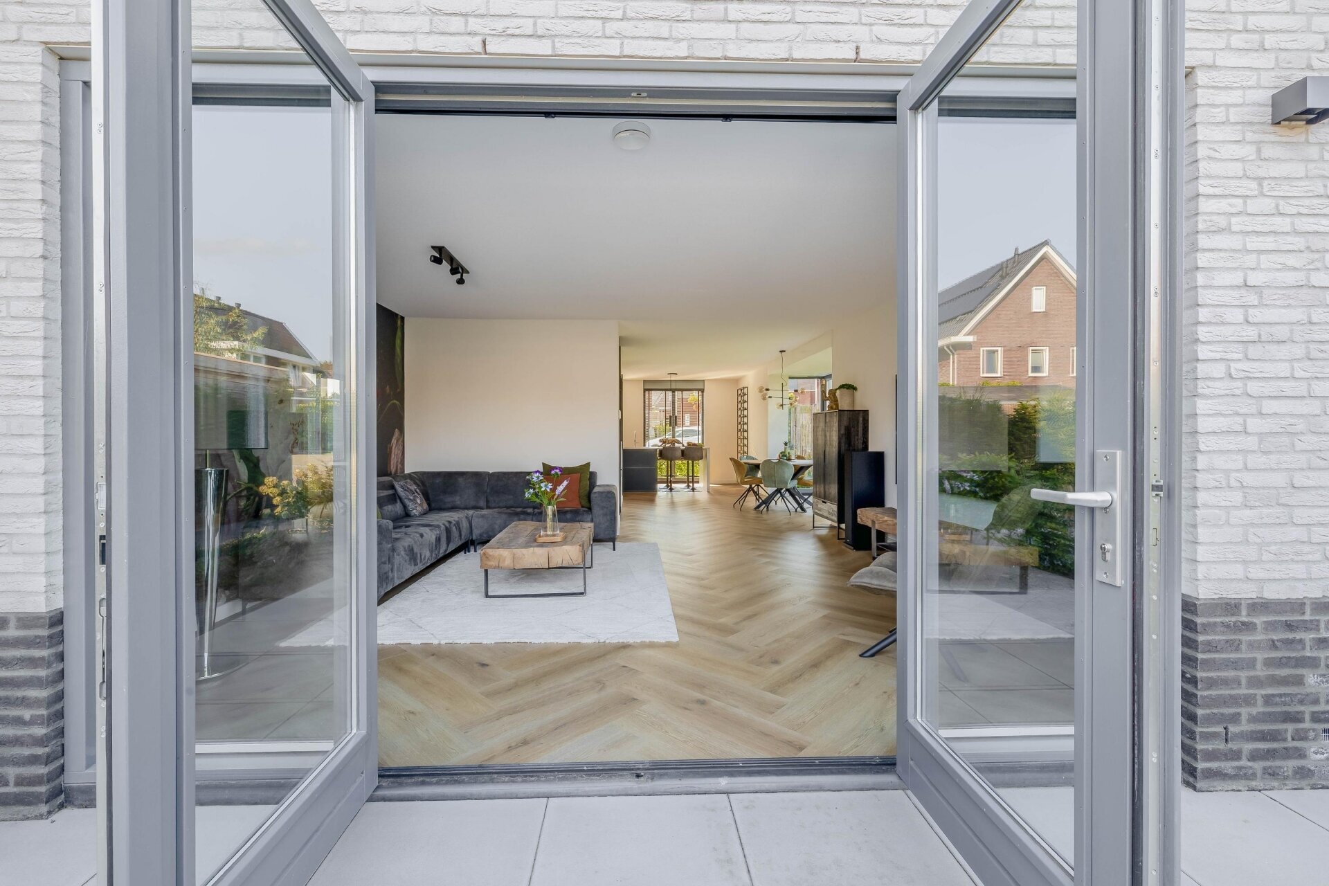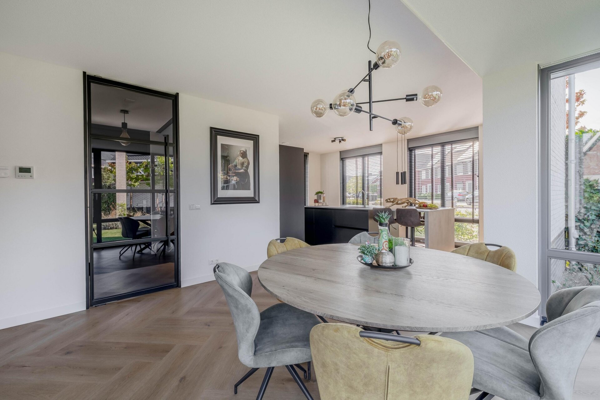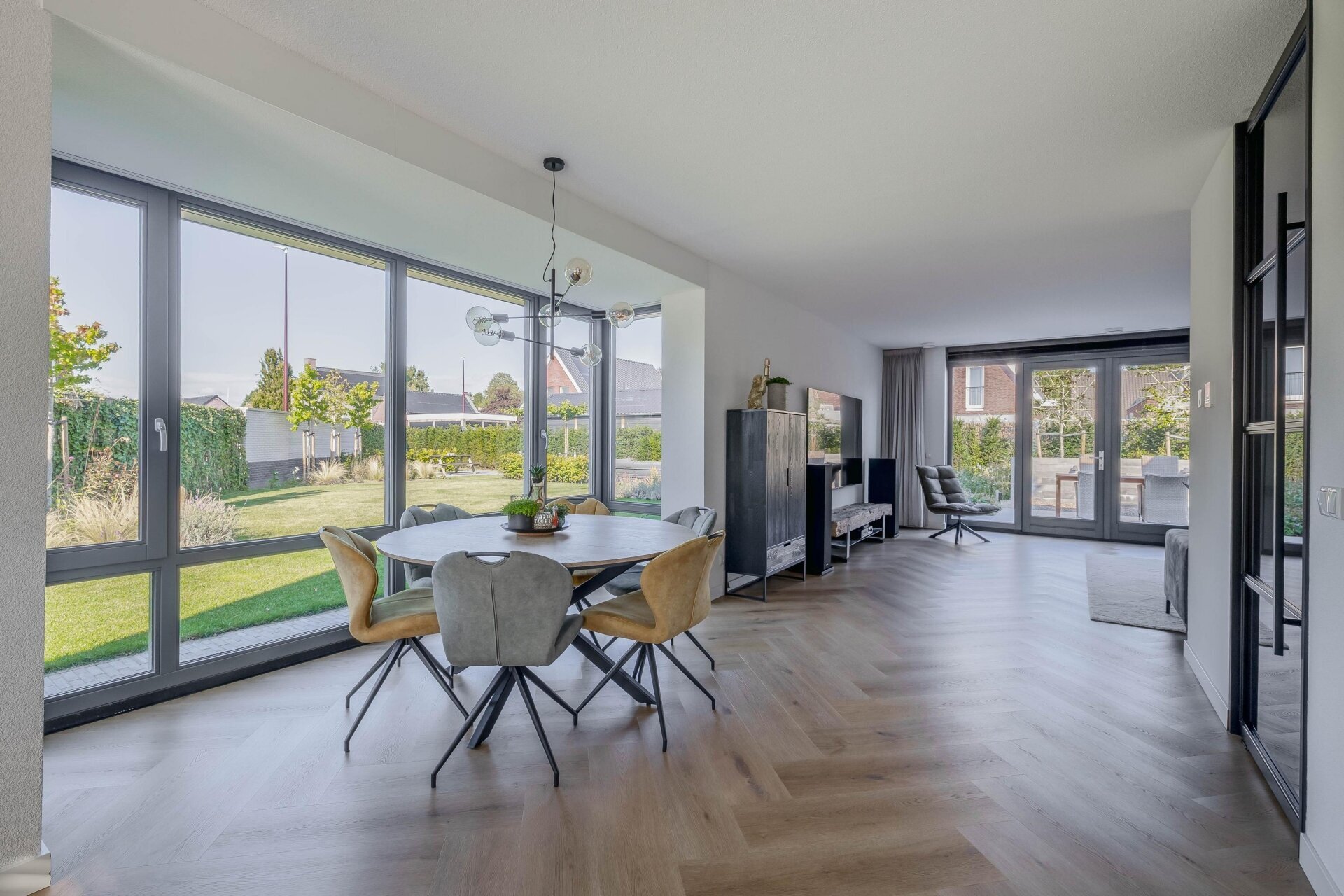 Binnenkomend in de ruime hal valt meteen de stijlvolle afwerking op: gestuukte wanden, een visgraat pvc-vloer en zwarte stalen binnendeuren. De woonkamer is tuingericht, met openslaande deuren naar het terras. Dankzij de grote raampartijen komt er volop natuurlijk licht binnen.
