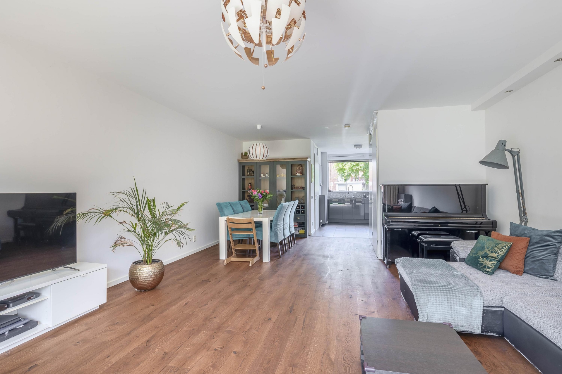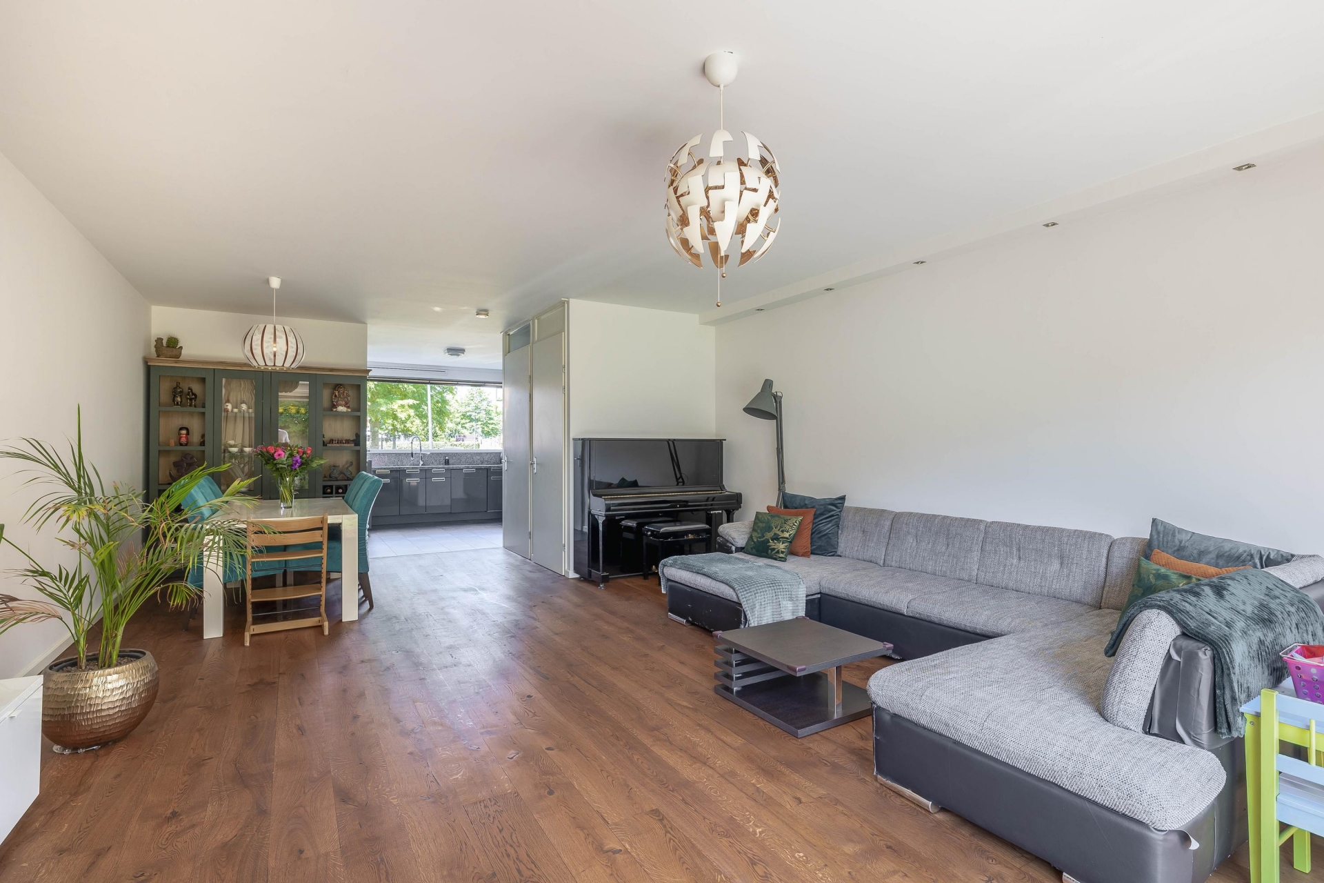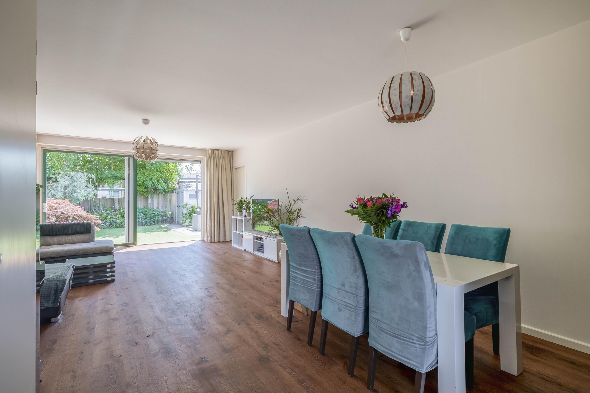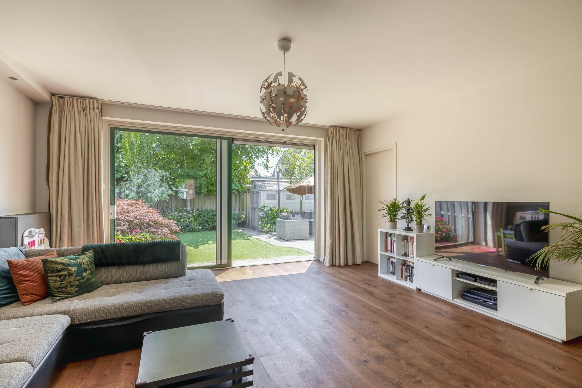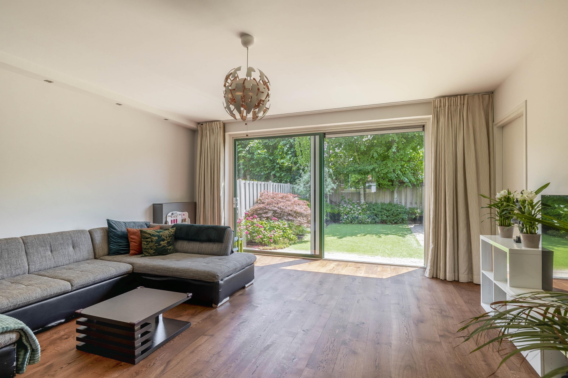 De lichte, uitgebouwde woonkamer is voorzien van een trapkast en een schuifpui naar de zonnige achtertuin op het zuidoosten. Vanuit de woonkamer is er toegang tot een multifunctionele zijkamer (momenteel garderobe-/werkkamer) en aansluitend de garage met handmatige garagedeur.