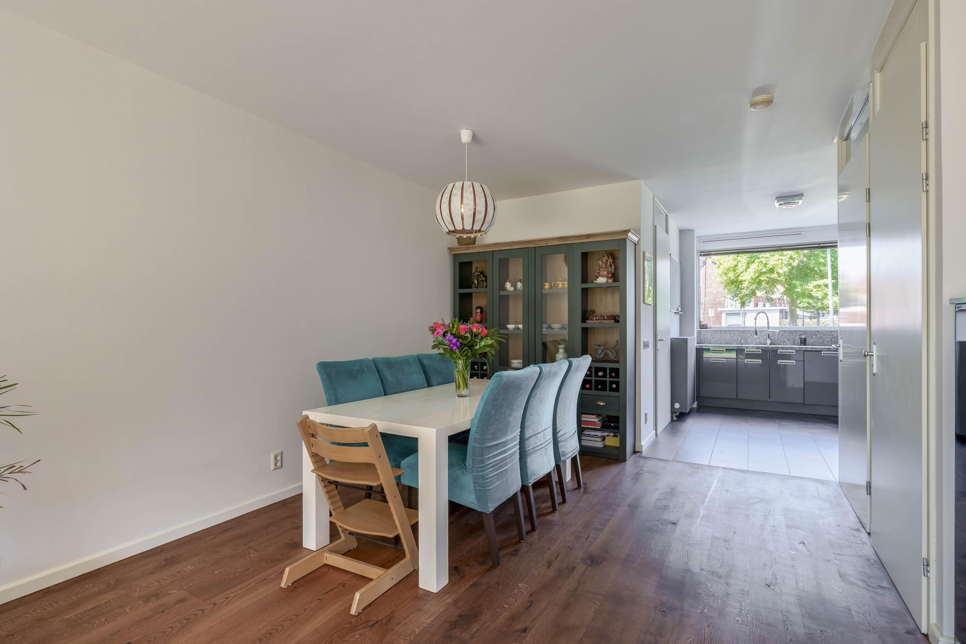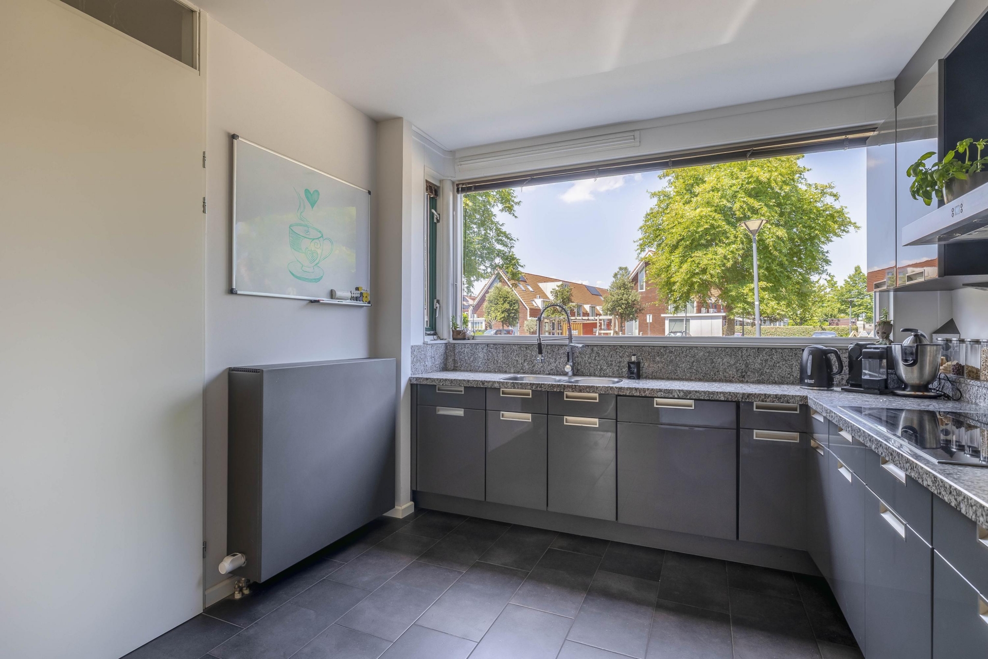 Ruime hal met garderobe, meterkast (stadsverwarming) en luxe toiletruimte met fontein (2025). Aan de voorzijde bevindt zich de open keuken in L-opstelling, uitgevoerd met een natuurstenen werkblad en compleet met een vaatwasser, 5 pits inductie kookplaat, afzuigschouw, koel-vriescombinatie, stoomoven, en combi-oven.