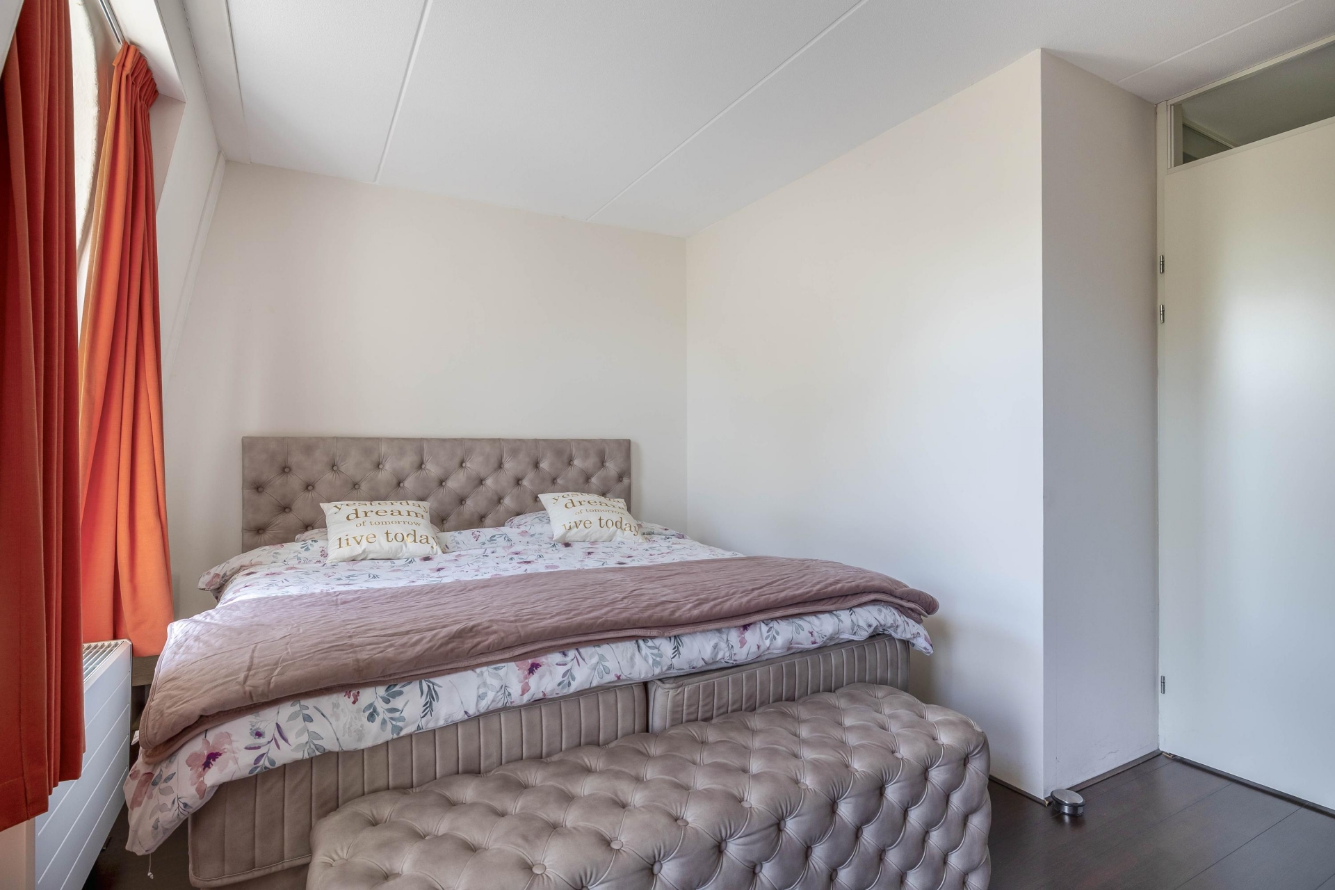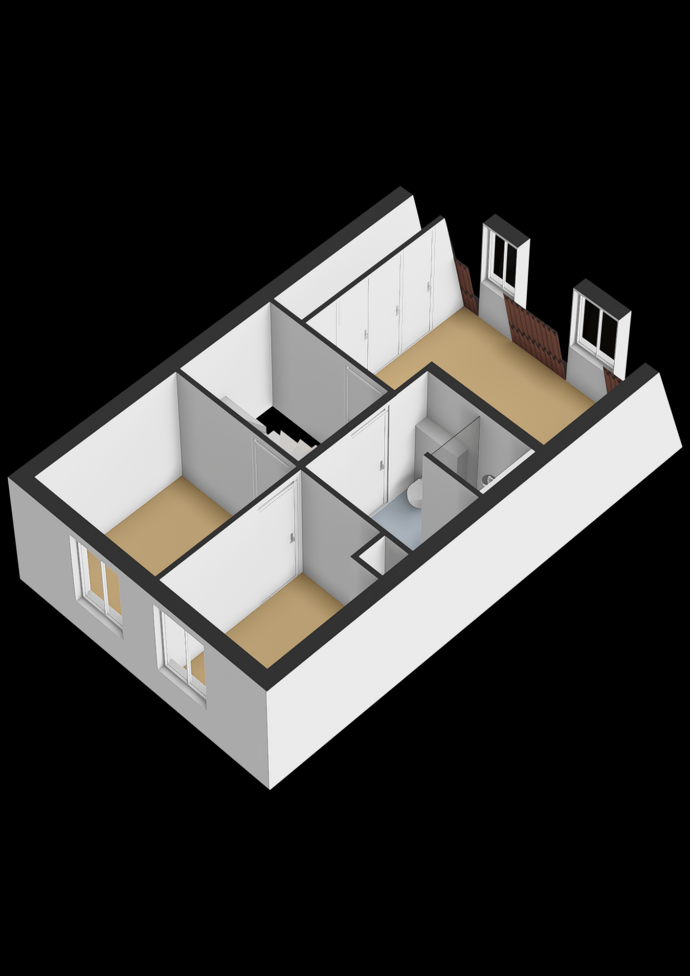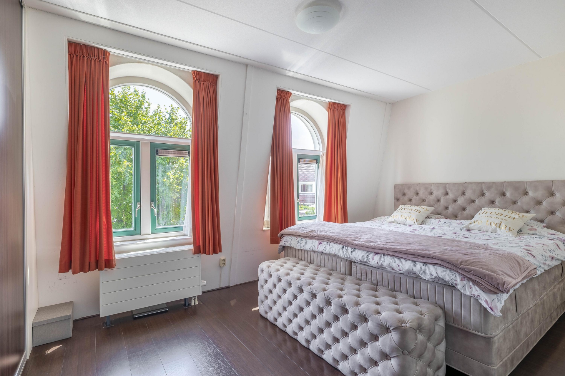 Overloop met toegang tot de diverse vertrekken. Ruime master bedroom aan de achterzijde met schuifkastenwand. Moderne badkamer (2025) met dubbel wastafelmeubel, inloopdouche, tweede toilet, handdoekradiator en elektrische verwarming. Aan de voorzijde bevindt zich de tweede slaapkamer welke toegang tot de derde slaapkamer.