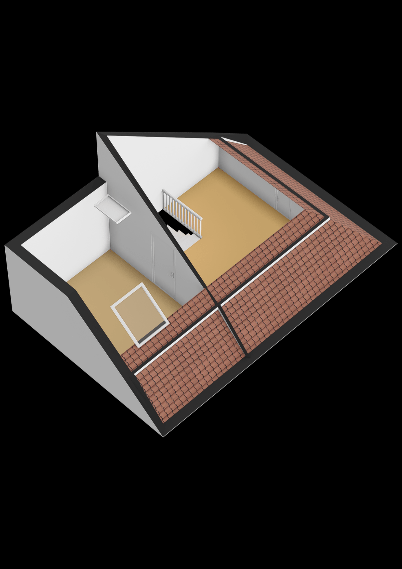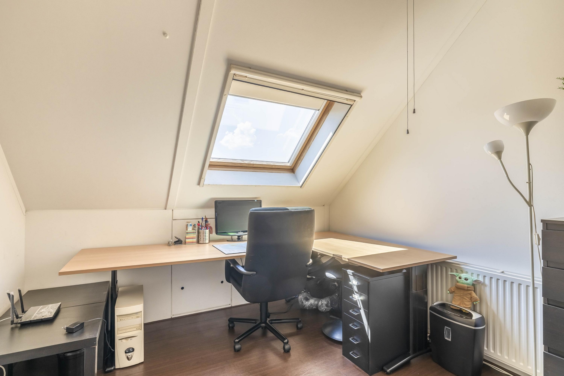 Voorzolder met wasmachine- en drogeraansluitingen en knieschotten voor extra bergruimte. Ruime slaapkamer aan de voorzijde (momenteel in gebruik als kantoor) met eveneens een Velux dakraam en toegang tot de bergvliering.