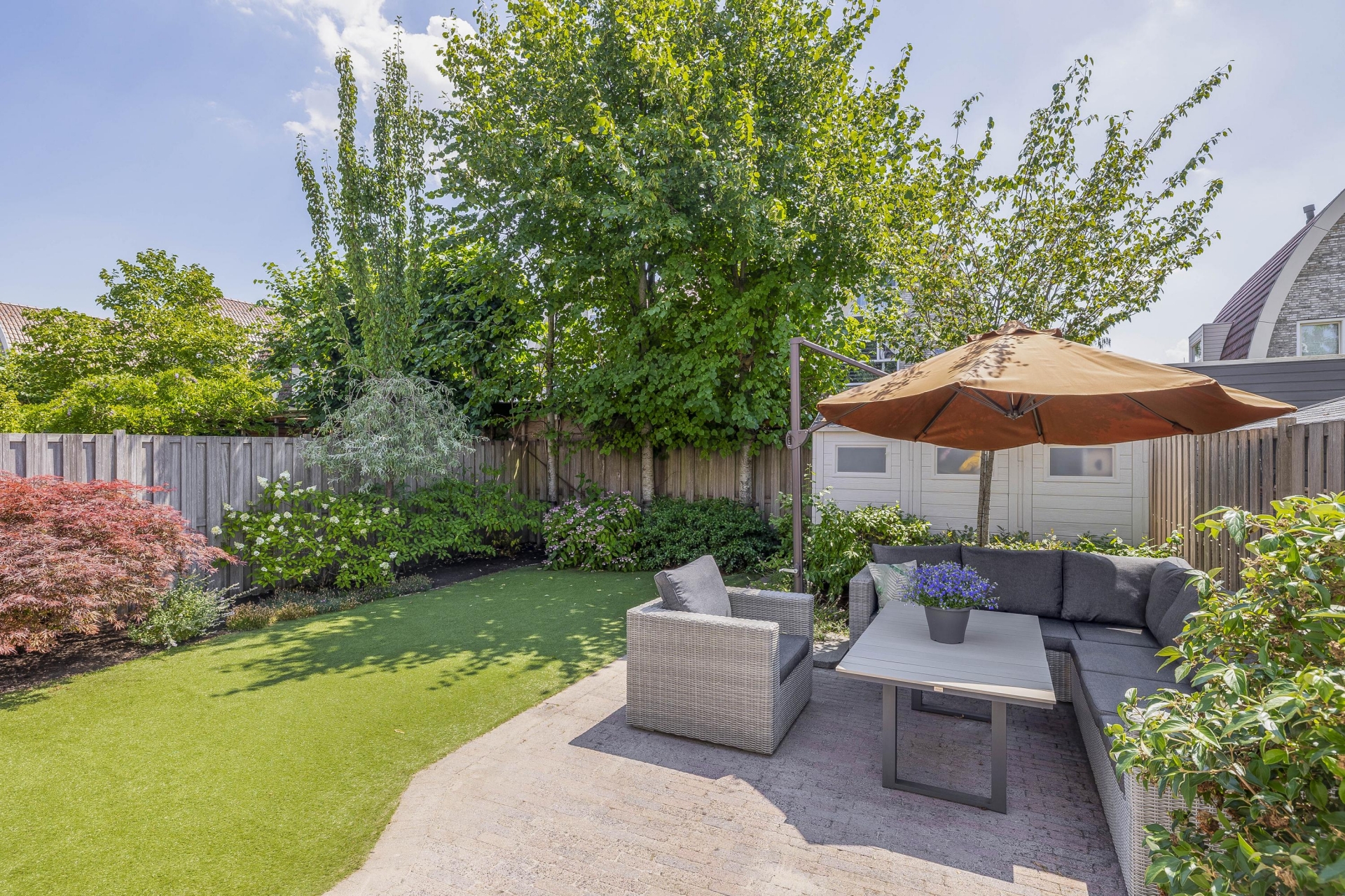 De achtertuin beschikt over een elektrisch zonnescherm en een kunststof blokhut. Dankzij de royale afmetingen van de achtertuin kunt u de hele dag kiezen voor een heerlijke plek in de zon of juist in de schaduw.
