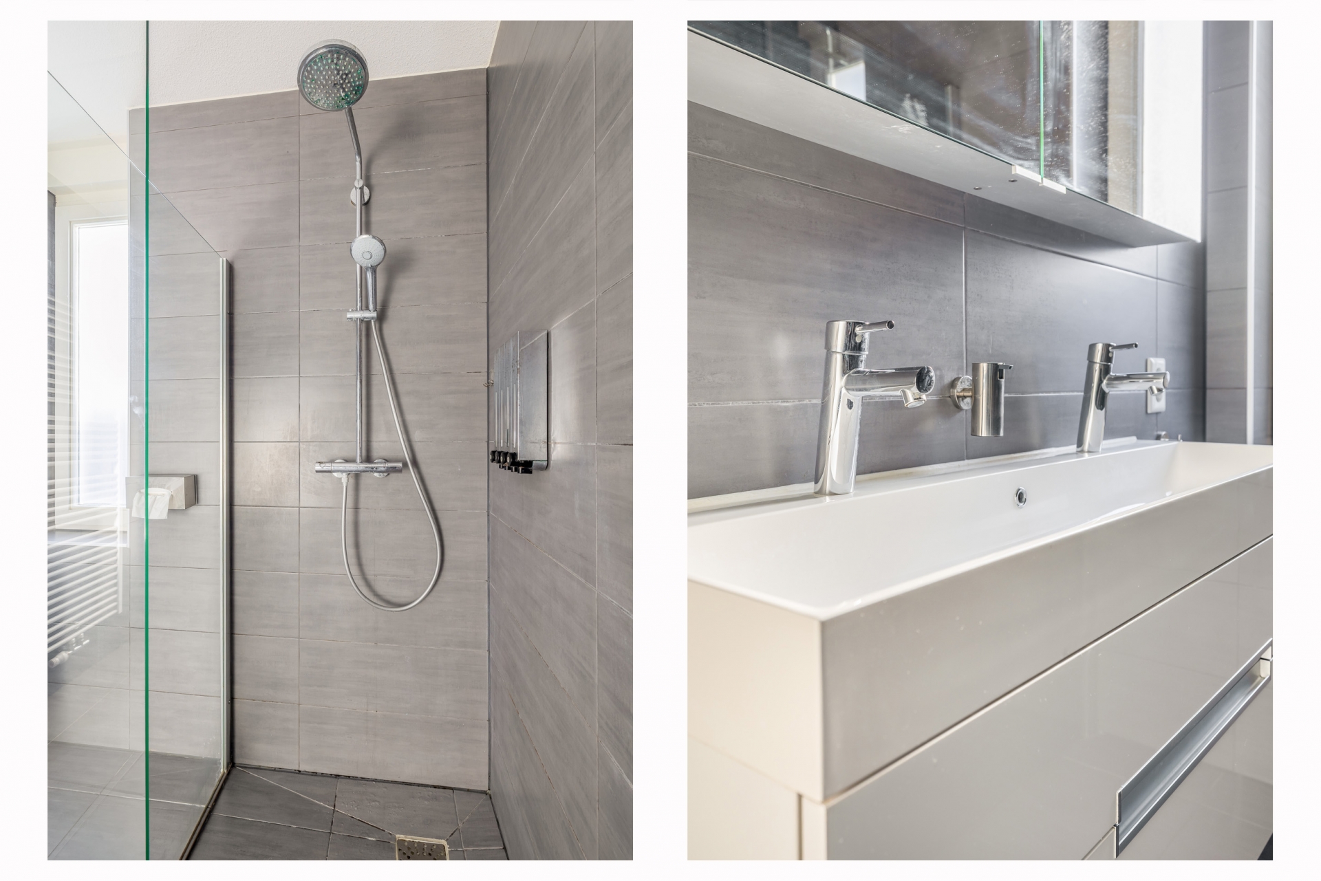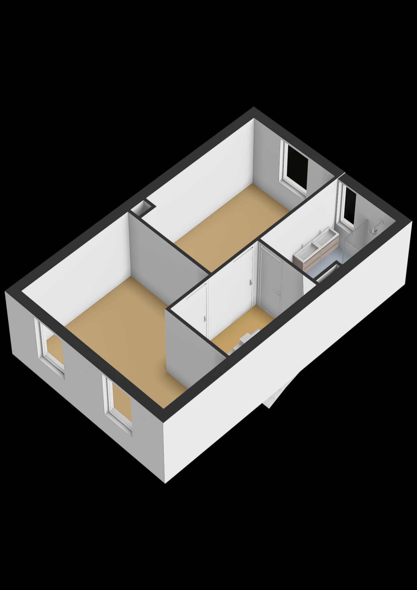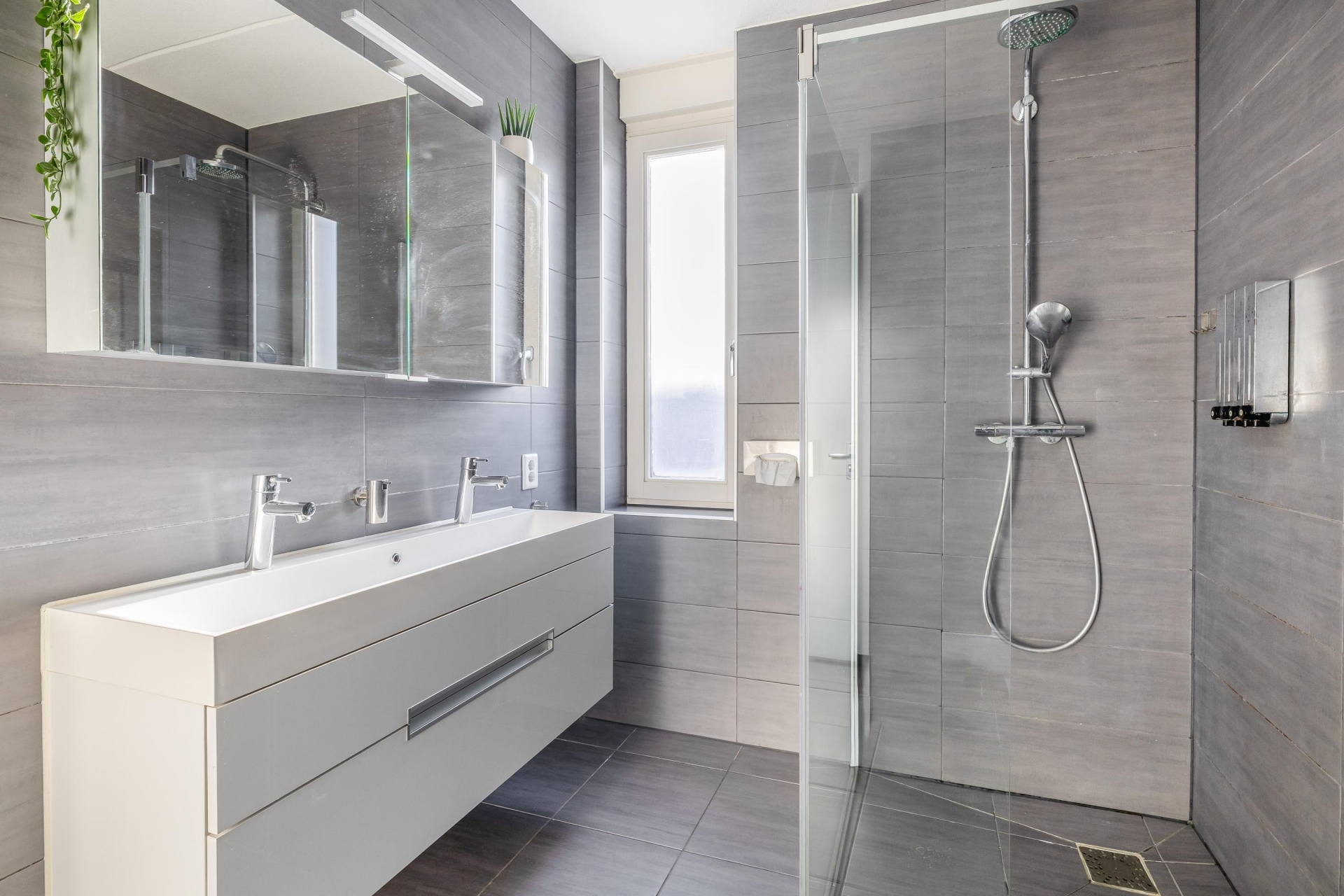 Op de eerste verdieping vind je een royale master bedroom aan de voorzijde, welke mogelijk op te delen is in twee kamers, en een tweede ruime slaapkamer aan de achterzijde, met grote ramen. Perfect als kinder-, werk- of logeerkamer. Beide slaapkamers zijn tevens voorzien van rolluiken zodat je het 's nachts (of overdag) zo donker kunt maken als je wil. De badkamer is modern ingericht met een ruime inloopdouche, dubbele wastafel en toilet.