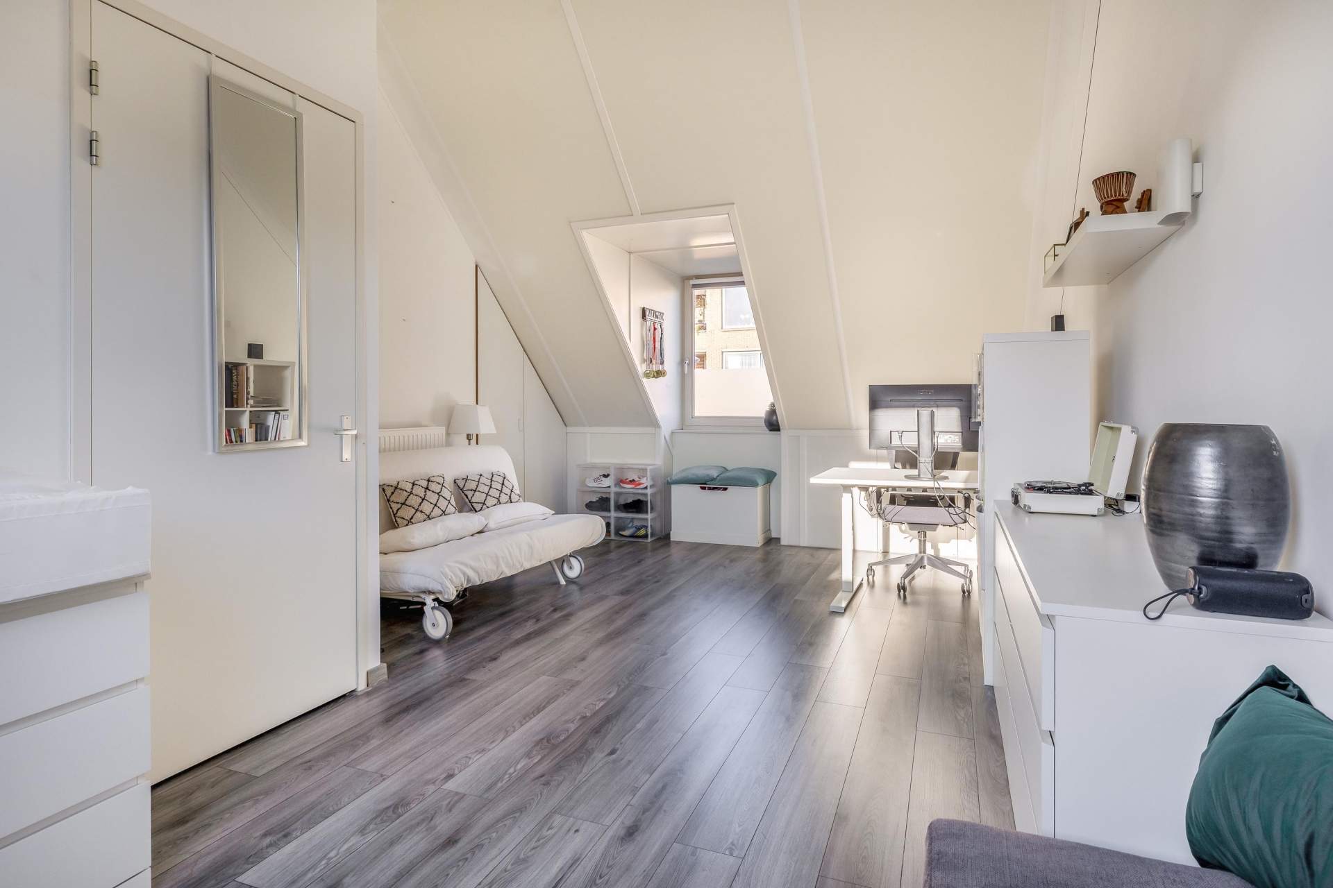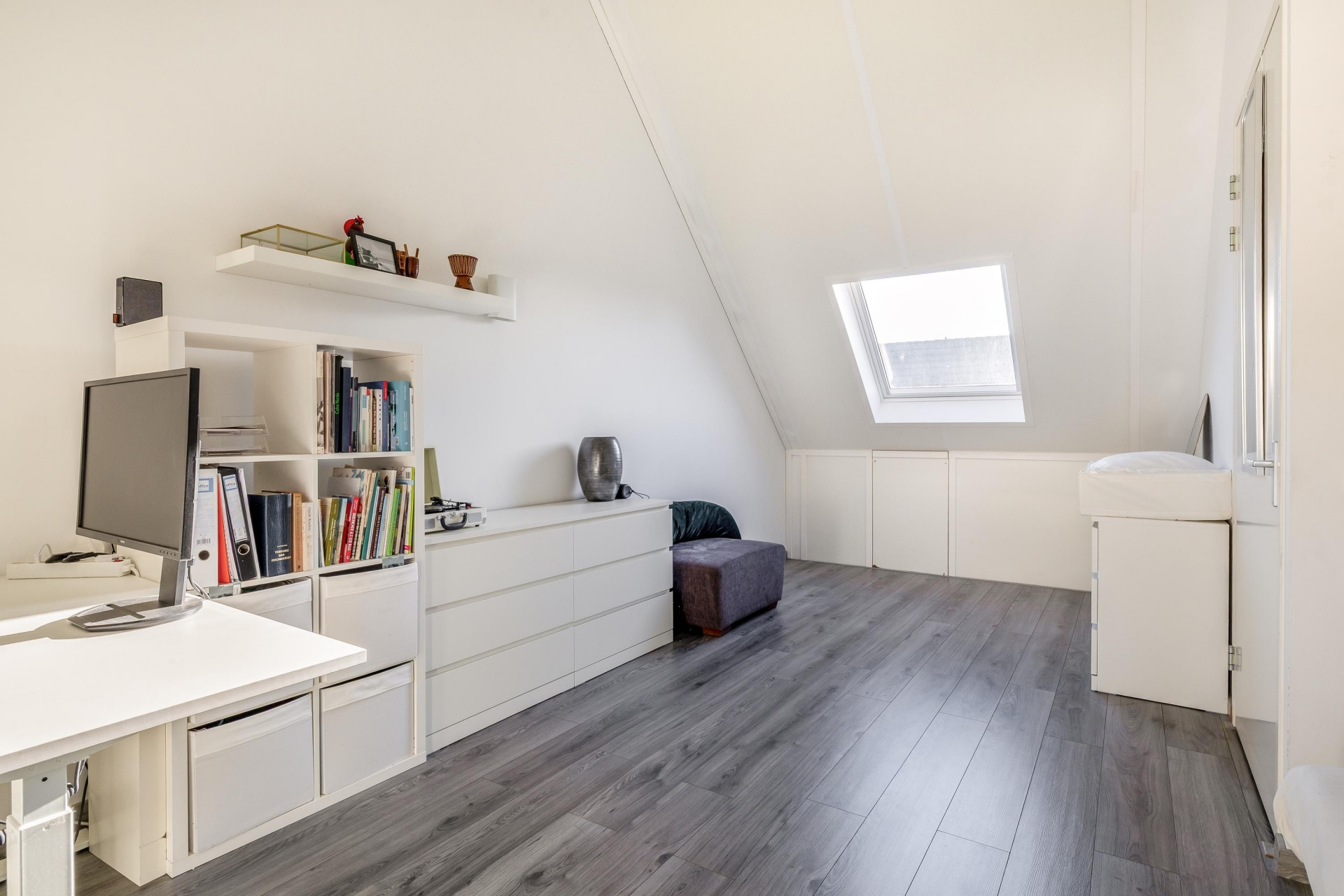 De zolderverdieping biedt een verrassend grote derde slaapkamer met een dakkapel. Deze ruimte is eventueel ook op te splitsen in twee aparte kamers. Achter de knieschotten is er veel praktische bergruimte aanwezig en de aparte wasruimte maakt het helemaal af.