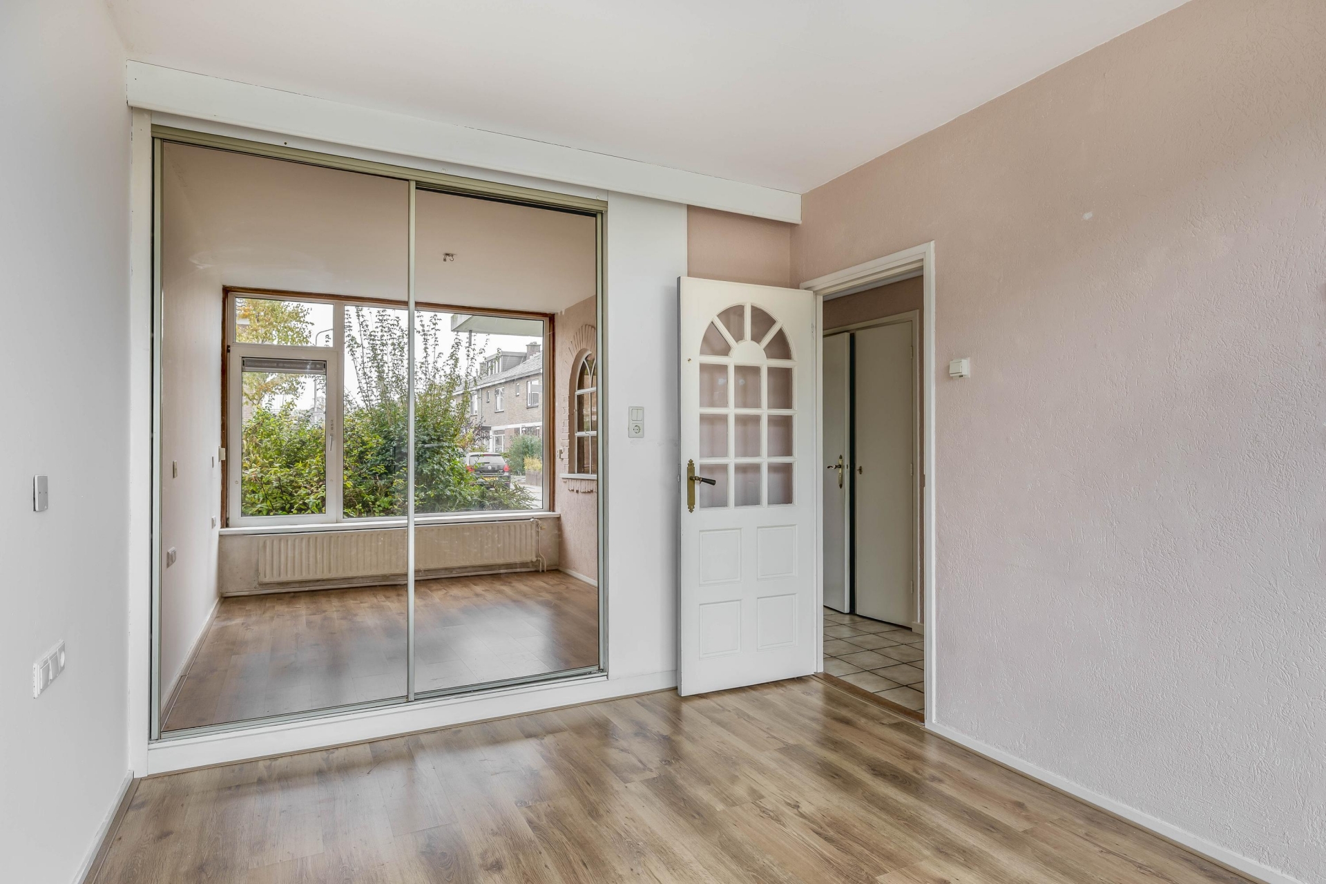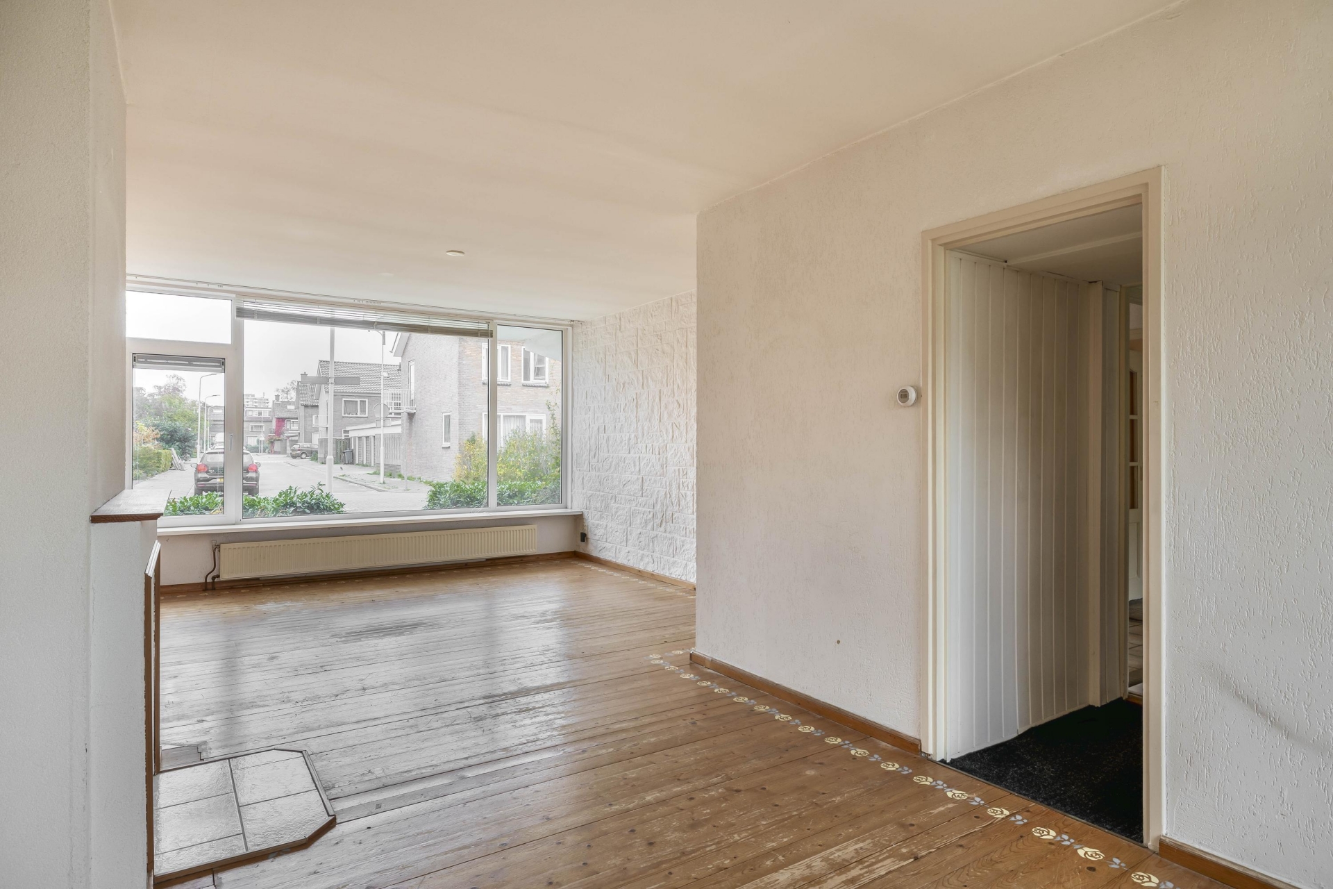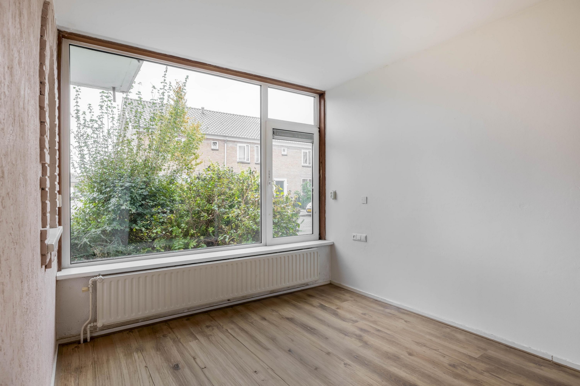 De woonkamer is heerlijk licht dankzij de grote raampartijen en biedt een fijn uitzicht op de voor en achtertuin. De indeling biedt ruimte voor zowel een gezellige zithoek als een eethoek. De sfeer is rustig en neutraal – een goede basis om naar je eigen smaak verder in te richten. Vanuit de woonkamer kijk je direct de tuin in, wat een fijne connectie geeft tussen binnen en buiten.