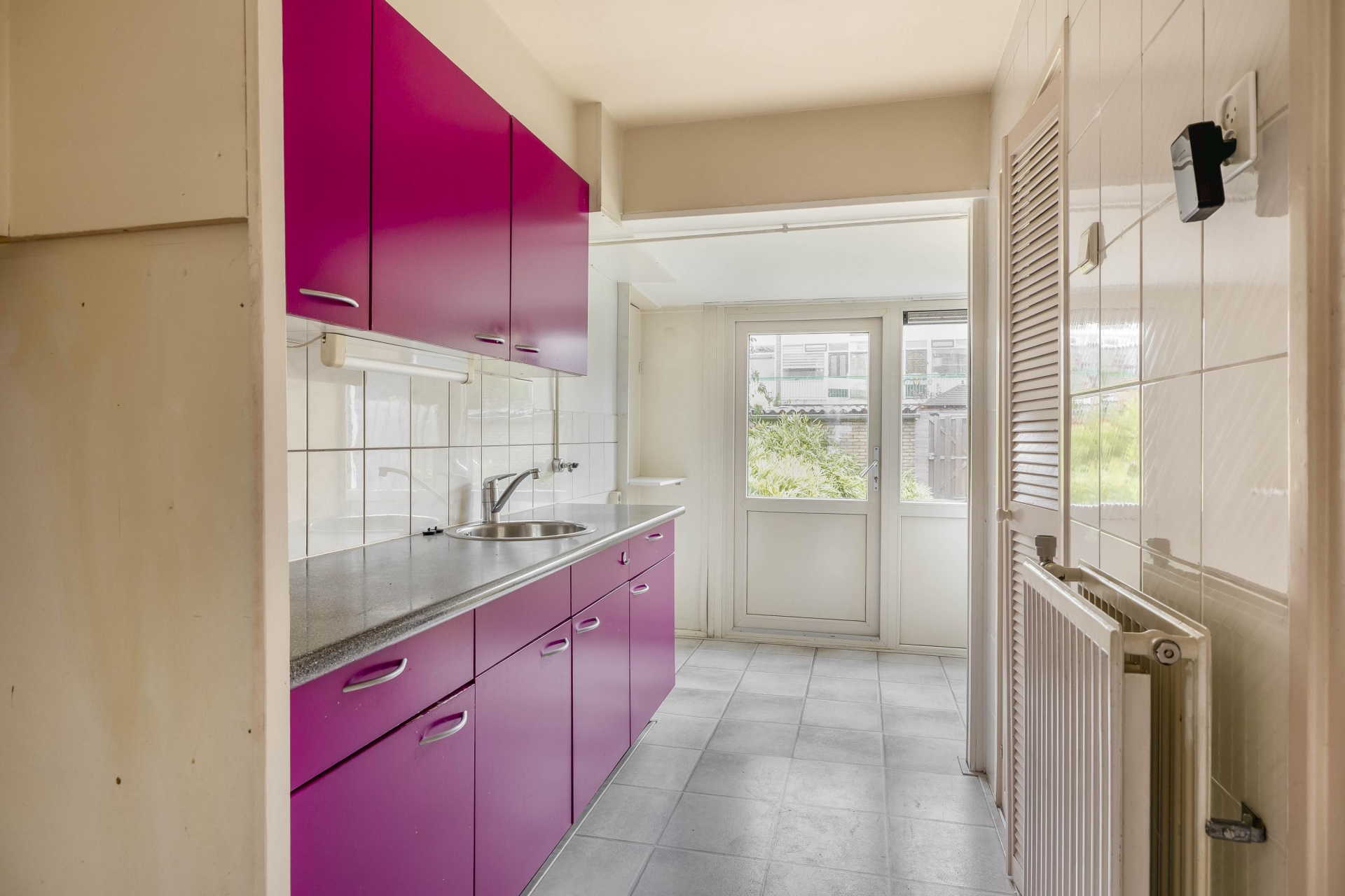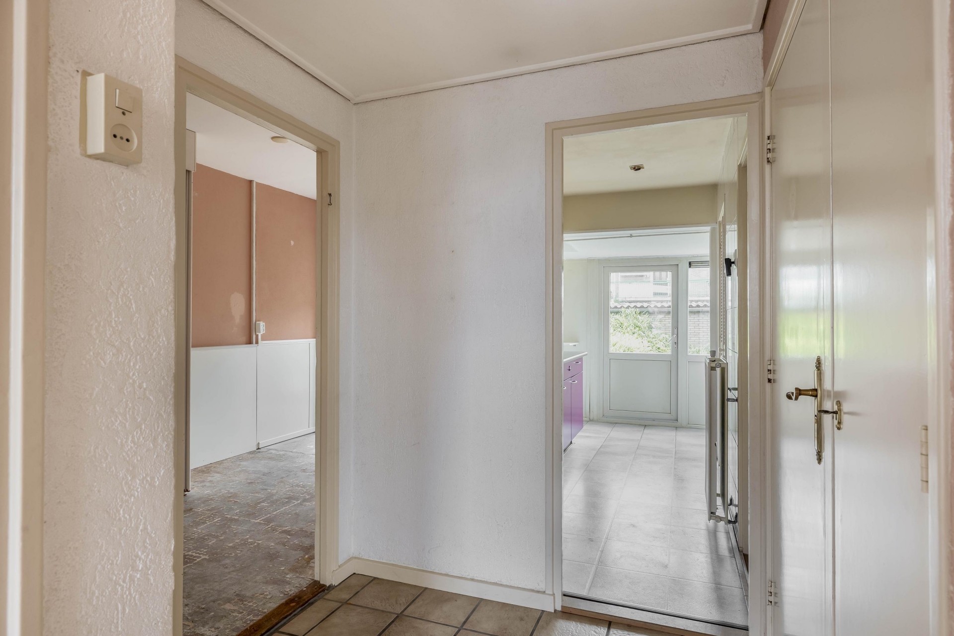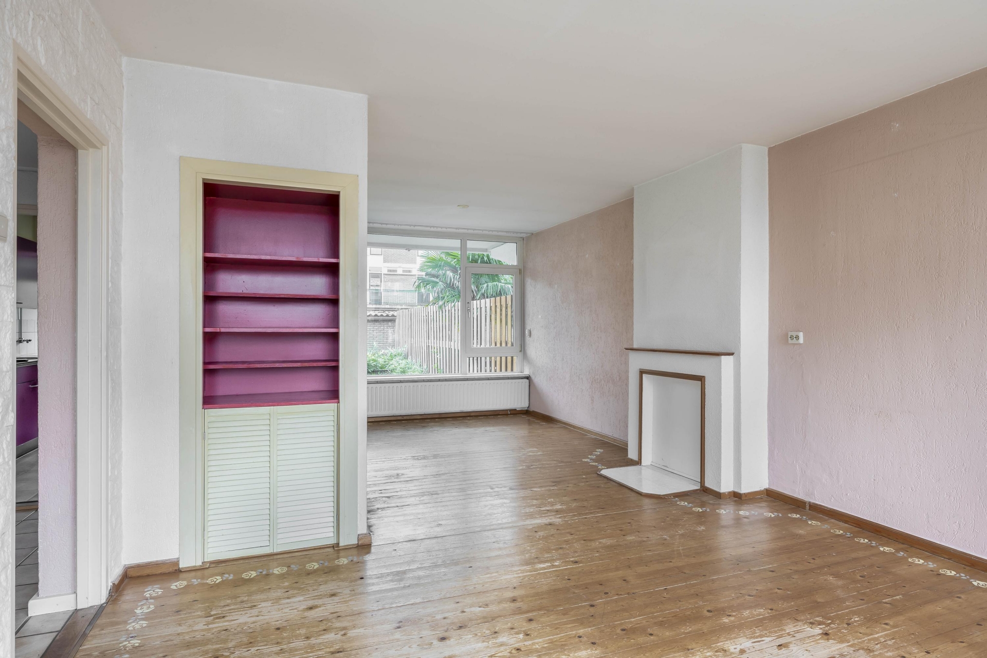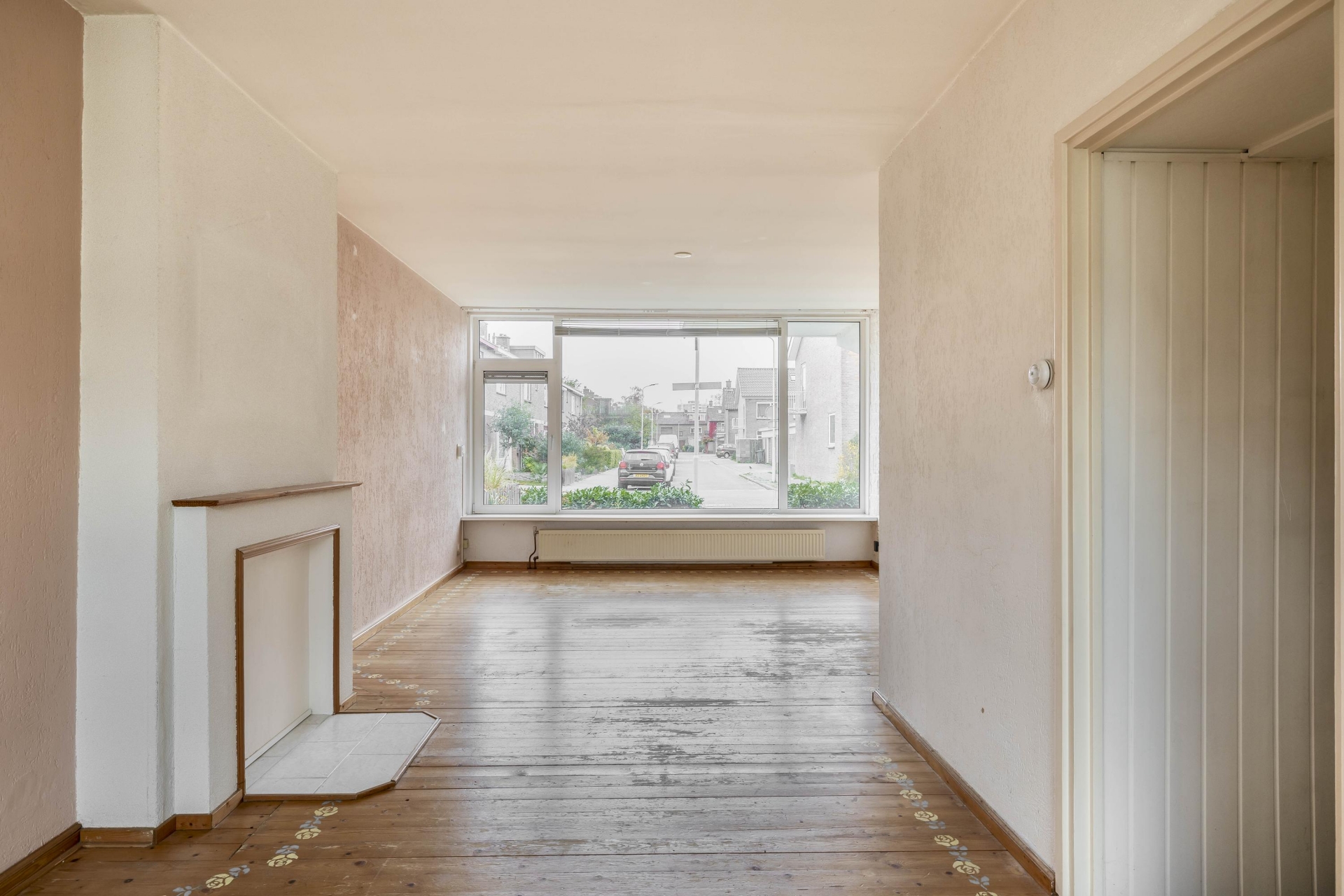 De woonkamer is heerlijk licht dankzij de grote raampartijen en biedt een fijn uitzicht op de voor en achtertuin. De indeling biedt ruimte voor zowel een gezellige zithoek als een eethoek. De sfeer is rustig en neutraal – een goede basis om naar je eigen smaak verder in te richten. Vanuit de woonkamer kijk je direct de tuin in, wat een fijne connectie geeft tussen binnen en buiten.